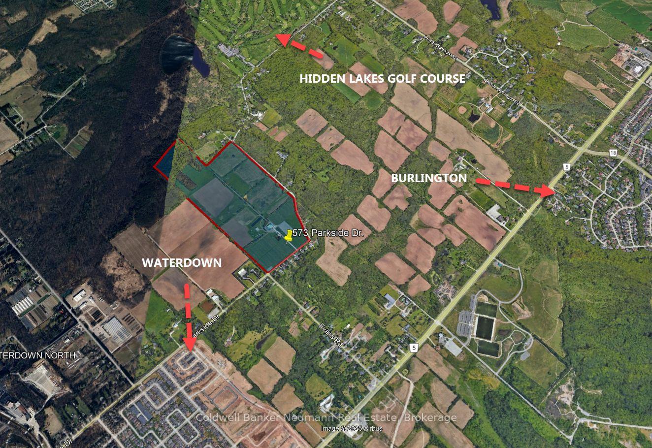 Welcome to 573 Parkside Drive! A truly rare offering with 116.5 acres of prime farmland on the outskirts of Waterdown. Featuring a 2,785 sq. ft. 2 storey brick farmhouse, and a beautiful old wood bank barn that was formerly used as a destination fruit and bake shop. This expansive property is just minutes from Burlington, Hamilton, and major commuter routes, with quick access to Hwy 6, the QEW, and the 403. Zoned A2 and P7, the land offers incredible versatility, ideal for continued agricultural use, a dream estate, horse and hobby farming, or even a wedding and event venue that takes advantage of the charming farmhouse and historic barn. The fertile acreage also supports cash crops, orchards, or farm-to-table opportunities. With steady growth in the Hamilton-Waterdown area and multiple subdivision proposals nearby, it also represents an exceptional long-term buy and hold investment (subject to approvals). Featuring established road frontage, proximity to municipal services, and surrounded by active development, 573 Parkside Drive is a one-of-a-kind opportunity that blends country charm, future potential, and unmatched location.