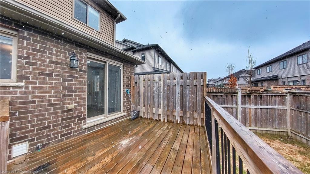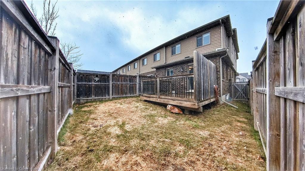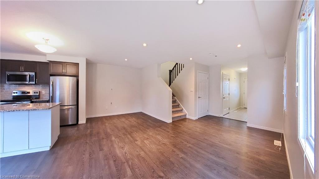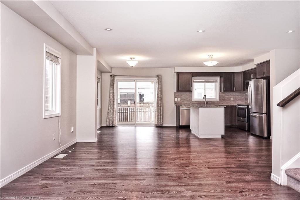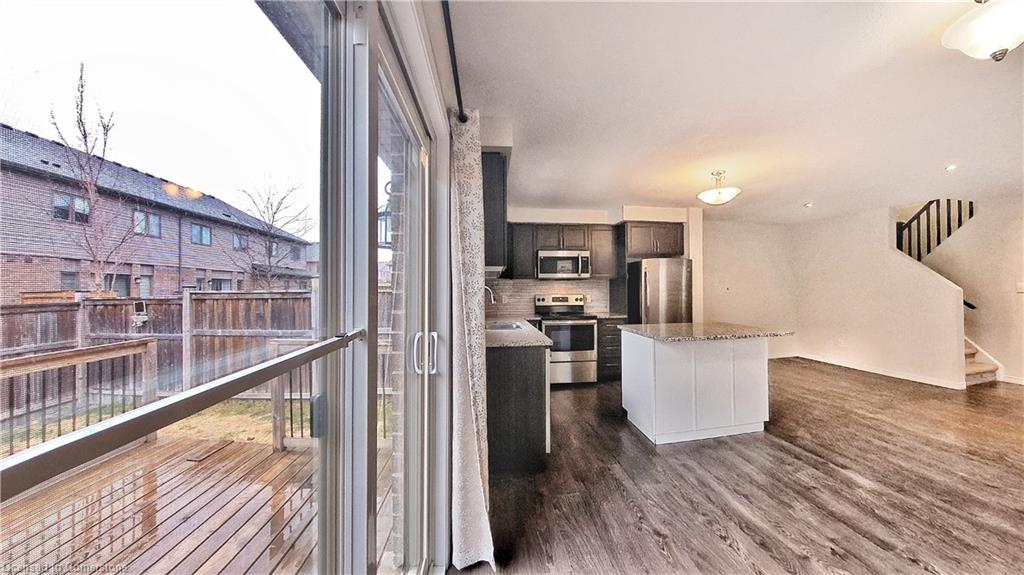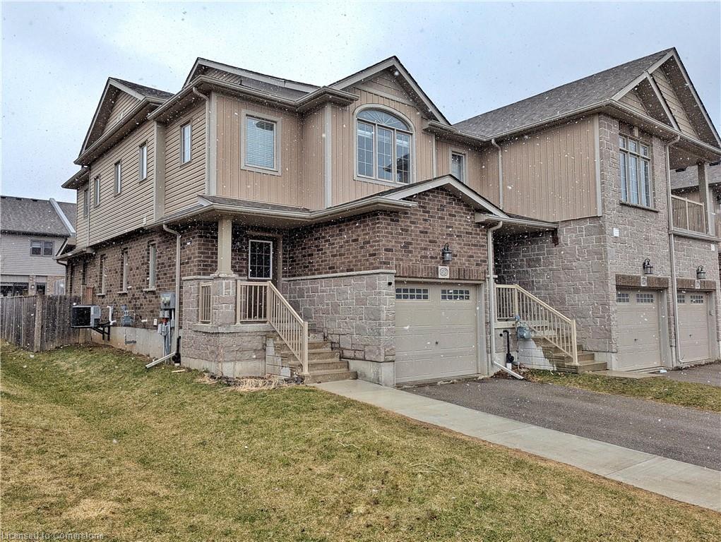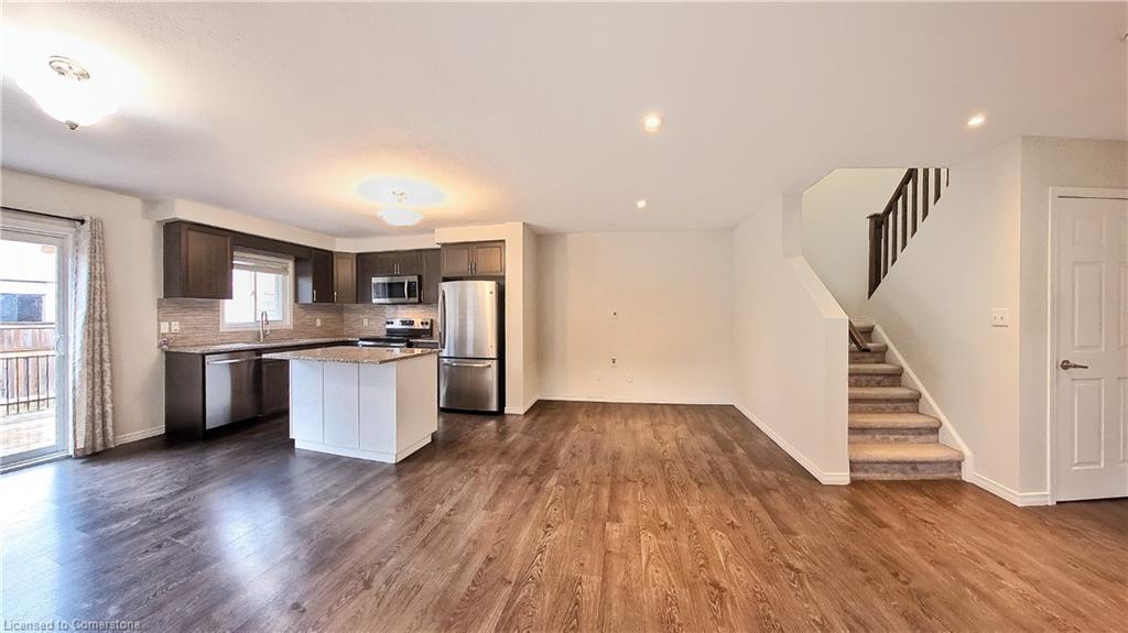 Stunning 3-bed, 4-bath end-unit executive townhome with finished basement and parking for 3 cars – no condo fees! Freshly painted and move-in ready, this like-new gem in Doon South boasts an open-concept layout with upgraded laminate flooring and a modern kitchen with stainless steel appliances. The luxurious master suite features his-and-hers closets and a spa-like ensuite with tiled shower. Enjoy outdoor living on your private wooden deck with fenced yard. The fully finished basement includes a spacious rec room and ample storage. Prime location near top-rated Groh Public School, Conestoga College, parks, scenic trails, and with quick Highway 401 access. Recent upgrades include fresh paint throughout and new appliances – simply unpack and enjoy!Key features:Rare 3-car parking in a townhome settingNo condo fees means more savingsEnd-unit provides extra windows and privacy4 full bathrooms for ultimate convenience. Like new condition with all new paint!