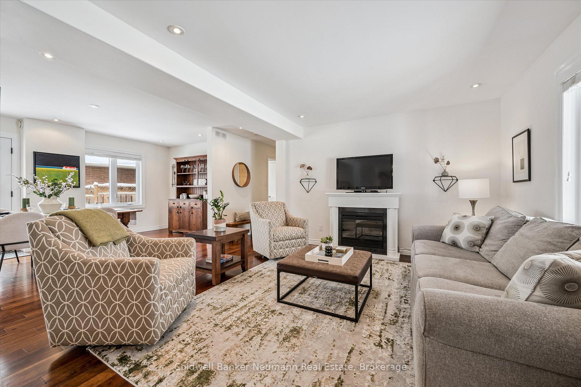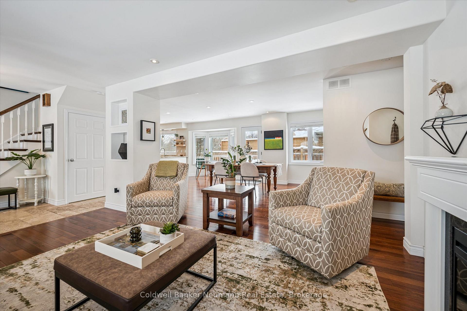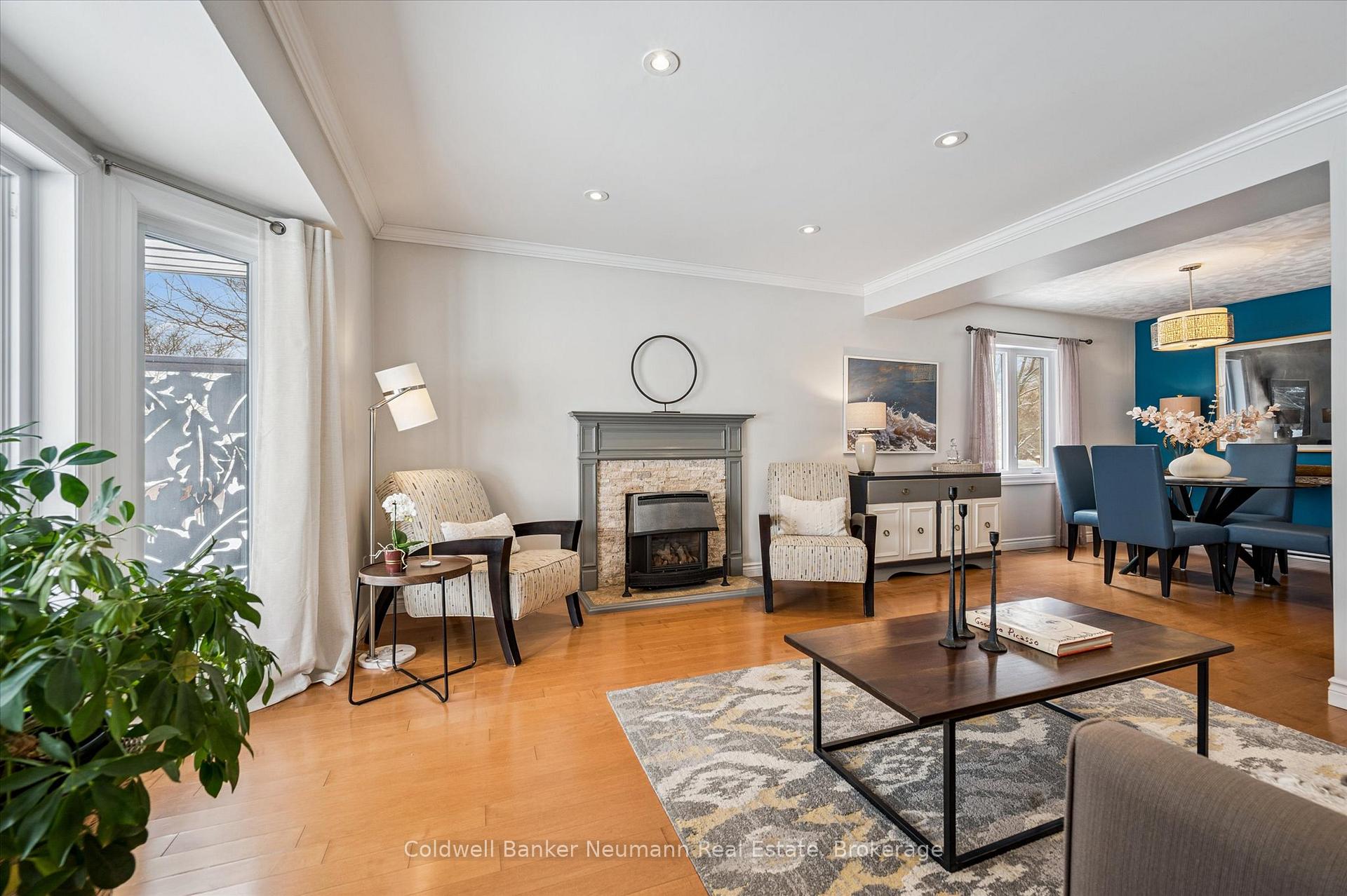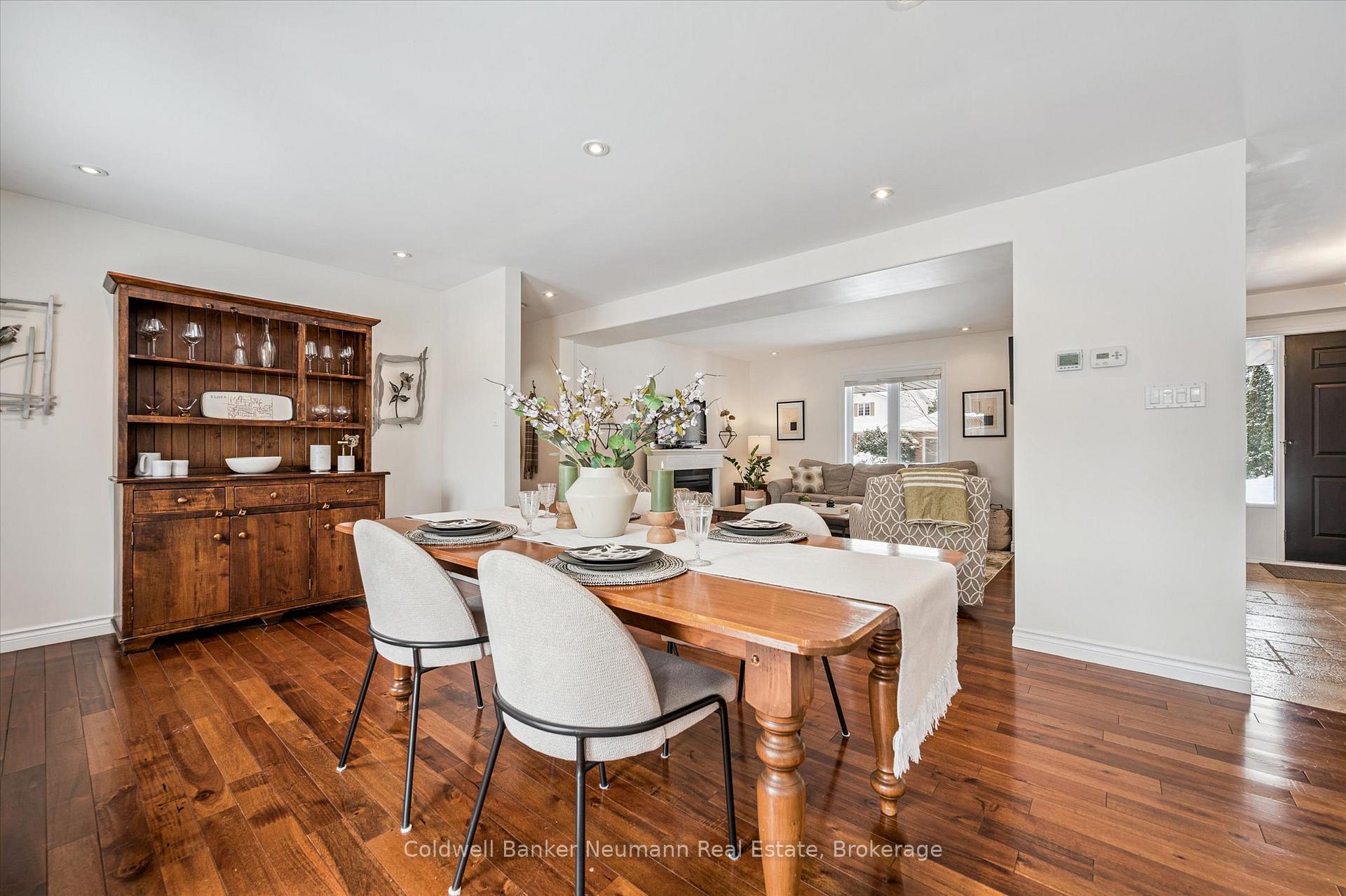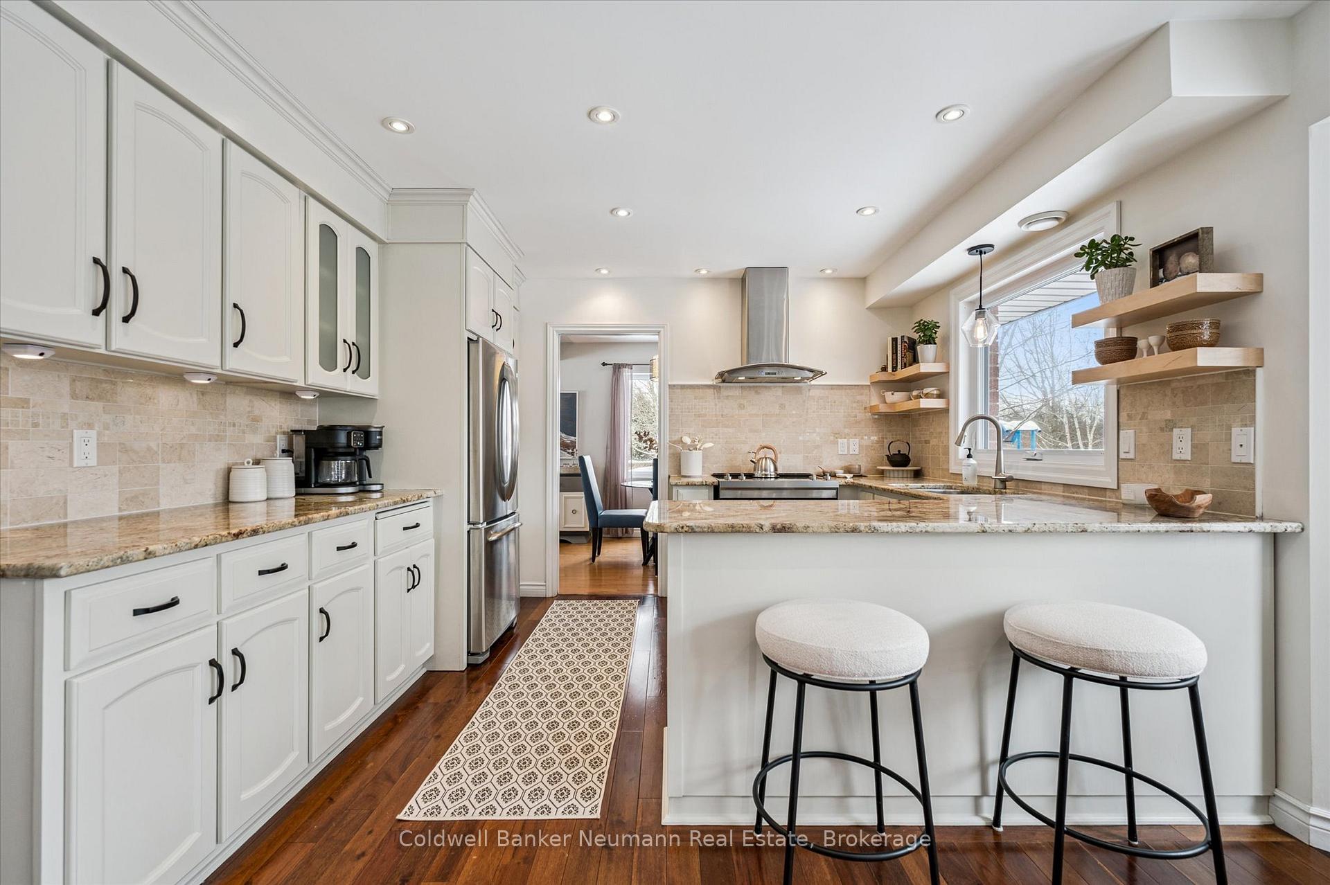 Welcome to this meticulously maintained two-storey home on a fully fenced corner lot in beautiful Elora. Offering approximately 3,700 sq ft of finished living space across three levels, this charming brick home with Cape Cod dormers and a covered front porch is ideal for families and professionals seeking space and convenience. A bright foyer opens to a thoughtfully designed main floor featuring a family room with a gas fireplace and large windows, a formal dining room with direct kitchen access, and a well-appointed kitchen with stainless steel appliances, granite countertops, and a generous peninsula with breakfast bar. A bay-window breakfast nook overlooks the backyard, while a front living room offers views of the front yard and front porch. The functional mudroom leading to the double car garage includes laundry and a three-piece bath.Upstairs there are three bedrooms, including a spacious primary suite with a 4-piece ensuite. Two additional bedrooms share a beautifully finished 4-piece bath, plus a charming reading nook at the top of the stairs.The partially finished lower level adds a family room, gym, and fourth bedroom. Enjoy the fully fenced backyard with direct access from the kitchen-perfect for entertaining. With parking for six (4 driveway, 2 garage) and a prime location beside Drimmie Park, in a sought-after school district and minutes to downtown Elora, this home offers outstanding lifestyle appeal with easy commuter access.