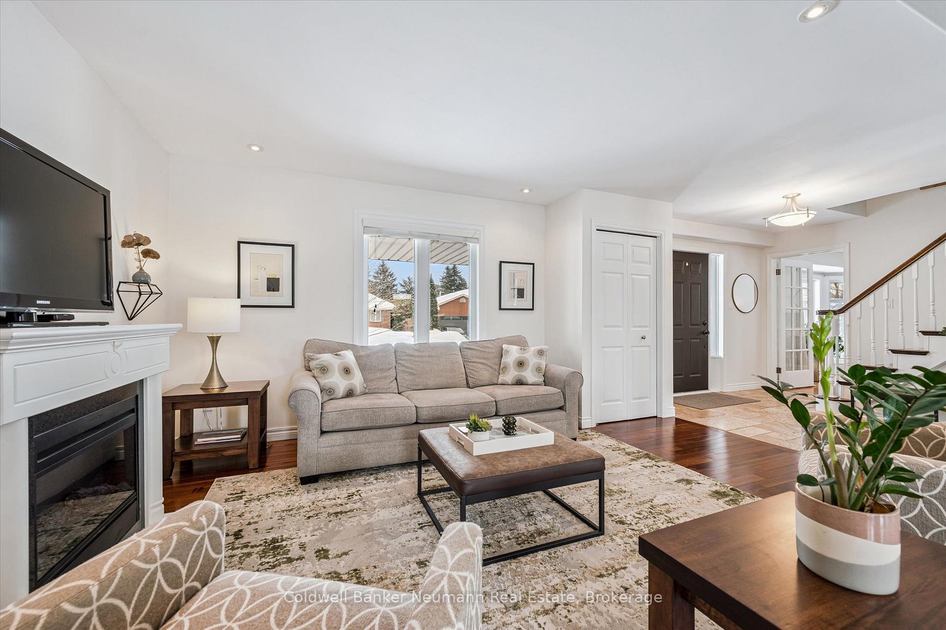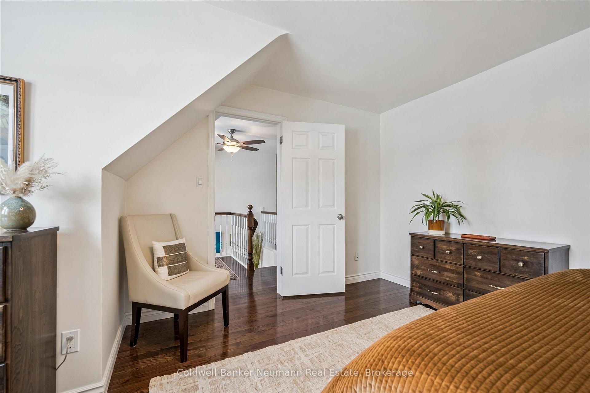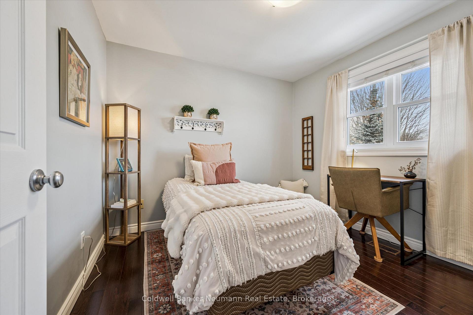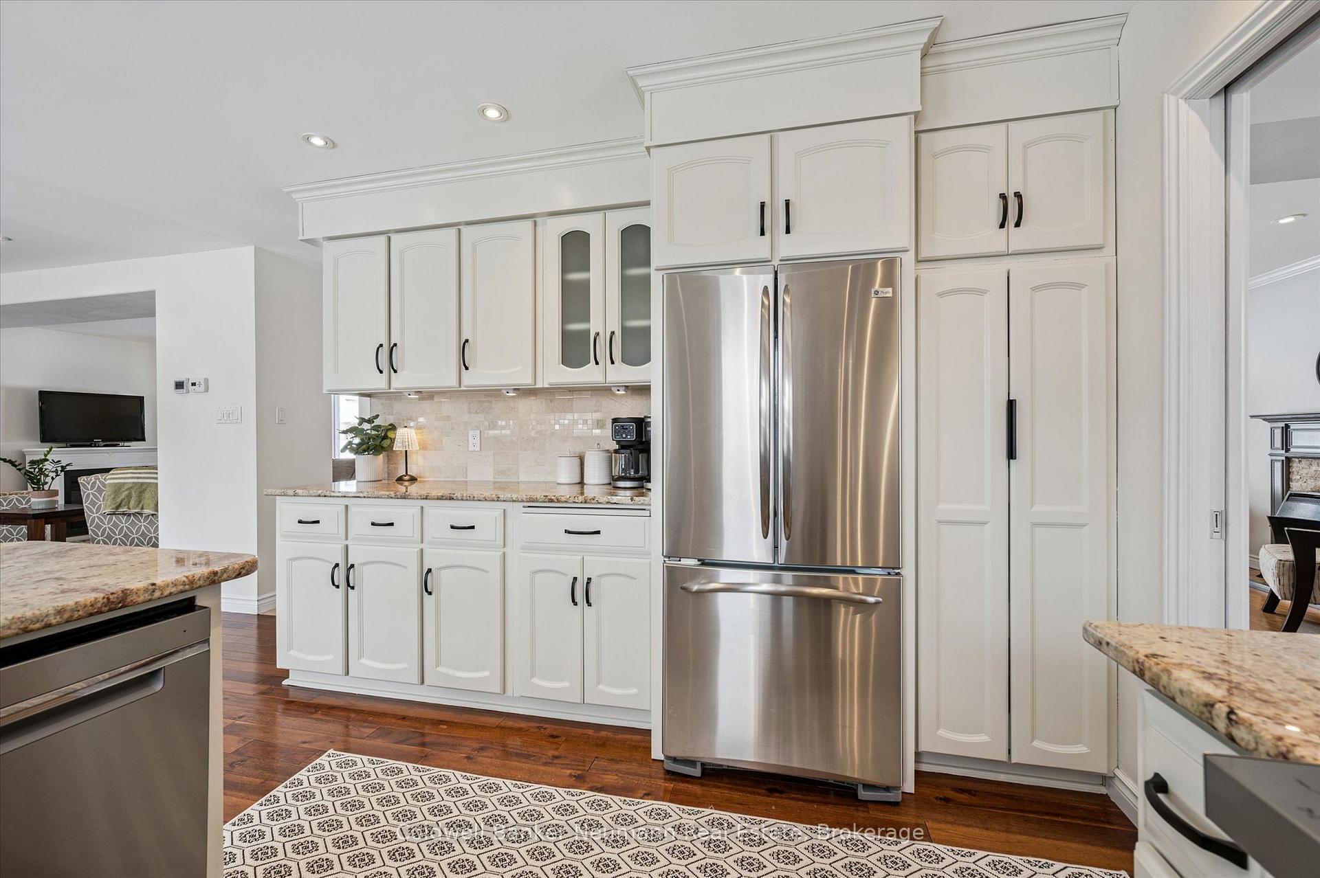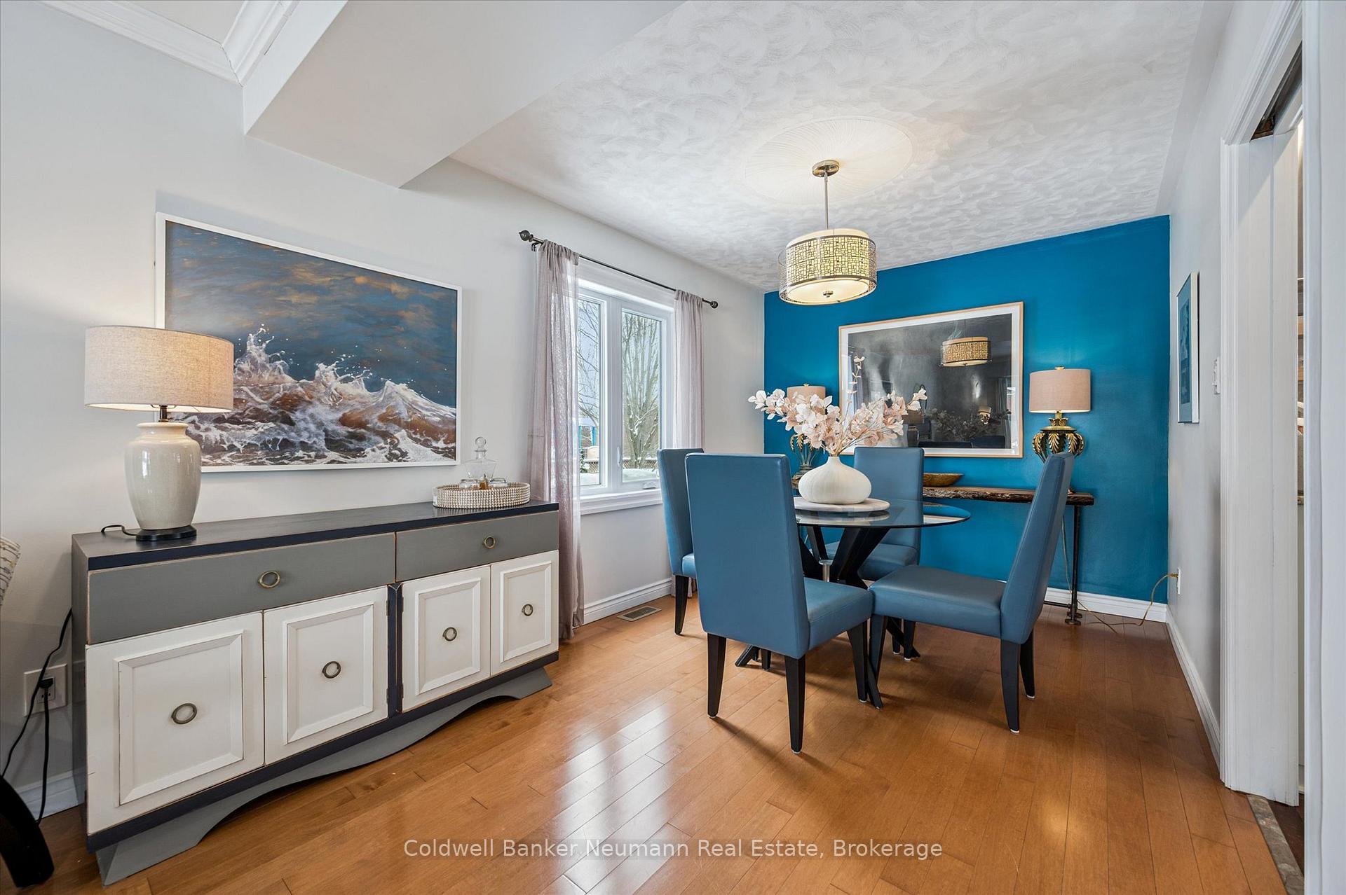 Welcome to this meticulously maintained two-storey home on a fully fenced corner lot in beautiful Elora. Offering approximately 3,700 sq ft of finished living space across three levels, this charming brick home with Cape Cod dormers and a covered front porch is ideal for families and professionals seeking space and convenience. A bright foyer opens to a thoughtfully designed main floor featuring a family room with a gas fireplace and large windows, a formal dining room with direct kitchen access, and a well-appointed kitchen with stainless steel appliances, granite countertops, and a generous peninsula with breakfast bar. A bay-window breakfast nook overlooks the backyard, while a front living room offers views of the front yard and front porch. The functional mudroom leading to the double car garage includes laundry and a three-piece bath.Upstairs there are three bedrooms, including a spacious primary suite with a 4-piece ensuite. Two additional bedrooms share a beautifully finished 4-piece bath, plus a charming reading nook at the top of the stairs.The partially finished lower level adds a family room, gym, and fourth bedroom. Enjoy the fully fenced backyard with direct access from the kitchen-perfect for entertaining. With parking for six (4 driveway, 2 garage) and a prime location beside Drimmie Park, in a sought-after school district and minutes to downtown Elora, this home offers outstanding lifestyle appeal with easy commuter access.