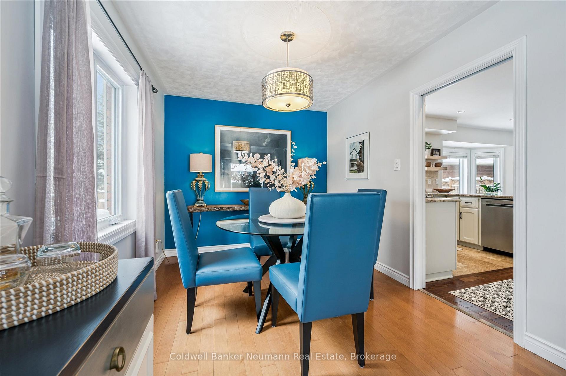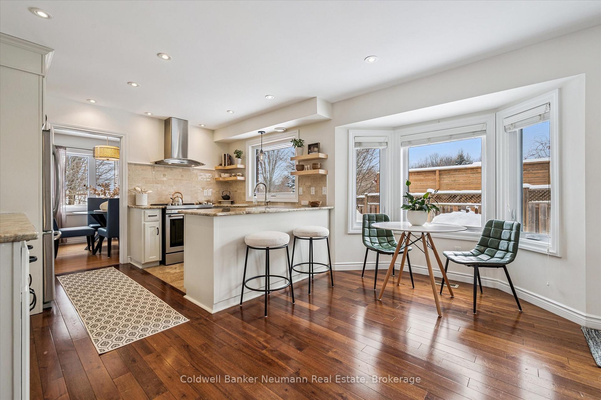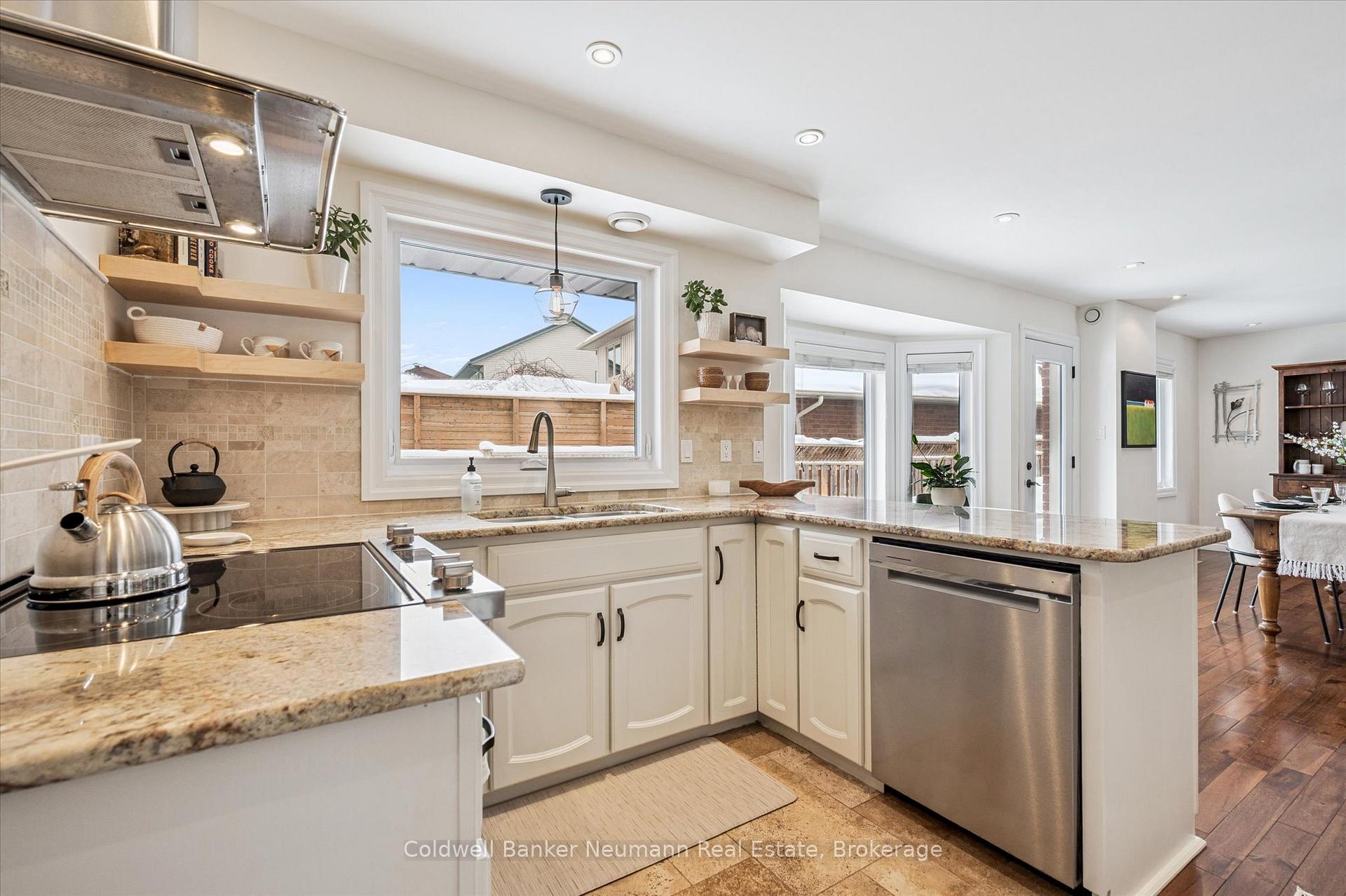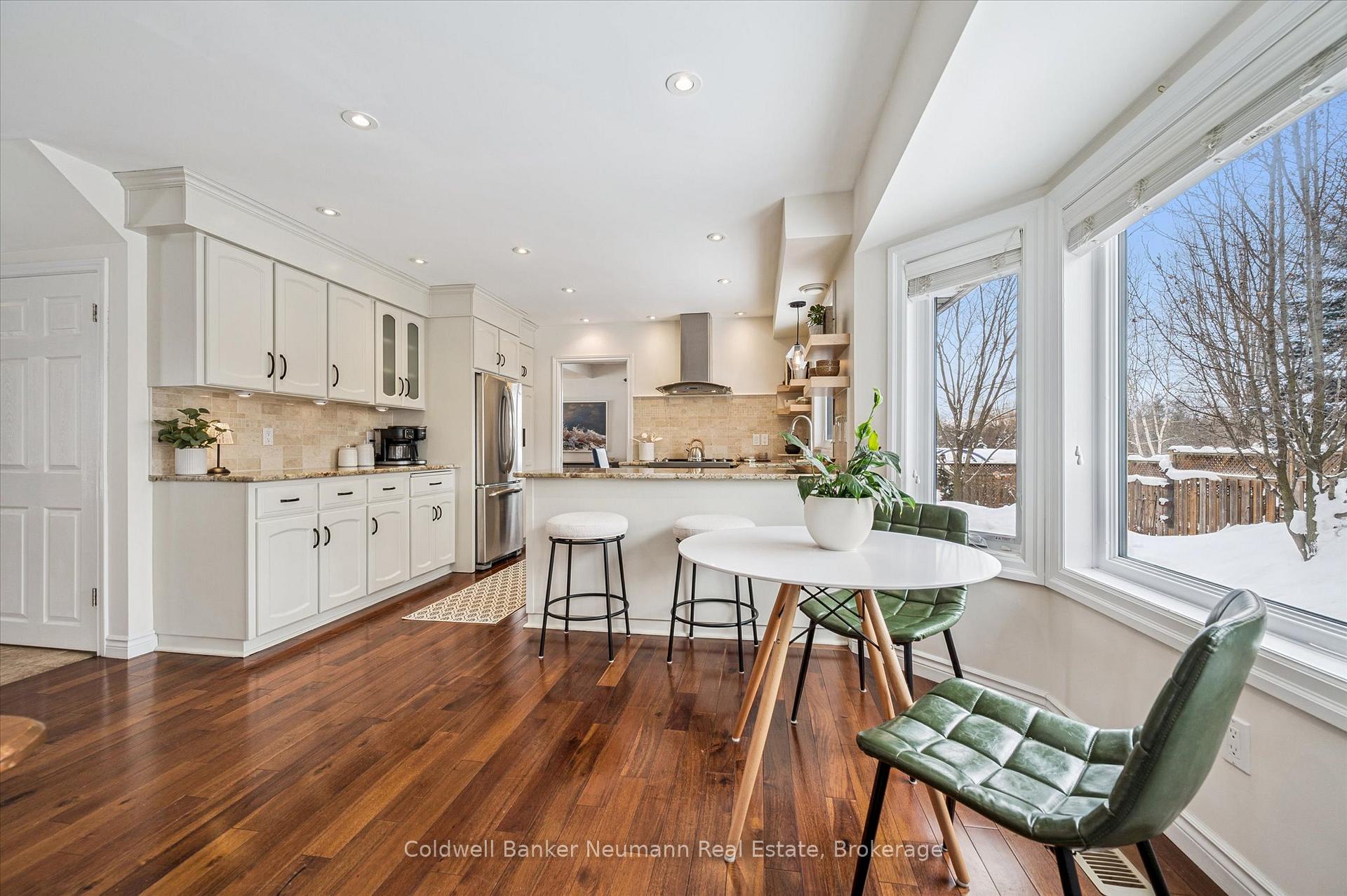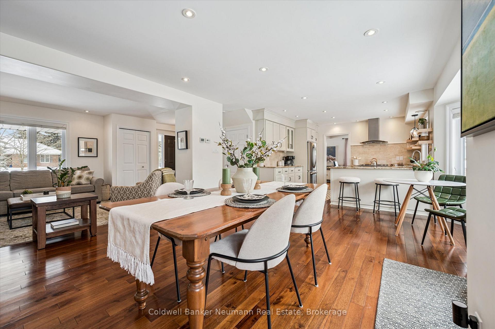 Welcome to this meticulously maintained two-storey home on a fully fenced corner lot in beautiful Elora. Offering approximately 3,700 sq ft of finished living space across three levels, this charming brick home with Cape Cod dormers and a covered front porch is ideal for families and professionals seeking space and convenience. A bright foyer opens to a thoughtfully designed main floor featuring a family room with a gas fireplace and large windows, a formal dining room with direct kitchen access, and a well-appointed kitchen with stainless steel appliances, granite countertops, and a generous peninsula with breakfast bar. A bay-window breakfast nook overlooks the backyard, while a front living room offers views of the front yard and front porch. The functional mudroom leading to the double car garage includes laundry and a three-piece bath.Upstairs there are three bedrooms, including a spacious primary suite with a 4-piece ensuite. Two additional bedrooms share a beautifully finished 4-piece bath, plus a charming reading nook at the top of the stairs.The partially finished lower level adds a family room, gym, and fourth bedroom. Enjoy the fully fenced backyard with direct access from the kitchen-perfect for entertaining. With parking for six (4 driveway, 2 garage) and a prime location beside Drimmie Park, in a sought-after school district and minutes to downtown Elora, this home offers outstanding lifestyle appeal with easy commuter access.