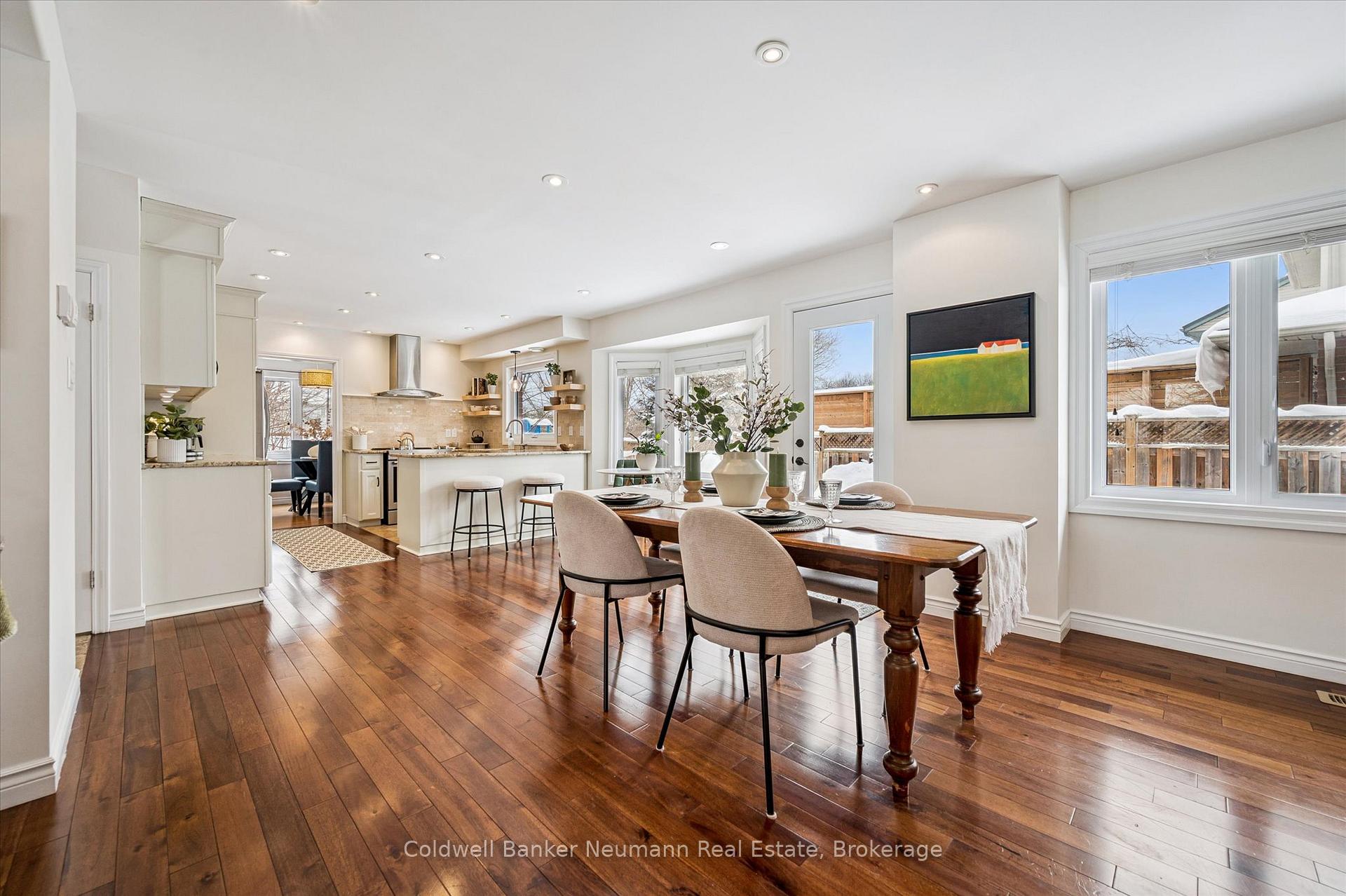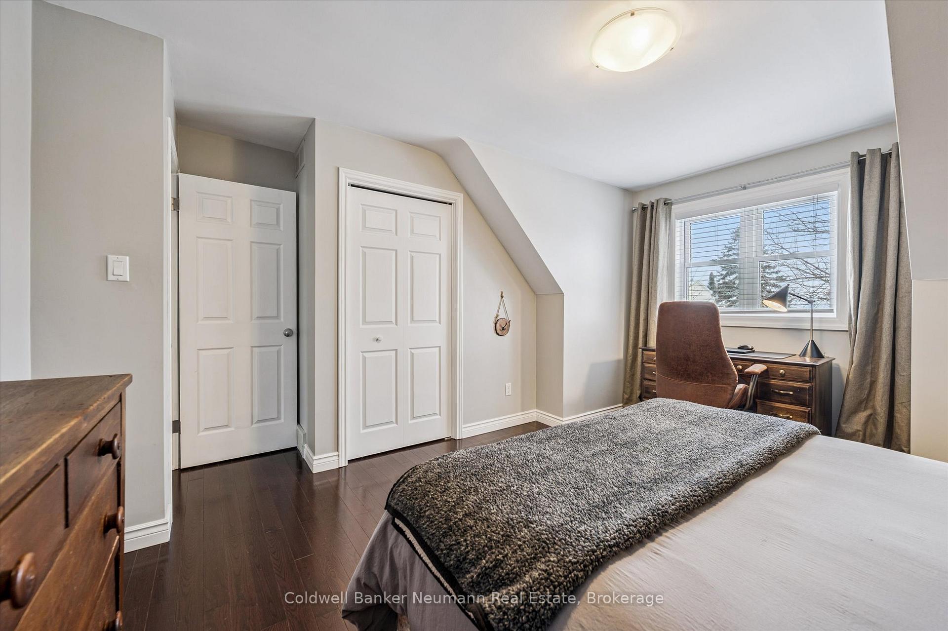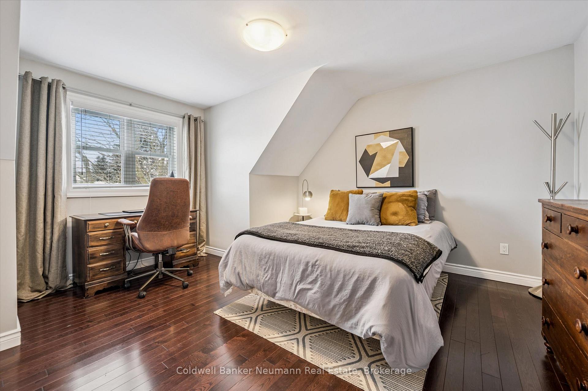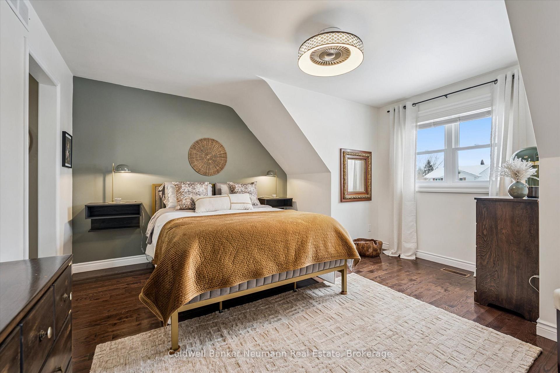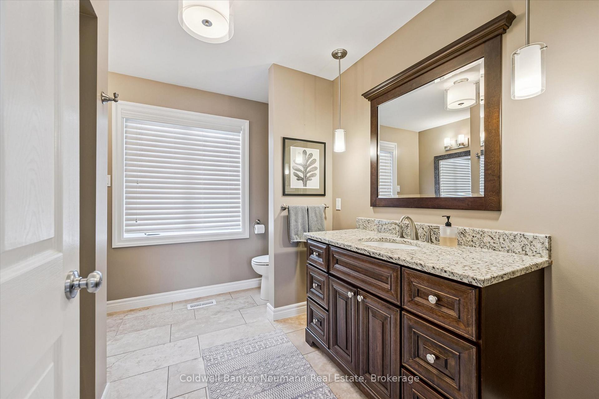 Welcome to this meticulously maintained two-storey home on a fully fenced corner lot in beautiful Elora. Offering approximately 3,700 sq ft of finished living space across three levels, this charming brick home with Cape Cod dormers and a covered front porch is ideal for families and professionals seeking space and convenience. A bright foyer opens to a thoughtfully designed main floor featuring a family room with a gas fireplace and large windows, a formal dining room with direct kitchen access, and a well-appointed kitchen with stainless steel appliances, granite countertops, and a generous peninsula with breakfast bar. A bay-window breakfast nook overlooks the backyard, while a front living room offers views of the front yard and front porch. The functional mudroom leading to the double car garage includes laundry and a three-piece bath.Upstairs there are three bedrooms, including a spacious primary suite with a 4-piece ensuite. Two additional bedrooms share a beautifully finished 4-piece bath, plus a charming reading nook at the top of the stairs.The partially finished lower level adds a family room, gym, and fourth bedroom. Enjoy the fully fenced backyard with direct access from the kitchen-perfect for entertaining. With parking for six (4 driveway, 2 garage) and a prime location beside Drimmie Park, in a sought-after school district and minutes to downtown Elora, this home offers outstanding lifestyle appeal with easy commuter access.