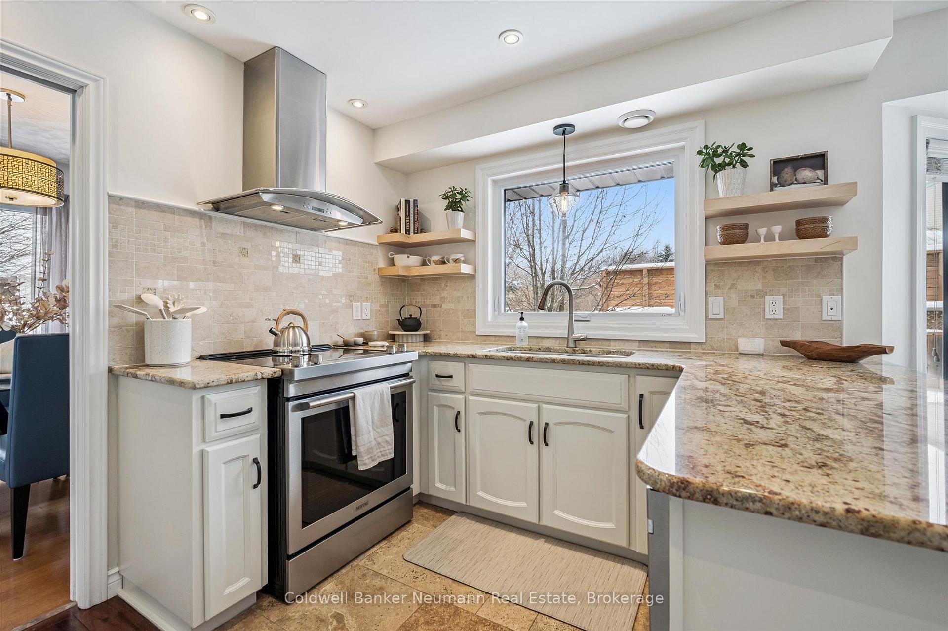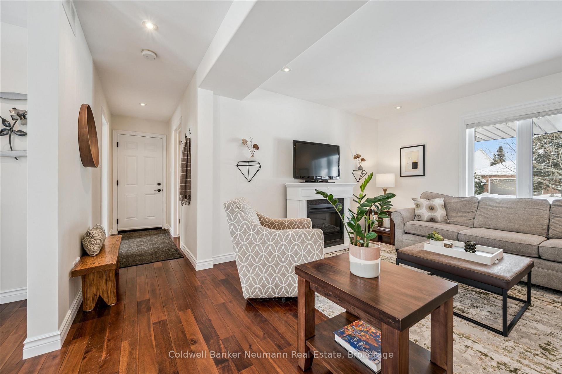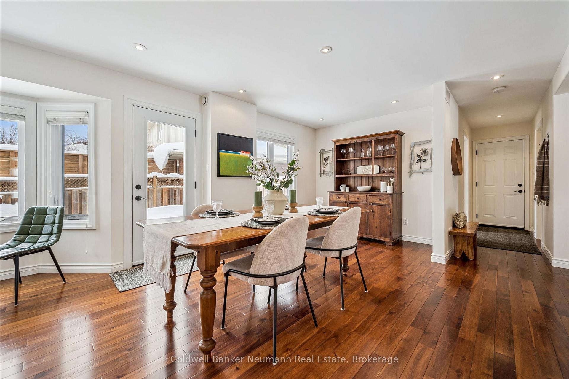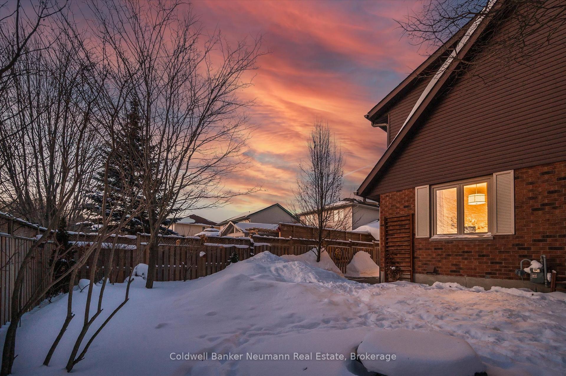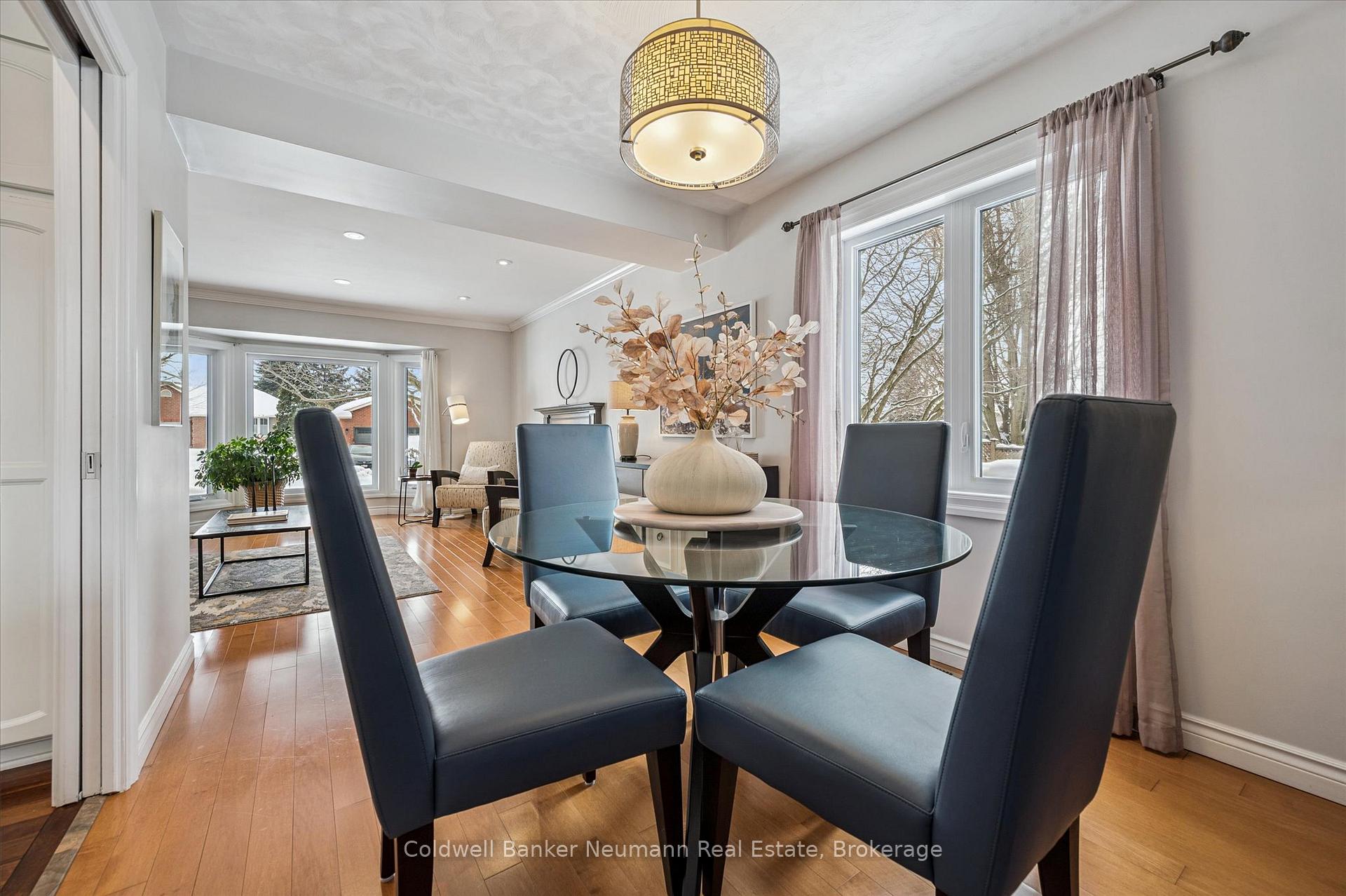 Welcome to this meticulously maintained two-storey home on a fully fenced corner lot in beautiful Elora. Offering approximately 3,700 sq ft of finished living space across three levels, this charming brick home with Cape Cod dormers and a covered front porch is ideal for families and professionals seeking space and convenience. A bright foyer opens to a thoughtfully designed main floor featuring a family room with a gas fireplace and large windows, a formal dining room with direct kitchen access, and a well-appointed kitchen with stainless steel appliances, granite countertops, and a generous peninsula with breakfast bar. A bay-window breakfast nook overlooks the backyard, while a front living room offers views of the front yard and front porch. The functional mudroom leading to the double car garage includes laundry and a three-piece bath.Upstairs there are three bedrooms, including a spacious primary suite with a 4-piece ensuite. Two additional bedrooms share a beautifully finished 4-piece bath, plus a charming reading nook at the top of the stairs.The partially finished lower level adds a family room, gym, and fourth bedroom. Enjoy the fully fenced backyard with direct access from the kitchen-perfect for entertaining. With parking for six (4 driveway, 2 garage) and a prime location beside Drimmie Park, in a sought-after school district and minutes to downtown Elora, this home offers outstanding lifestyle appeal with easy commuter access.