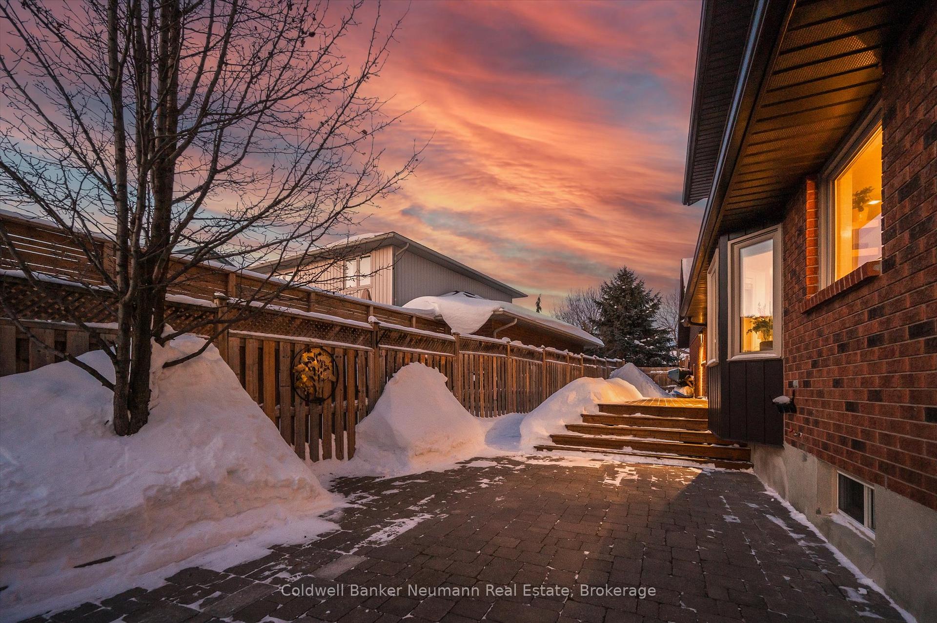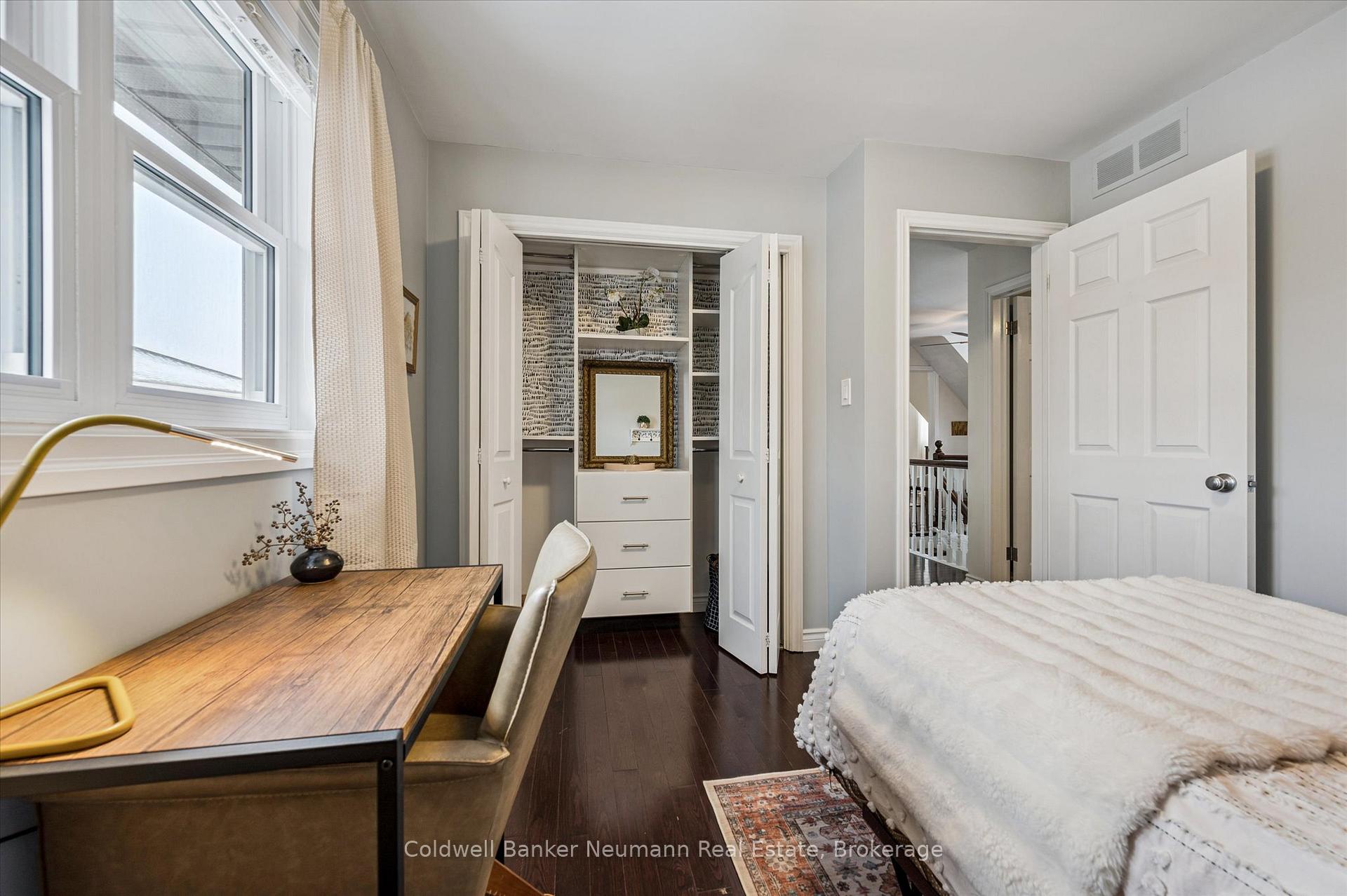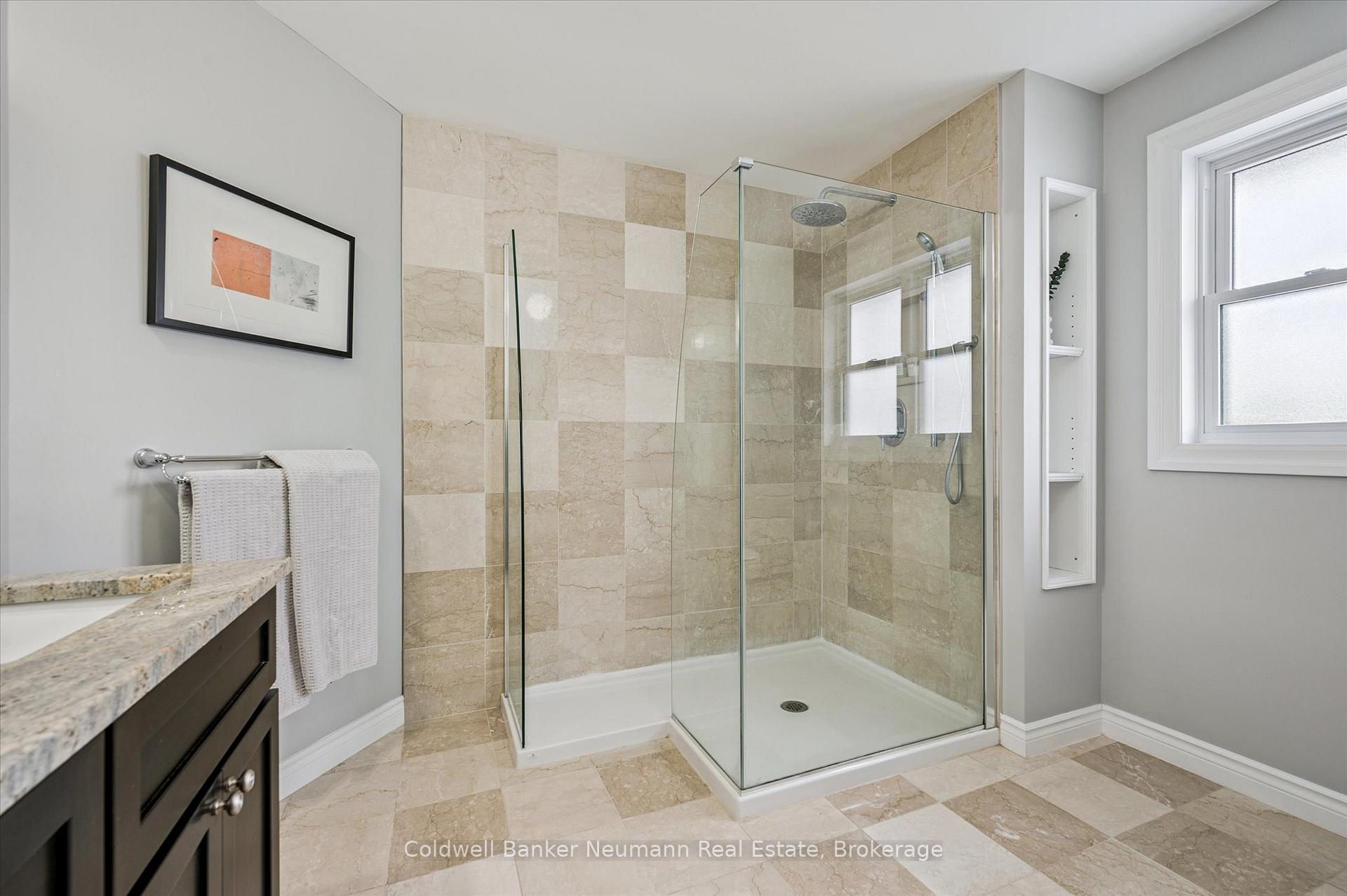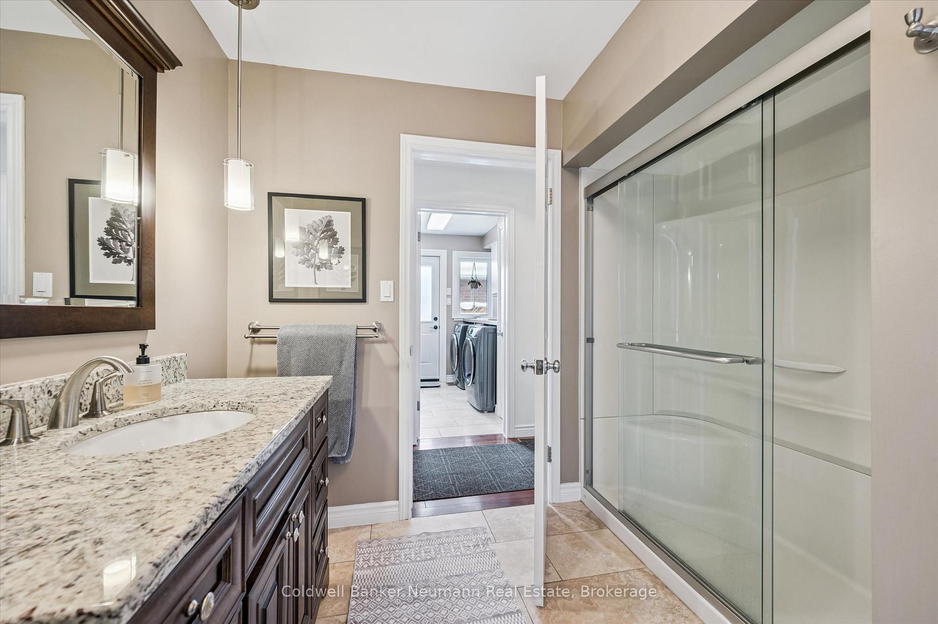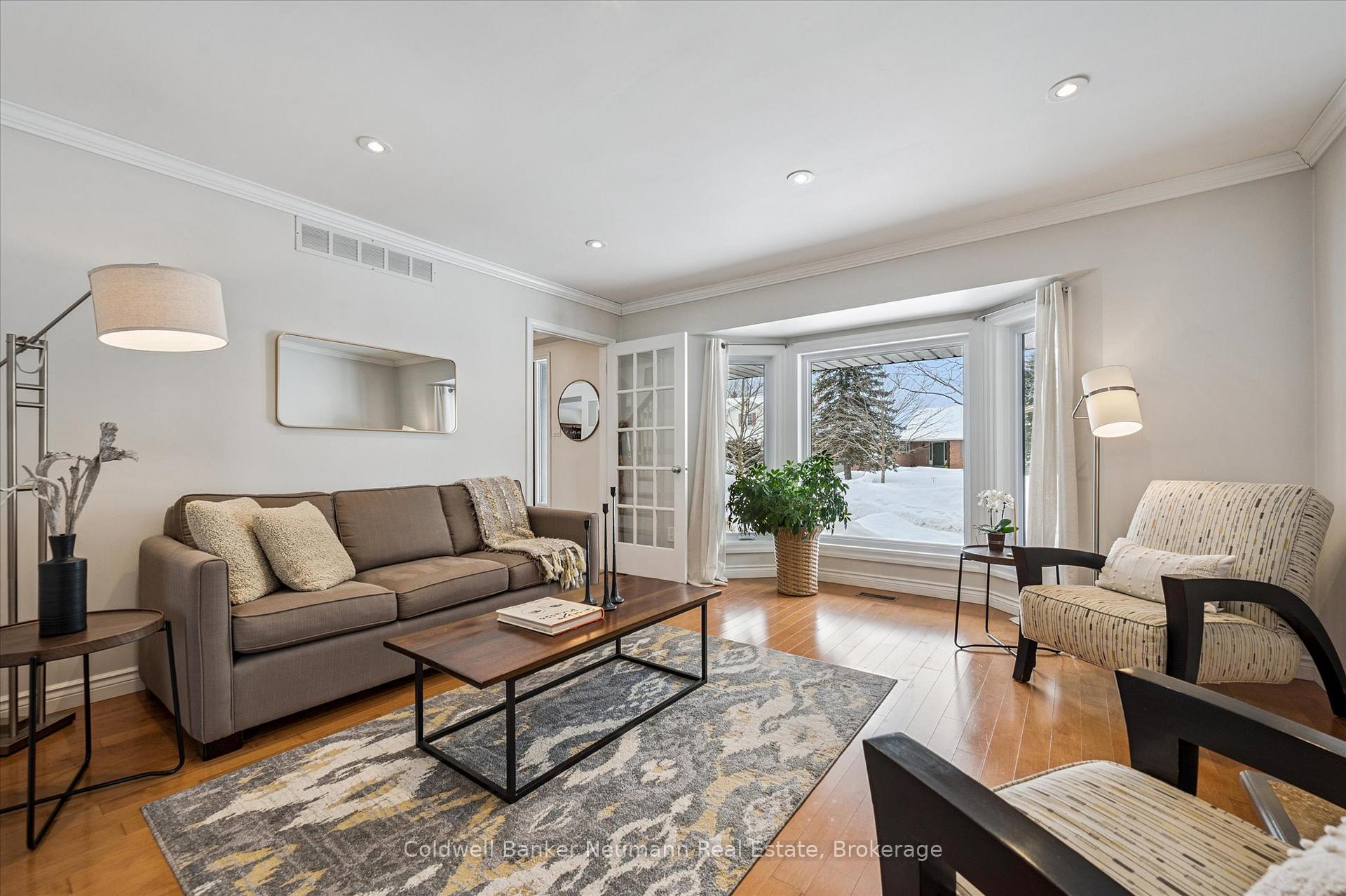 Welcome to this meticulously maintained two-storey home on a fully fenced corner lot in beautiful Elora. Offering approximately 3,700 sq ft of finished living space across three levels, this charming brick home with Cape Cod dormers and a covered front porch is ideal for families and professionals seeking space and convenience. A bright foyer opens to a thoughtfully designed main floor featuring a family room with a gas fireplace and large windows, a formal dining room with direct kitchen access, and a well-appointed kitchen with stainless steel appliances, granite countertops, and a generous peninsula with breakfast bar. A bay-window breakfast nook overlooks the backyard, while a front living room offers views of the front yard and front porch. The functional mudroom leading to the double car garage includes laundry and a three-piece bath.Upstairs there are three bedrooms, including a spacious primary suite with a 4-piece ensuite. Two additional bedrooms share a beautifully finished 4-piece bath, plus a charming reading nook at the top of the stairs.The partially finished lower level adds a family room, gym, and fourth bedroom. Enjoy the fully fenced backyard with direct access from the kitchen-perfect for entertaining. With parking for six (4 driveway, 2 garage) and a prime location beside Drimmie Park, in a sought-after school district and minutes to downtown Elora, this home offers outstanding lifestyle appeal with easy commuter access.