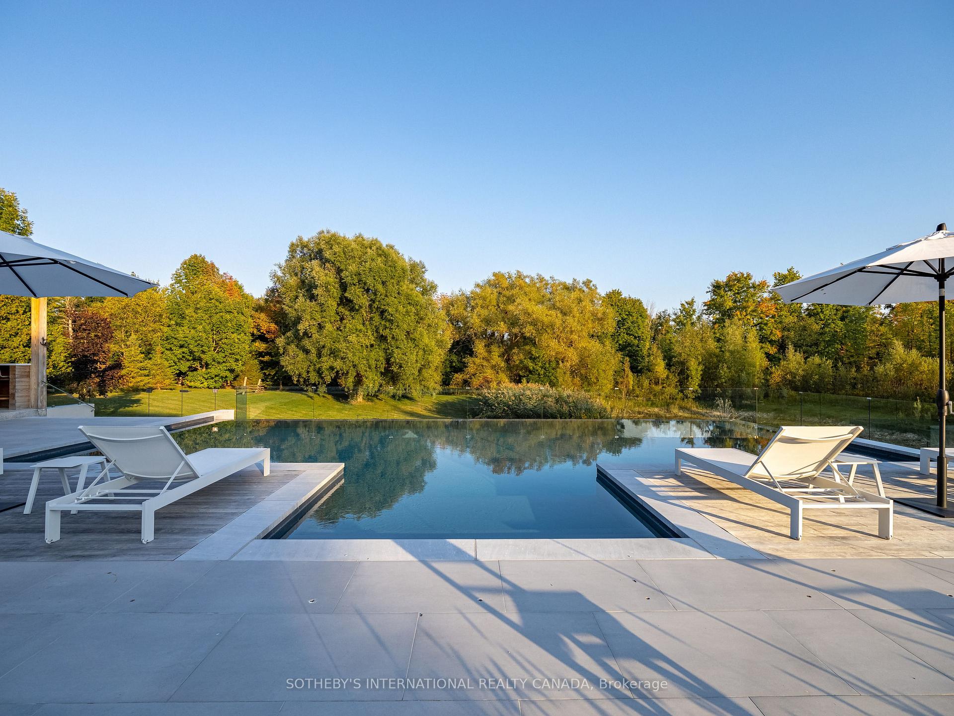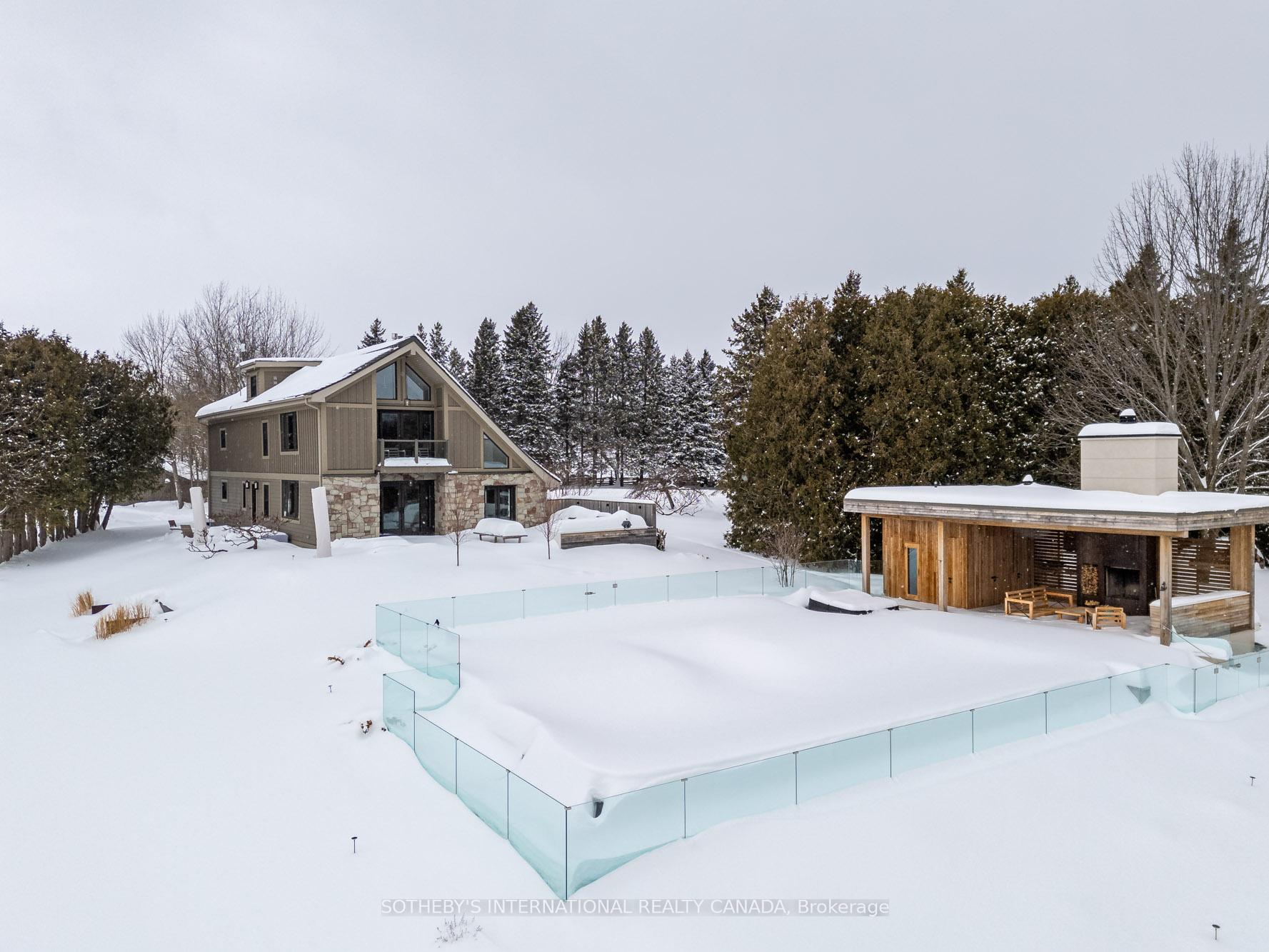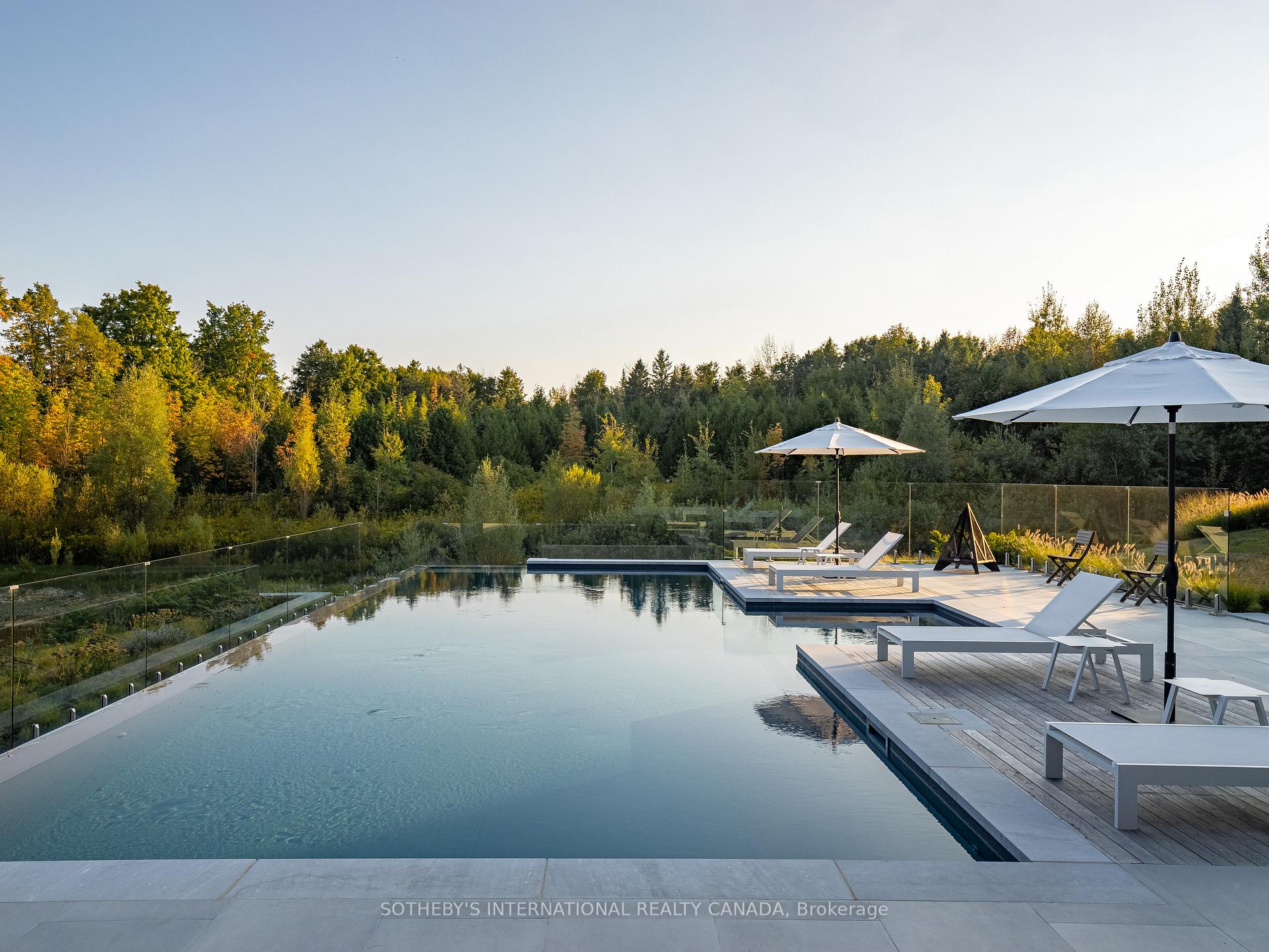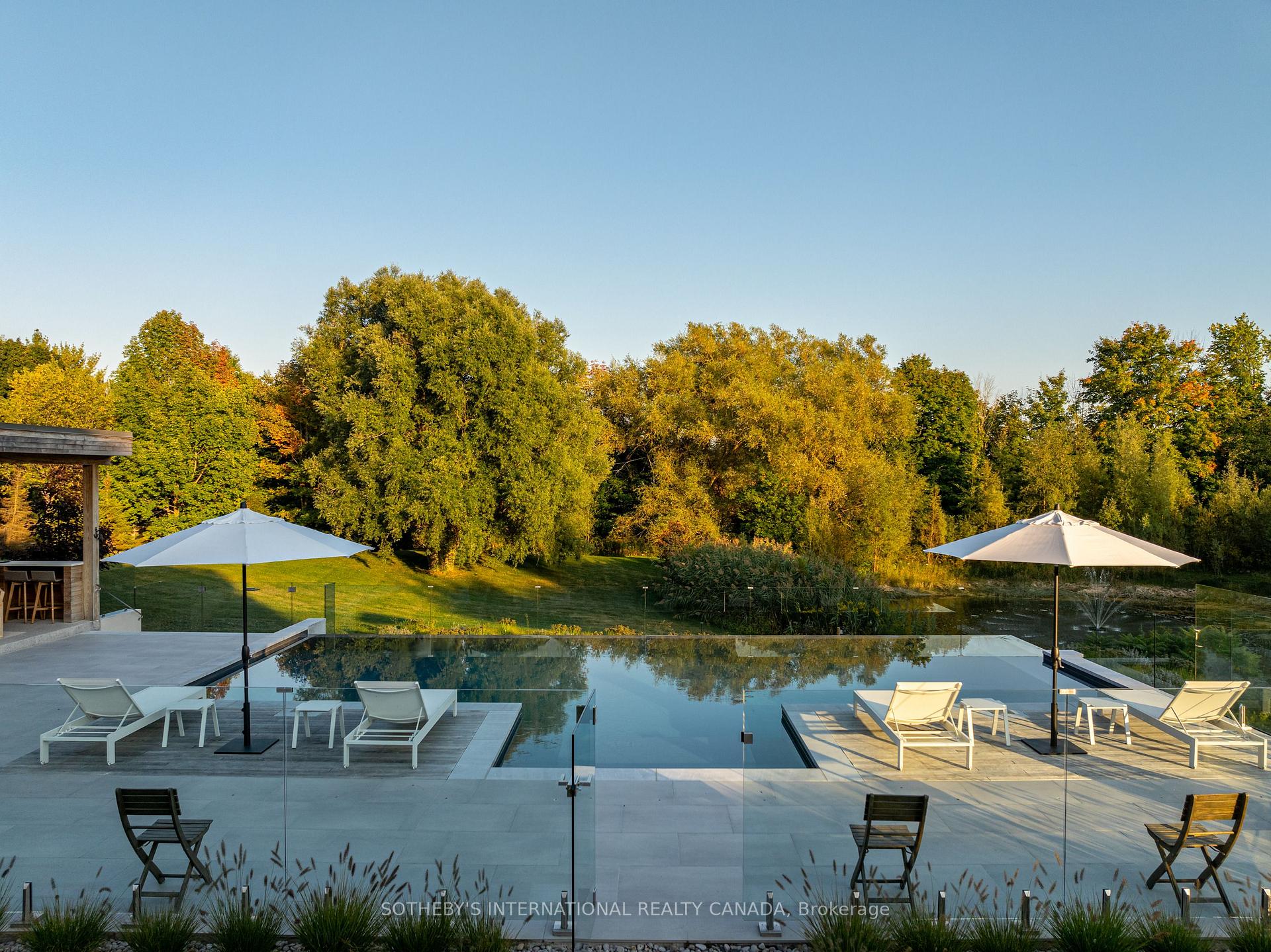 A world of timeless sophistication and unparalleled exclusivity unfolds. Nestled on approx. 20 acres, this estate boasts over 5,450 sqft of exquisitely designed living space, set against the backdrop of a mature forest. Every step onto this estate unveils an extraordinary lifestyle. The moment you arrive, panoramic views of the water, modern crafted outdoor living space, pool area & woodland greet you, centering around your private pond. Trails weaving through the untouched serenity of nature, offering an idyllic escape for exploration & tranquility. Crafted with superior level of artistry, Post-and-beam construction, soaring cathedral ceilings & rich thick plank flooring throughout the home create warmth. The grand primary suite serves as a personal retreat with a sitting room, yoga studio, private balcony with enriched views that inspire morning reflection or evening serenity. The heart of the home is its gourmet kitchen, complemented by four well-appointed bedrooms & four + one bathrooms. Invision, unwinding by a stunning wood-burning fireplace, beautifully set against a dramatic stone wall. Whether it’s the soft crackle of the fire or the serene views of your outdoor haven, every moment here invites you to relax, recharge, & revel in the luxury of your surroundings. This estate is a true entertainer’s dream. Seamless indoor & outdoor venues, multiple lounging areas, outdoor kitchen, reflective glassed-in pool area, infinity edge saltwater pool, elegant thermal ash-clad cabana includes a wood-burning fireplace, pop-up TV, sauna, wet bar, change room, two-piece bathroom & outdoor shower, meticulously designed by Adrian Gale. The rejuvenating hot tub integrates into your private resort-like haven, Enjoy exclusive amenities including private trails, fishing, skating, all designed havens for discerning nature lovers seeking the pinnacle of luxury living. Conveniently located 1 hr from Toronto, minutes to TPC Toronto at Osprey Valley golf course & Caledon Ski Club