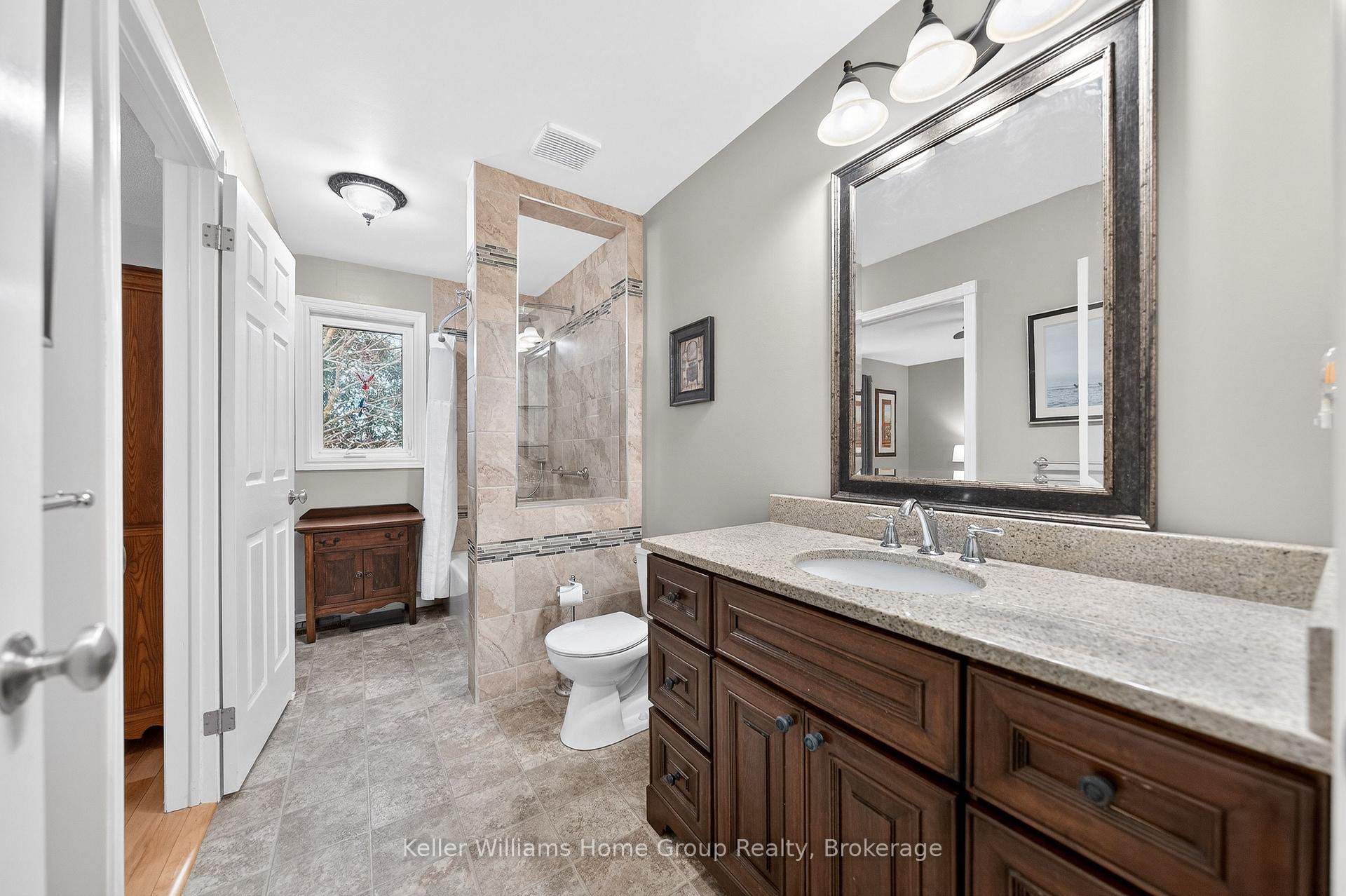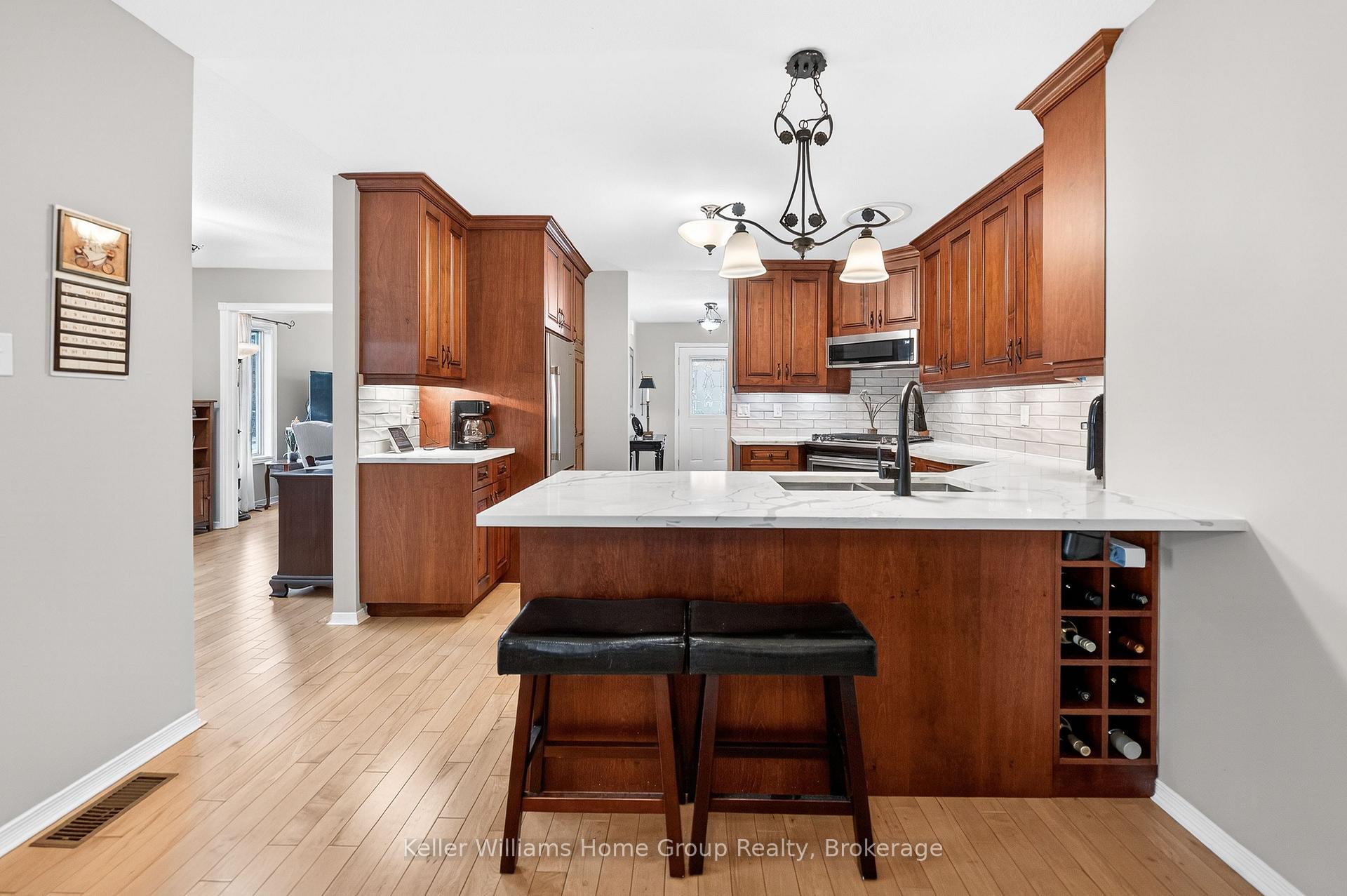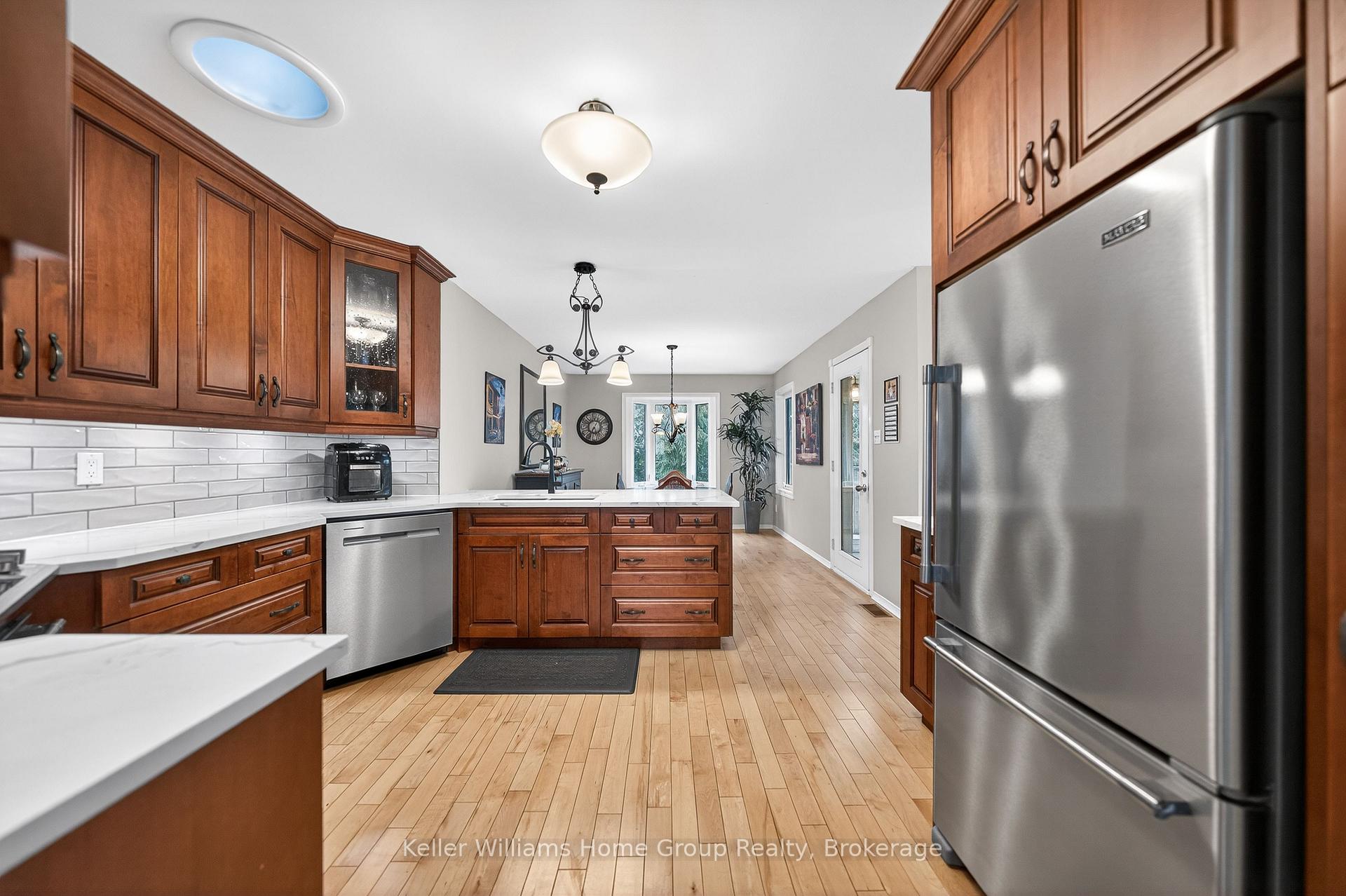 Beautiful Wrighthaven built bungalow in a very desirable Fergus neighbourhood, a great location close to Downtown Fergus, local schools, Sportsplex and shopping etc. This immaculate bungalow has a generous size foyer, beautiful maple hardwood flooring throughout the main floor, a nice bright living room with vaulted ceiling, a formal dining area, the kitchen has been beautifully renovated with custom cabinetry, quartz counter tops, ceramic tile backsplash and Maytag stainless appliances, a good sized dinette area and a 75 sq ft sunroom with patio doors leading out to a deck overlooking the nicely landscaped backyard. The main floor also has 2 good sized bedrooms, the primary bedroom has a cheater style 4 piece renovated bathroom, the second bedroom comes with a Murphy bed, a 2 piece en-suite as well as in-suite laundry. Head down to the finished walkout basement and you will find the 2 bedroom in-law suite with a 4 piece bathroom, very spacious open concept living area, a well equipped kitchen with gas stove and fridge, dining area, living room with gas fireplace, storage and laundry room for this unit, and a walkout leading to a nice inter locking stone patio. Included in the sale are 2 x gas stoves, 2 x fridges, 2 x washing machines, 2 x clothes dryers, dishwasher, microwave, central vac system, chest freezer, water softener, storage shelving, window coverings, Murphy bed, and storage shed. This is a perfect home for anybody looking for additional accommodation with a separate entrance for family members, or making the suite into a legal basement unit subject to permits for additional income, or even additional living space for the larger family.