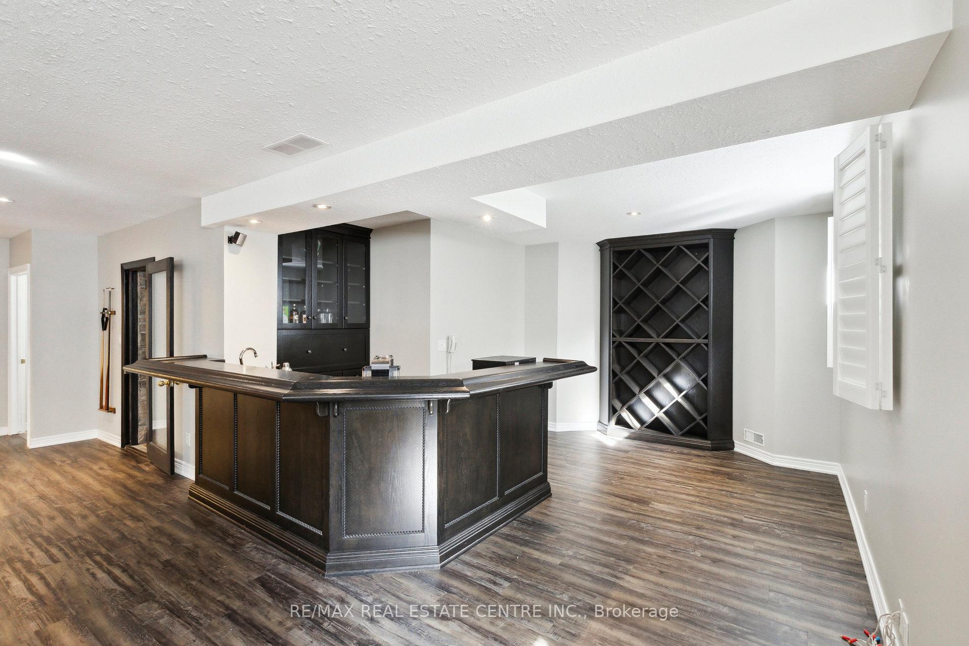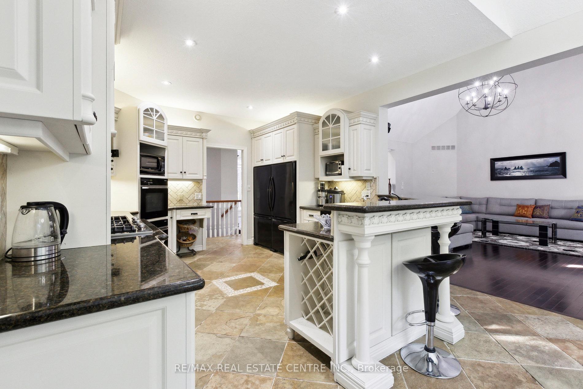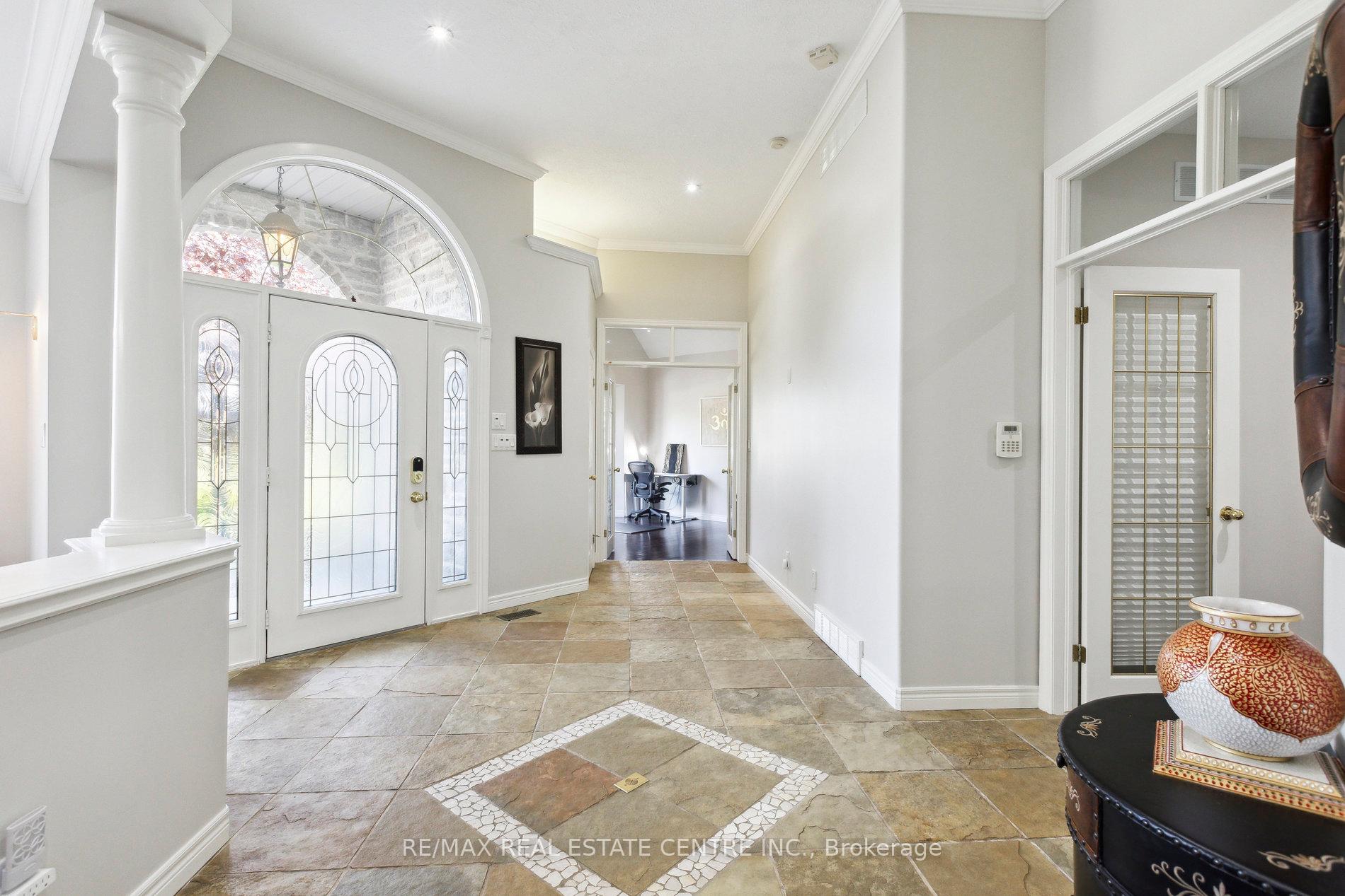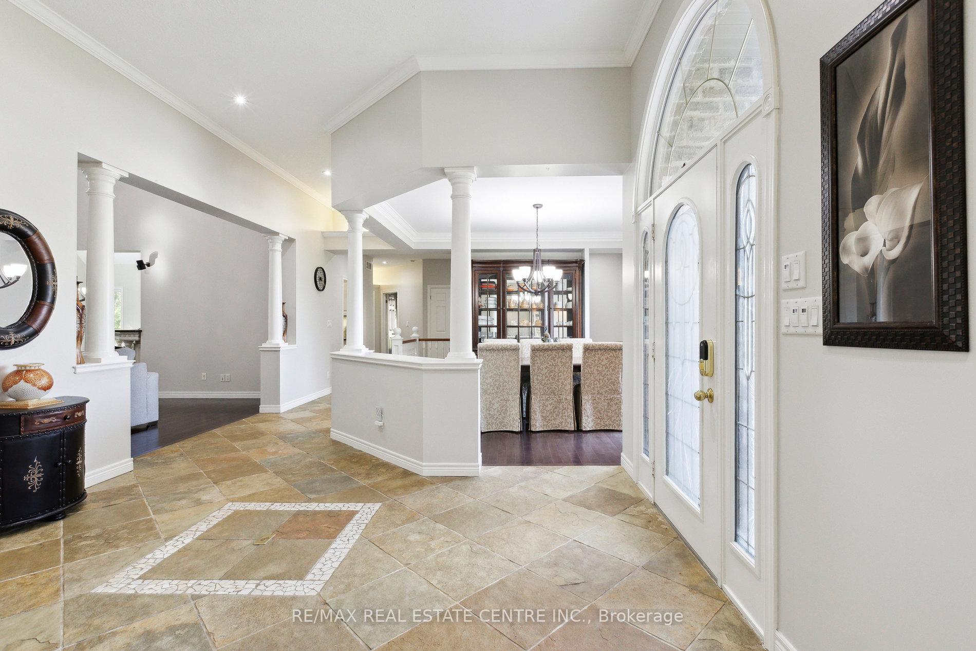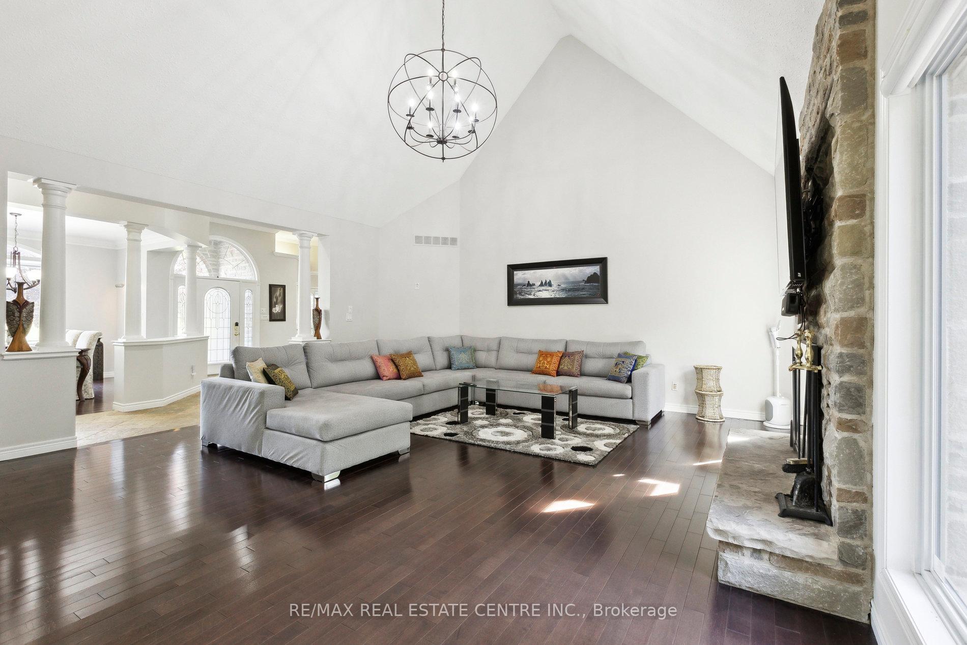 Welcome to your dream home, ideally located in the sought-after Fox Run neighborhood, just south of Guelph and only minutes from Highway401. This home with a total of living space of 5.579 Sq. Ft perfectly blends elegance, comfort, and endless potential. As you approach the stately driveway, you will notice the flagstone pathway, a wrought iron gate, and a striking stone archway that leads to the backyard, featuring a single car garage and a double car garage. Step inside the grand foyer, adorned with soaring 11-foot ceilings and slate flooring, which offers clear sightline into the beautifully appointed living and dining areas. The main living room is a showstopper, boasting 23-foot cathedral ceilings and a dramatic stone fireplace ideal for entertaining or relaxing with family. The gourmet kitchen is a chefs dream, featuring exquisite granite countertops, custom maple cabinetry, and high-end finishes. It includes two refrigerators and a charming breakfast bar, making it not only functional but also a warm space for culinary creativity. The main level offers spacious rooms that flow seamlessly into one another, with the primary suite serving as a true sanctuary, highlighted by soaring ceilings, an expansive walk-in closet, and a luxurious spa-inspired ensuite. The basement is an entertainers paradise, boasting a custom bar complete with a sink, a walk-in wine cellar, and a spacious recreation/games room. It also includes an additional bedroom, a full bathroom, and a private exercise room. Additionally, there is nearly 1,000 square feet of unfinished space in the utility area, providing excellent versatility for future customization. Don’t miss your opportunity to own this remarkable property