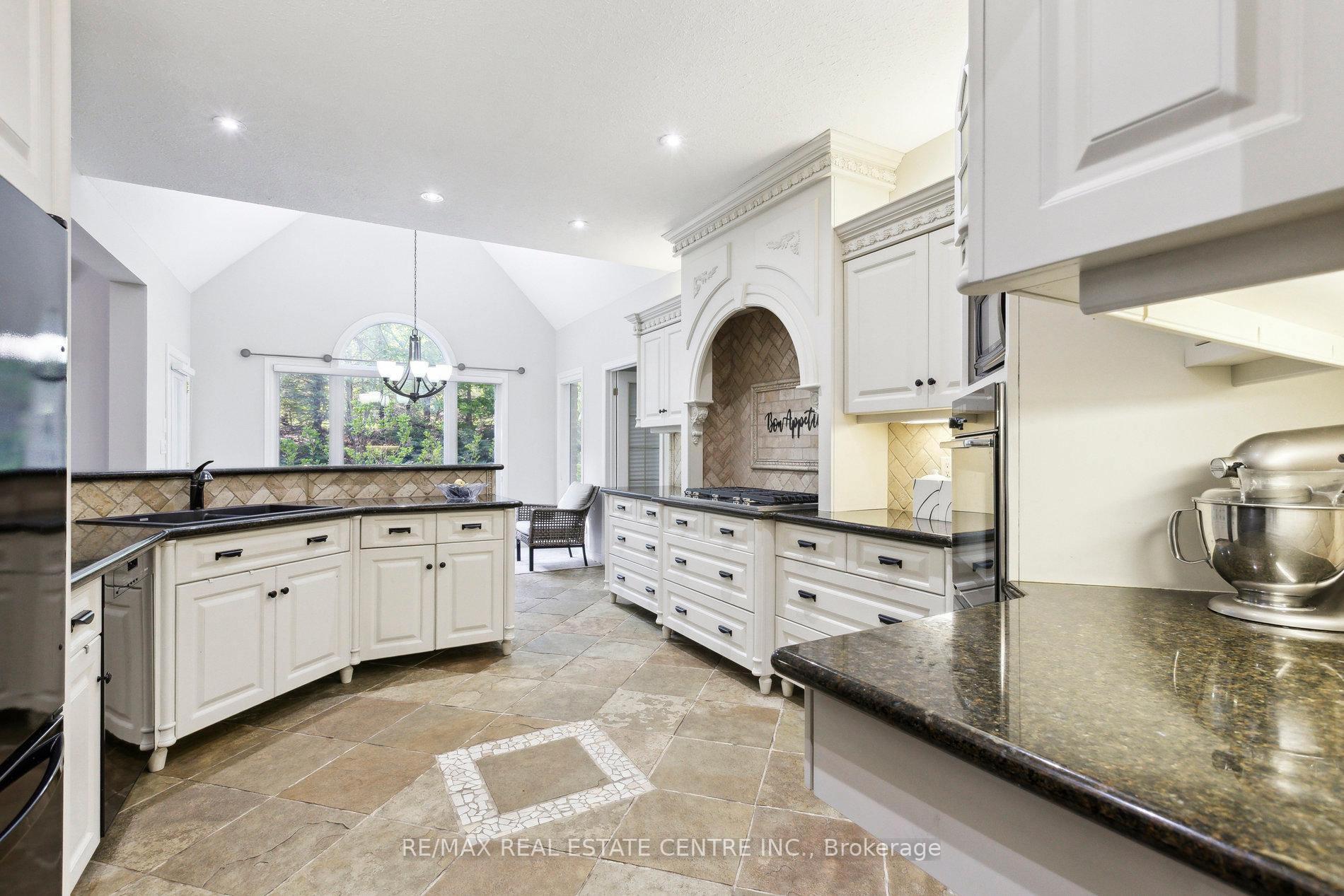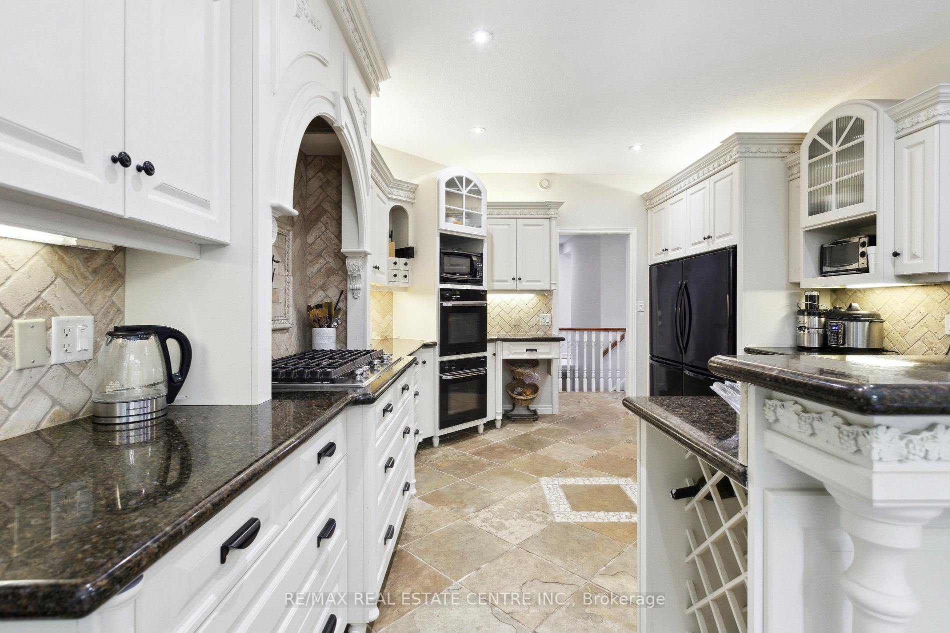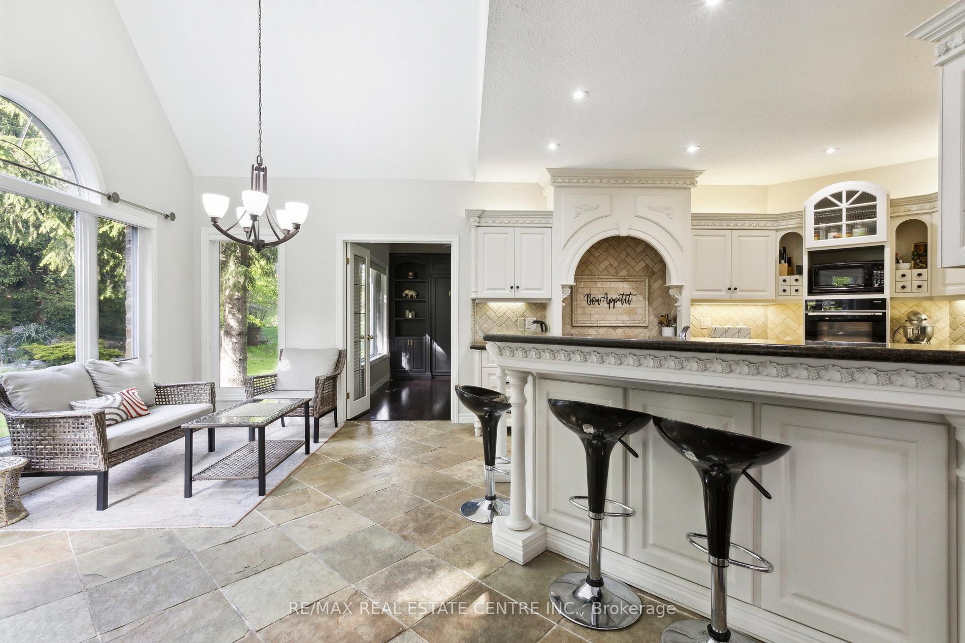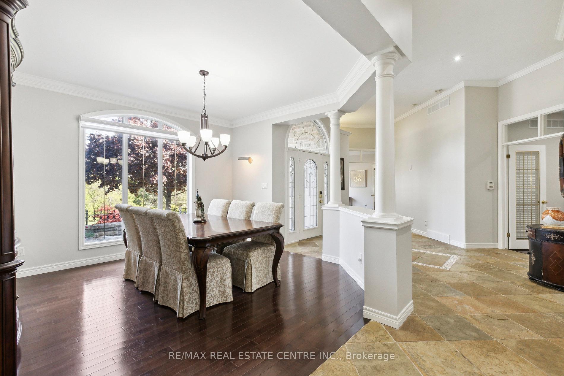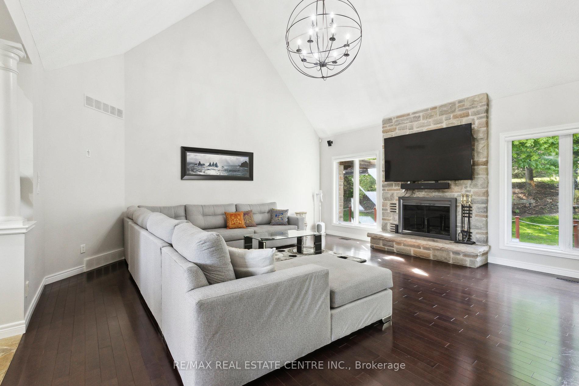 Welcome to your dream home, ideally located in the sought-after Fox Run neighborhood, just south of Guelph and only minutes from Highway401. This home with a total of living space of 5.579 Sq. Ft perfectly blends elegance, comfort, and endless potential. As you approach the stately driveway, you will notice the flagstone pathway, a wrought iron gate, and a striking stone archway that leads to the backyard, featuring a single car garage and a double car garage. Step inside the grand foyer, adorned with soaring 11-foot ceilings and slate flooring, which offers clear sightline into the beautifully appointed living and dining areas. The main living room is a showstopper, boasting 23-foot cathedral ceilings and a dramatic stone fireplace ideal for entertaining or relaxing with family. The gourmet kitchen is a chefs dream, featuring exquisite granite countertops, custom maple cabinetry, and high-end finishes. It includes two refrigerators and a charming breakfast bar, making it not only functional but also a warm space for culinary creativity. The main level offers spacious rooms that flow seamlessly into one another, with the primary suite serving as a true sanctuary, highlighted by soaring ceilings, an expansive walk-in closet, and a luxurious spa-inspired ensuite. The basement is an entertainers paradise, boasting a custom bar complete with a sink, a walk-in wine cellar, and a spacious recreation/games room. It also includes an additional bedroom, a full bathroom, and a private exercise room. Additionally, there is nearly 1,000 square feet of unfinished space in the utility area, providing excellent versatility for future customization. Don’t miss your opportunity to own this remarkable property
