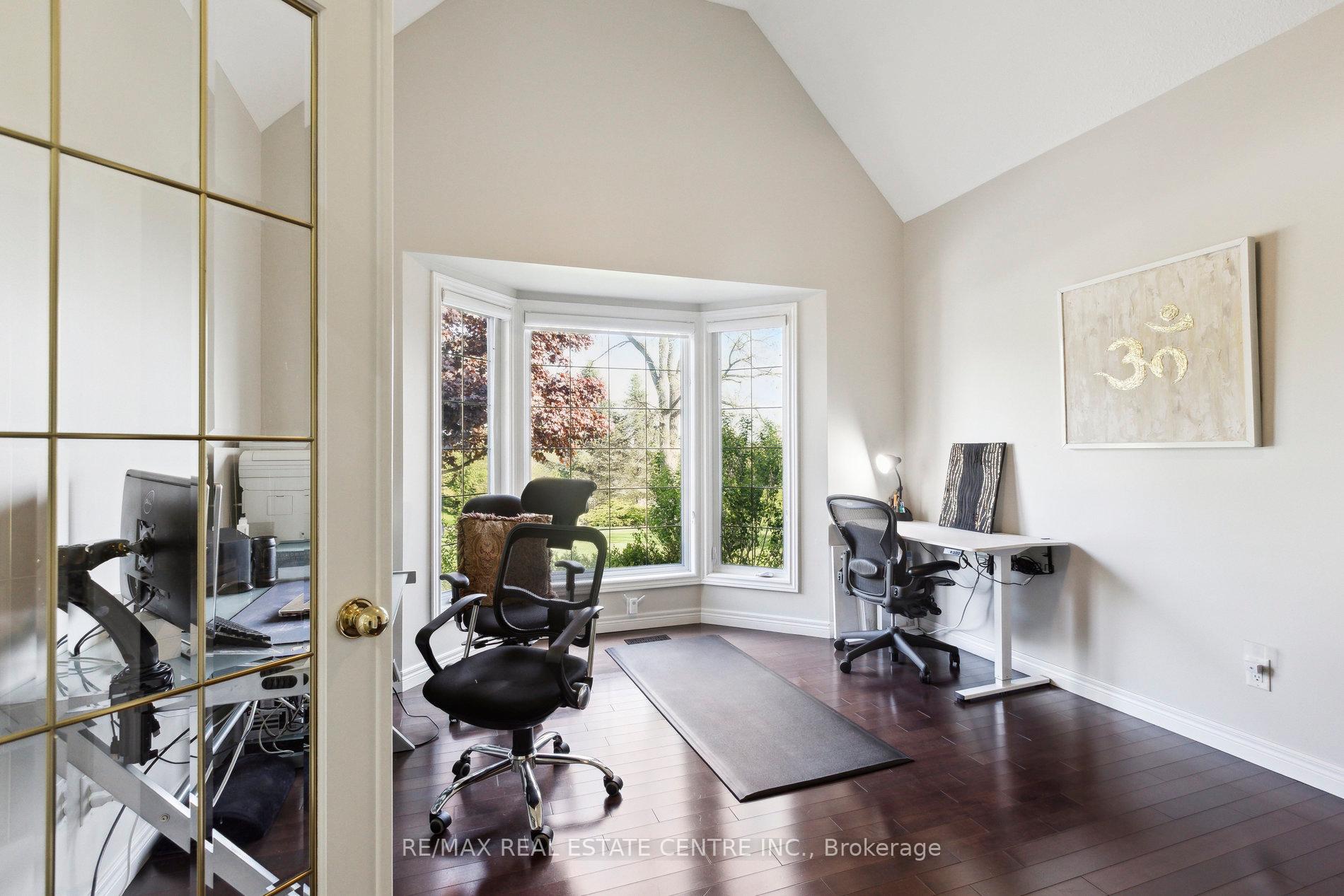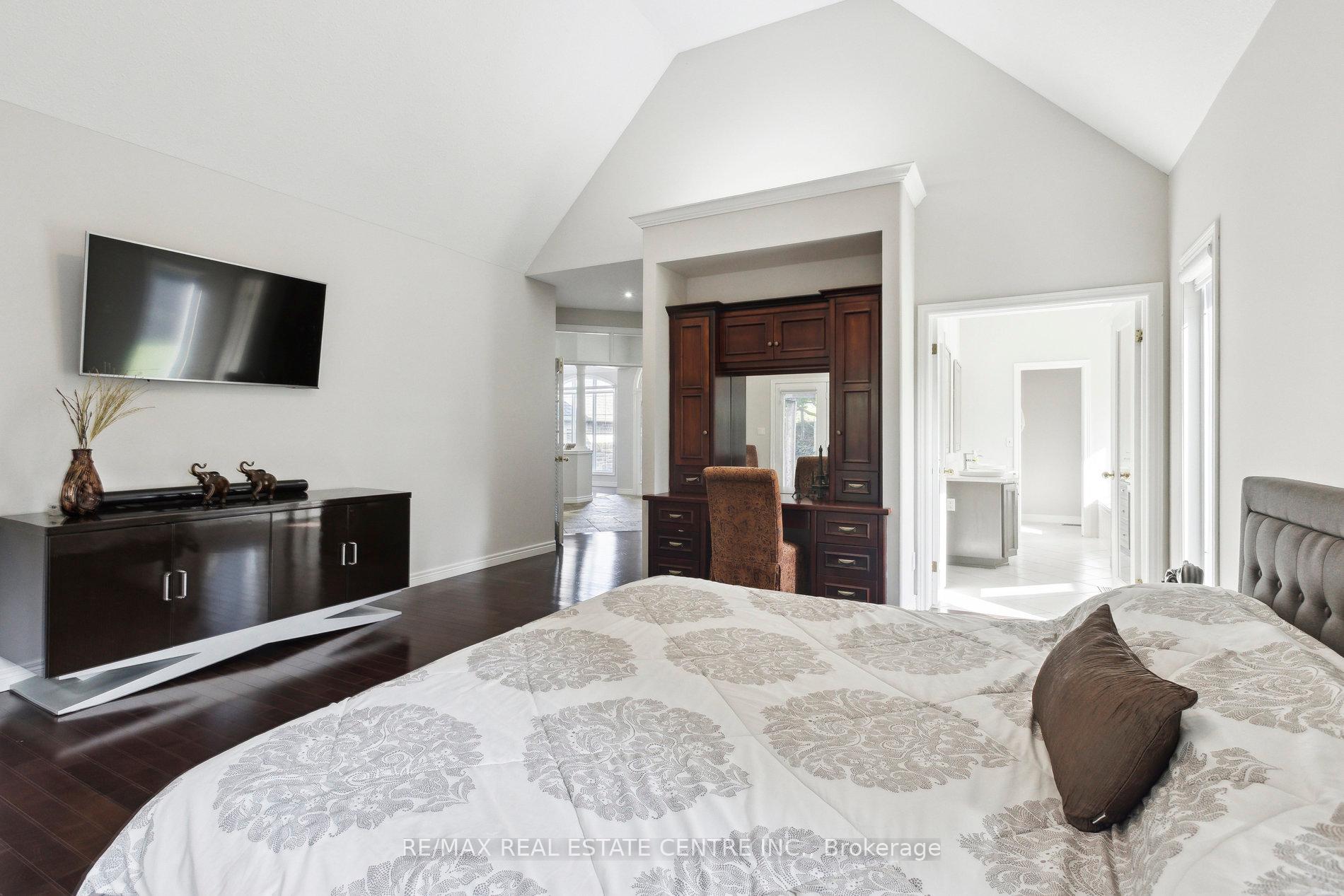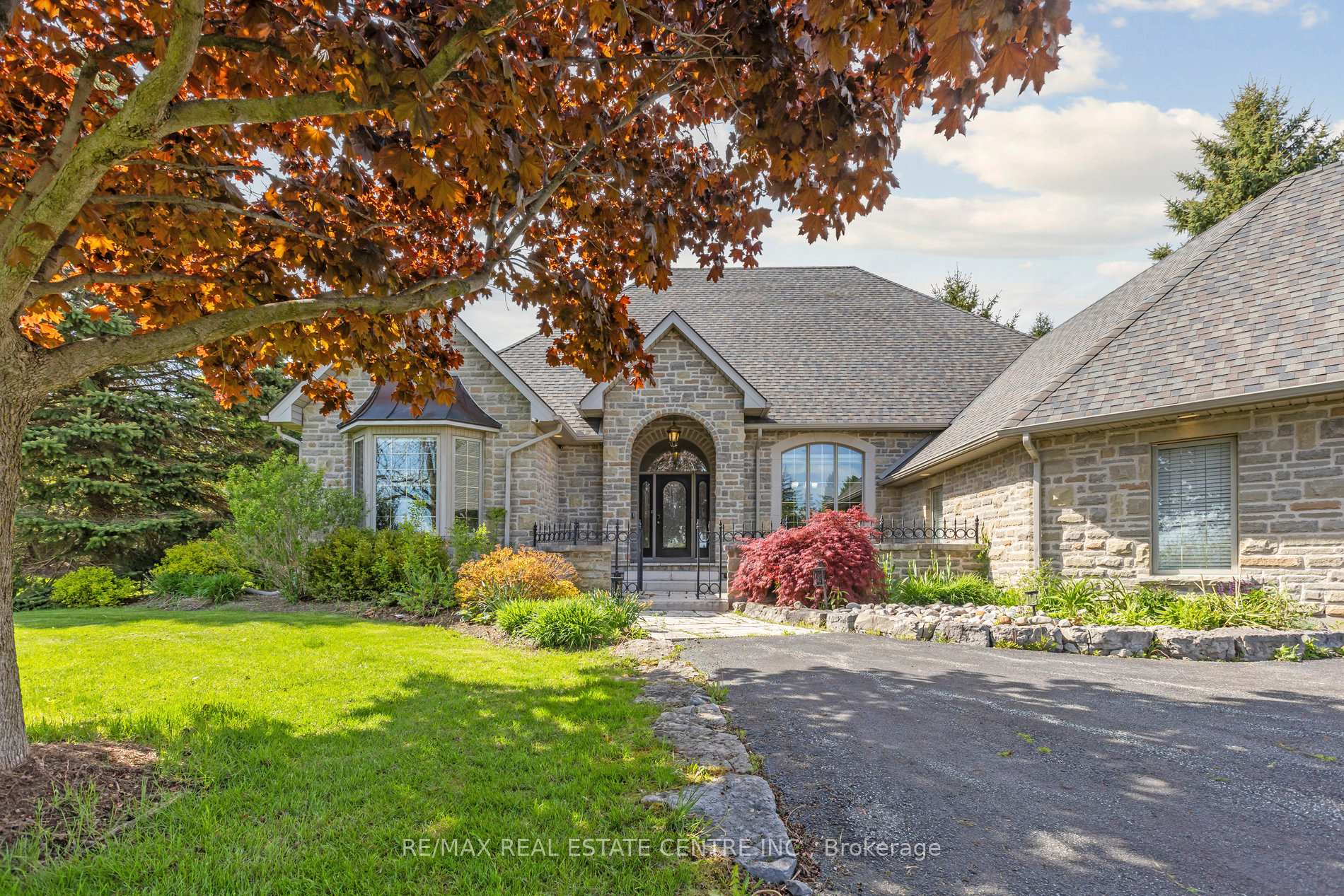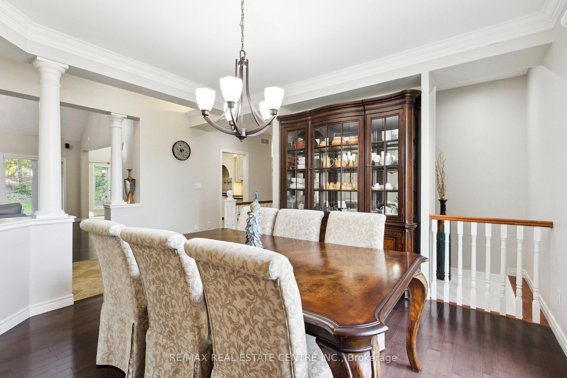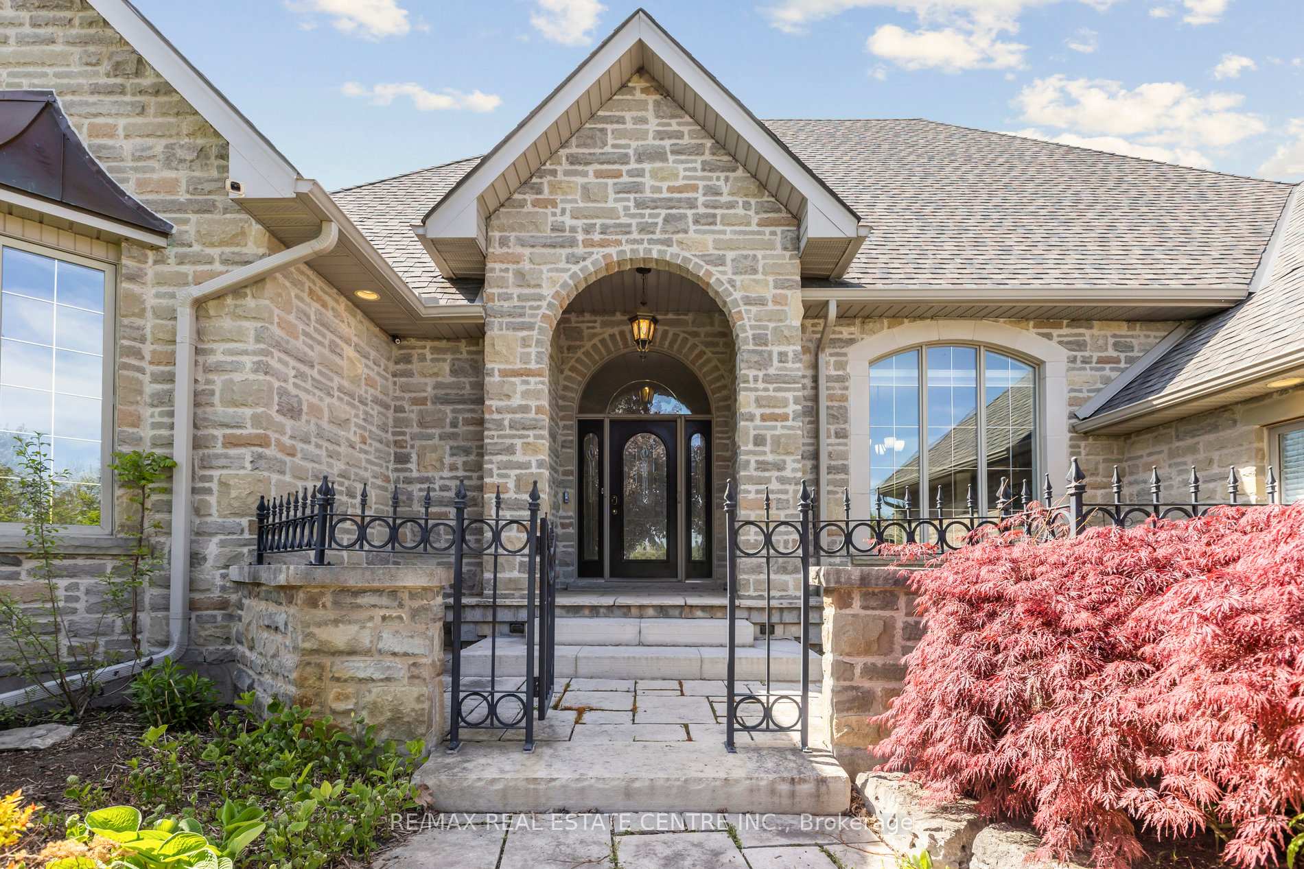 Welcome to your dream home, ideally located in the sought-after Fox Run neighborhood, just south of Guelph and only minutes from Highway401. This home with a total of living space of 5.579 Sq. Ft perfectly blends elegance, comfort, and endless potential. As you approach the stately driveway, you will notice the flagstone pathway, a wrought iron gate, and a striking stone archway that leads to the backyard, featuring a single car garage and a double car garage. Step inside the grand foyer, adorned with soaring 11-foot ceilings and slate flooring, which offers clear sightline into the beautifully appointed living and dining areas. The main living room is a showstopper, boasting 23-foot cathedral ceilings and a dramatic stone fireplace ideal for entertaining or relaxing with family. The gourmet kitchen is a chefs dream, featuring exquisite granite countertops, custom maple cabinetry, and high-end finishes. It includes two refrigerators and a charming breakfast bar, making it not only functional but also a warm space for culinary creativity. The main level offers spacious rooms that flow seamlessly into one another, with the primary suite serving as a true sanctuary, highlighted by soaring ceilings, an expansive walk-in closet, and a luxurious spa-inspired ensuite. The basement is an entertainers paradise, boasting a custom bar complete with a sink, a walk-in wine cellar, and a spacious recreation/games room. It also includes an additional bedroom, a full bathroom, and a private exercise room. Additionally, there is nearly 1,000 square feet of unfinished space in the utility area, providing excellent versatility for future customization. Don’t miss your opportunity to own this remarkable property