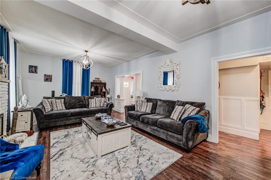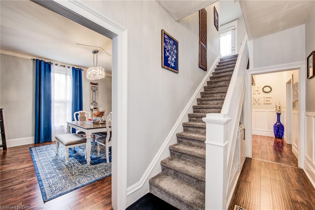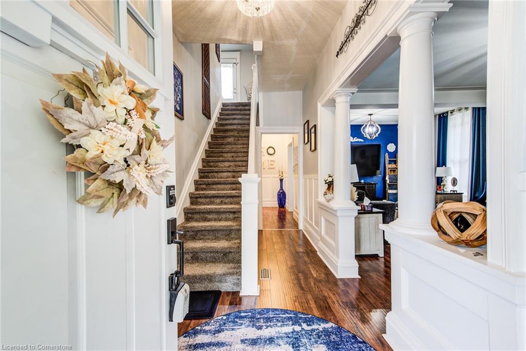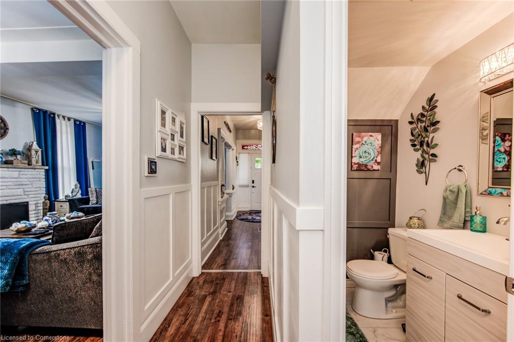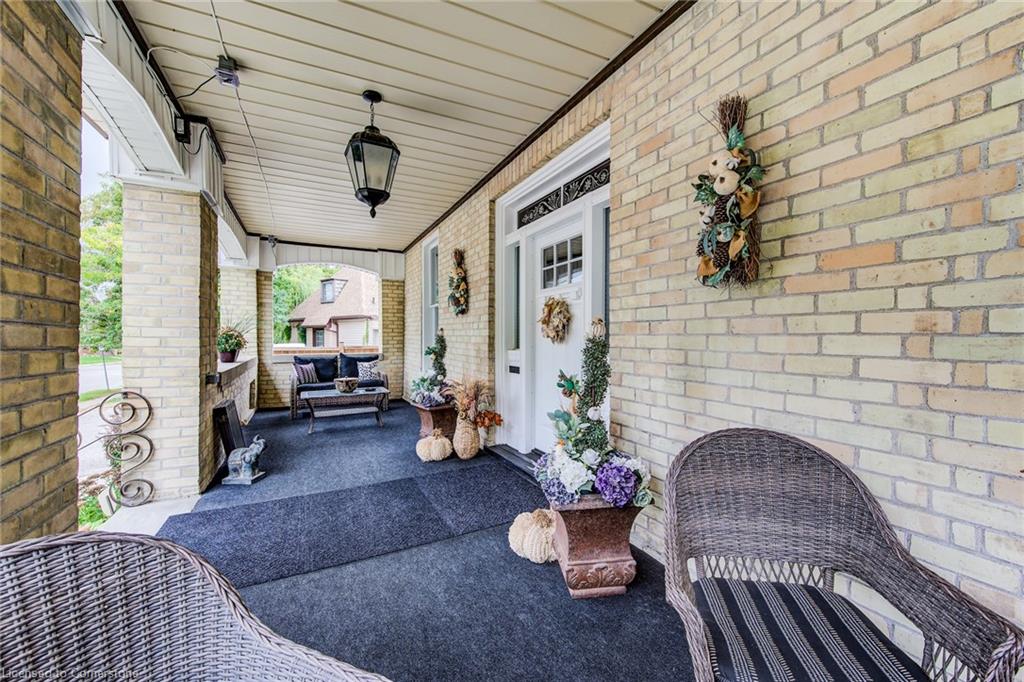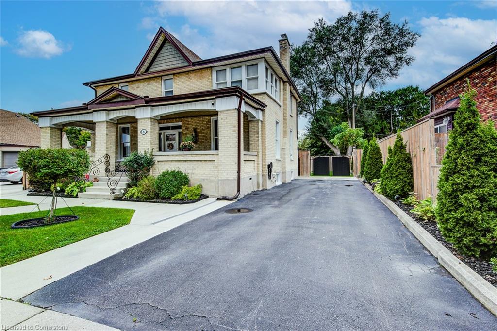 RENOVATED BEAUTY IN A STORYBOOK SETTING. Welcome to 6 Oak Street, where modern elegance meets timeless Victorian charm. From the inviting front porch to the original stunning trim and baseboards, this beautifully renovated 2-storey home seamlessly blends classic character with contemporary upgrades. Surrounded by lush gardens and mature trees on a picturesque, lamppost-lined street, this home offers over 2,250 sqft. Step into the bright foyer, which leads to the formal living room, complete with a fireplace, and an elegant dining room adorned with crown molding, and wide baseboards. The breakfast room offers the perfect nook for working from home or a convenient homework station and is open to the fully renovated kitchen. No detail was spared here, featuring elegant tile flooring, matching quartz countertops, a subway tile backsplash with accent tiles, ample cabinet space, and a convenient eat-in island. Just off the kitchen, step outside to the newly paved patio, complete with UV light panels, making it ideal for entertaining. The fully fenced backyard includes a gas barbecue line and a hydro-powered storage shed. A stylish powder room completes the main level. Upstairs, the second floor boasts 3 generously sized bedrooms and 2 full bathrooms. The primary suite features a spacious walk-in closet and a luxurious 4pc ensuite, complete with a double-sink vanity and a glass-enclosed, tiled walk-in shower. The partially finished basement offers a cozy rec room, laundry area, and plenty of potential for additional living space or extra storage. Notable features and updates include a new roof (2017), furnace (2017) and AC (2019), wainscoting, updated electrical and plumbing, water softener, reverse osmosis system, and ample parking. Meticulously maintained, this home is just a short walk from the vibrant downtown core, shops, trails, and the iconic Gaslight District. With easy access to schools, amenities, and Highway 8, this home truly has it all.