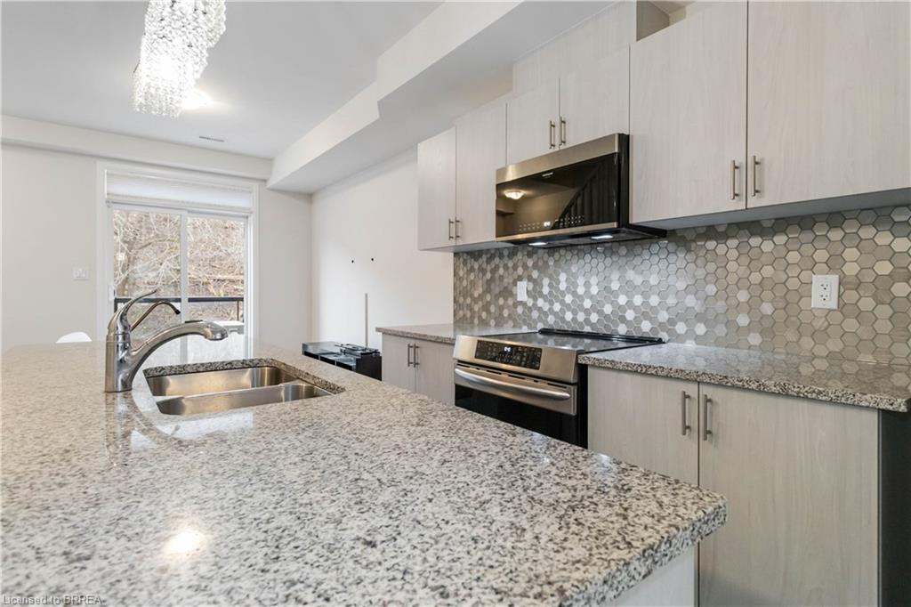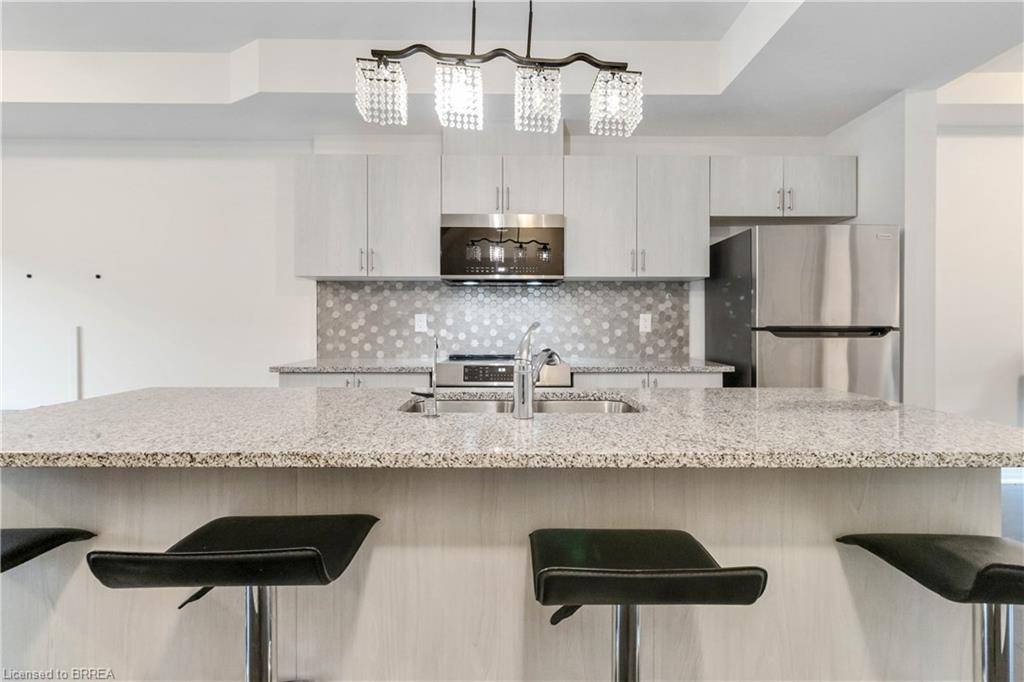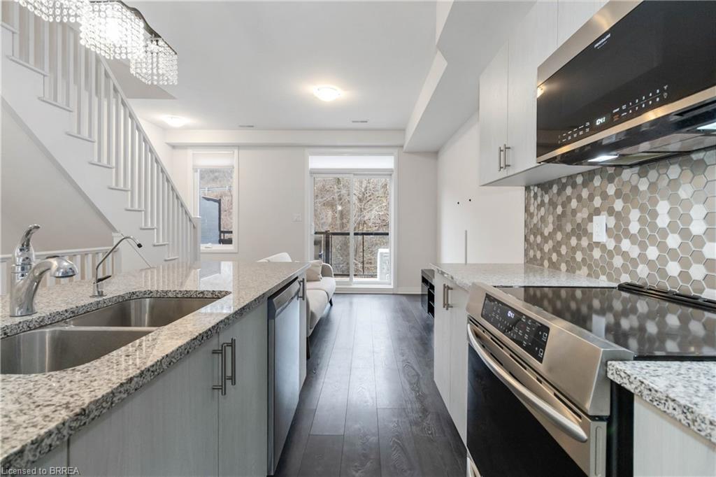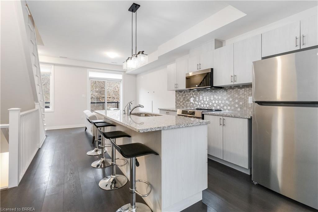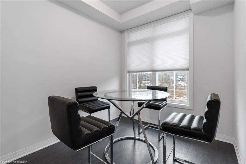 Inside, the open-concept main floor is designed for everyday comfort and easy entertaining. Enjoy a gourmet kitchen featuring stainless steel appliances, granite countertops, and a large island with bar seating, flowing seamlessly into the dining area with beautiful Grand River views. Thoughtfully selected upgrades throughout add a polished, move-in-ready feel. Remote control blinds on most windows.