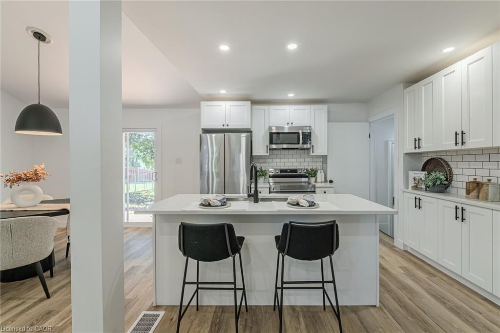 Welcome to 60 Alexander Avenue, Cambridge — a beautifully updated home nestled in a quiet, family-oriented neighbourhood. Set on a large lot with mature trees and plenty of outdoor space, this property perfectly balances modern updates with comfort and functionality. Step inside to a bright and inviting main floor featuring all-new flooring and a spacious open-concept layout. The modern kitchen has been tastefully renovated with updated cabinetry, sleek countertops, and stainless steel appliances, creating a perfect hub for cooking and entertaining. Both bathrooms have been thoughtfully updated with fresh finishes, adding a touch of style and convenience for today’s lifestyle. Recent upgrades ensure peace of mind for years to come, including new windows, roof, garage doors, rear deck, and patio door — all contributing to the home’s fresh, move-in-ready appeal. The double car garage and extended driveway provide ample parking and storage space, ideal for families or those with multiple vehicles. The separate basement entrance offers excellent potential for an in-law suite or income-generating rental unit, adding flexibility for investors or multi-generational living. Outside, the large backyard provides plenty of room for kids, pets, or outdoor entertaining on the new deck and patio area. Located in a peaceful, well-established community, 60 Alexander Avenue offers easy access to nearby schools, parks, shopping, and major commuter routes — making it an ideal place to call home.