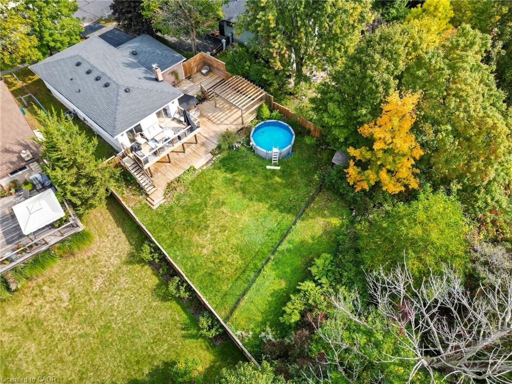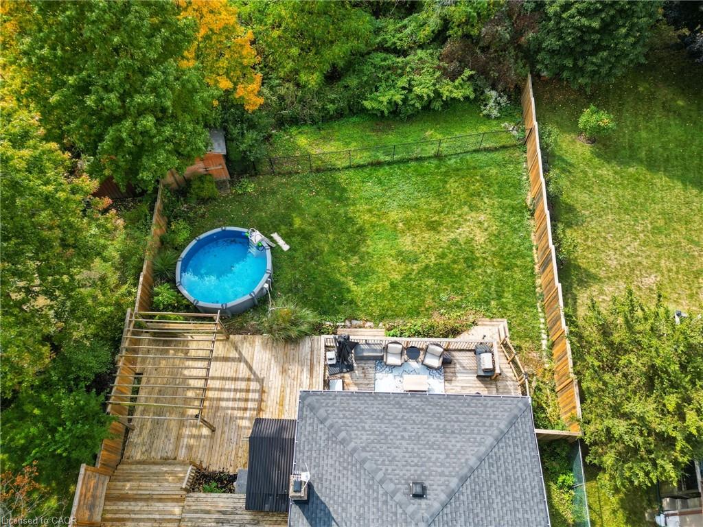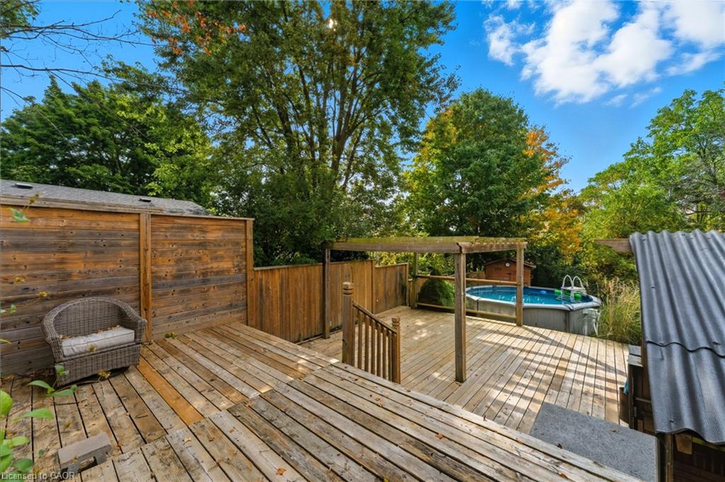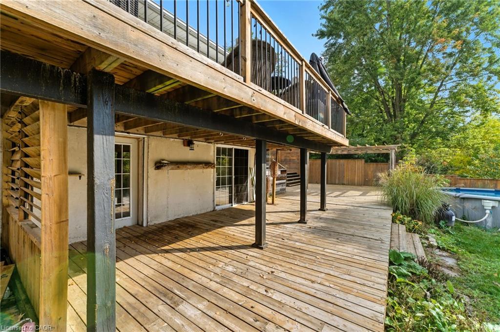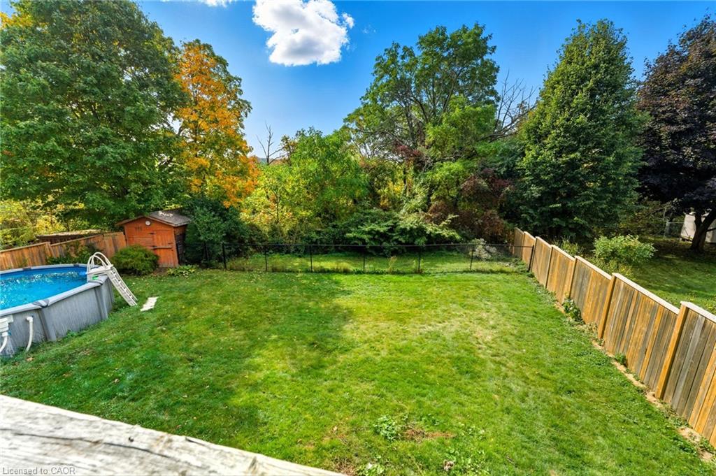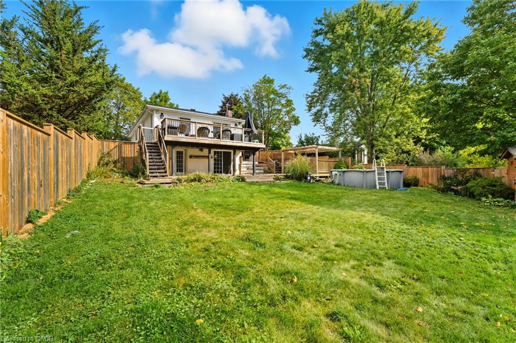 Prime location and spacious home! In the family friendly and desirable area of north Hespeler, minutes to the core, trails, and the highway! Walk out basement, backing onto beautiful green space! 4 bedrooms, 2 bathrooms. 1 car garage and parking for 4 cars in the driveway! Welcoming porch, spacious foyer, the main floor is spacious open and bight, featuring newer flooring, and two new front windows. The heart of the home is the open kitchen, dining, and living room area, but this backyard is a true dream. Convienient main floor primary bedroom with sliding patio doors to the deck, large walk in closet, en suite privilege, and an additional main floor bedroom. The basement is large and has Inlaw suite potential, featuring 2 additional bedrooms, a 3 piece bathroom, laundry room, and a very large rec room with gas fireplace and sliding patio door out to this amazing deck and yard!! UPDATES include: Furnace and AC (2019), Roof shingles (2019), above ground pool and pool equipment (2020), water softener (2024), appliances within past 5 years (except for the fridge), hot water heater (2024), back fence (2020) (the backyard extends to the furthest fence this black fence was so the pool was compliant. — Beautiful back deck and yard, truly amazing. Book your showing ASAP!