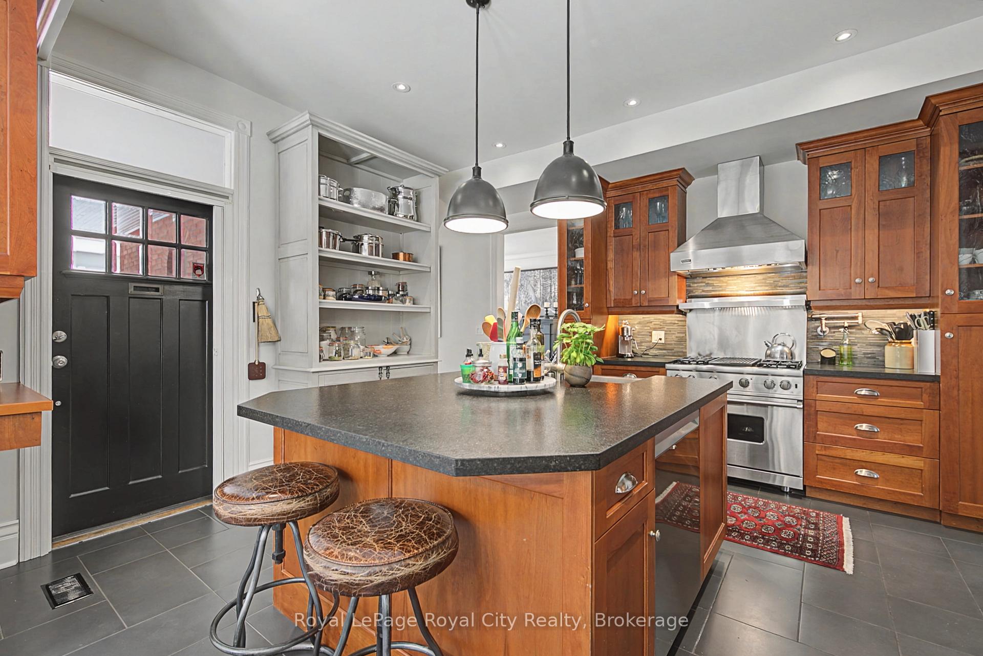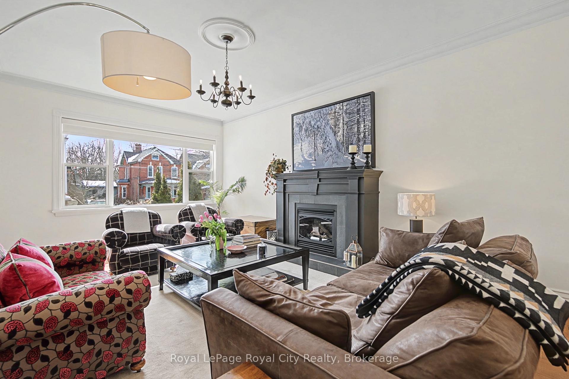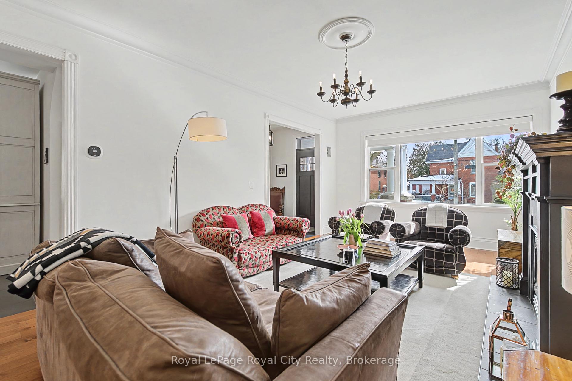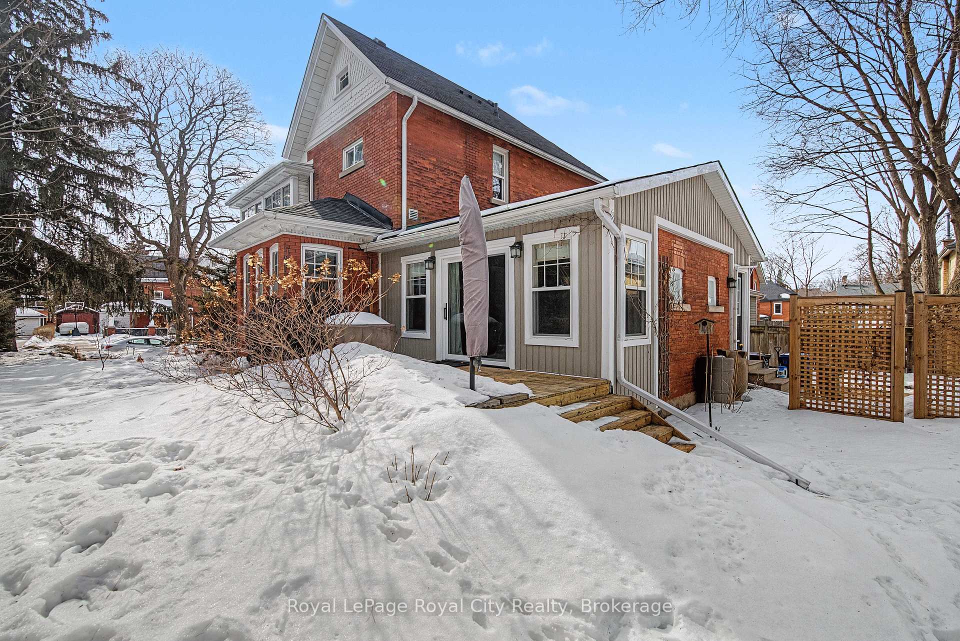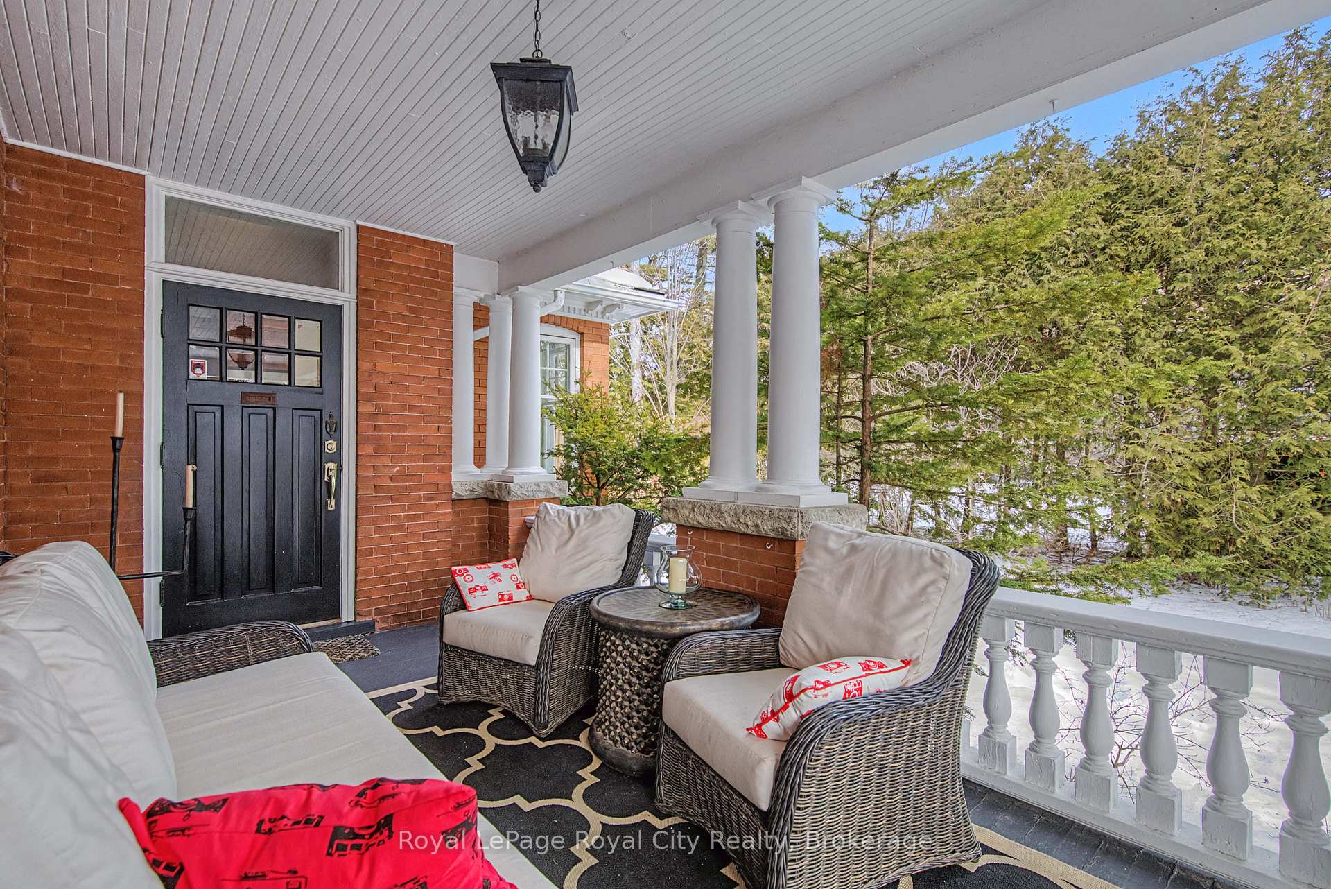 This exquisite century brick two-story home, set on one of Guelph’s most desirable streets, greets you with an immediate sense of charm. Ideally located within walking distance to downtown, the market, cafés, shopping, schools, parks and more, this gem offers an unbeatable lifestyle. Start your mornings or unwind in the evenings on the gorgeous wrap-around covered porch-perfect for coffee, a book, or a glass of wine. The mature landscaping and fenced yard provide privacy, whether you’re relaxing on the porch or enjoying the private deck off the family room. Inside, the main level welcomes you with a formal living room, a focal fireplace, formal dining room and a beautifully renovated kitchen featuring a large center island-perfect for entertaining with a walkout to the porch. At the rear, the family room is a standout, adorned with exquisite millwork and built-in cabinetry. Upstairs, you’ll find three spacious bedrooms, including a primary suite with a luxurious ensuite. The upper level also boasts a nicely finished four-piece bath and a bright, wrap-around window office-ideal for remote work. Every detail has been meticulously cared for-mechanicals, finishes, and updates-all ensuring this home is truly move-in ready. Pride of ownership is evident, and the sellers, who are returning to the UK, have loved this home. Soon, it will be yours to cherish. Homes like this are truly few and far between-don’t miss your chance!