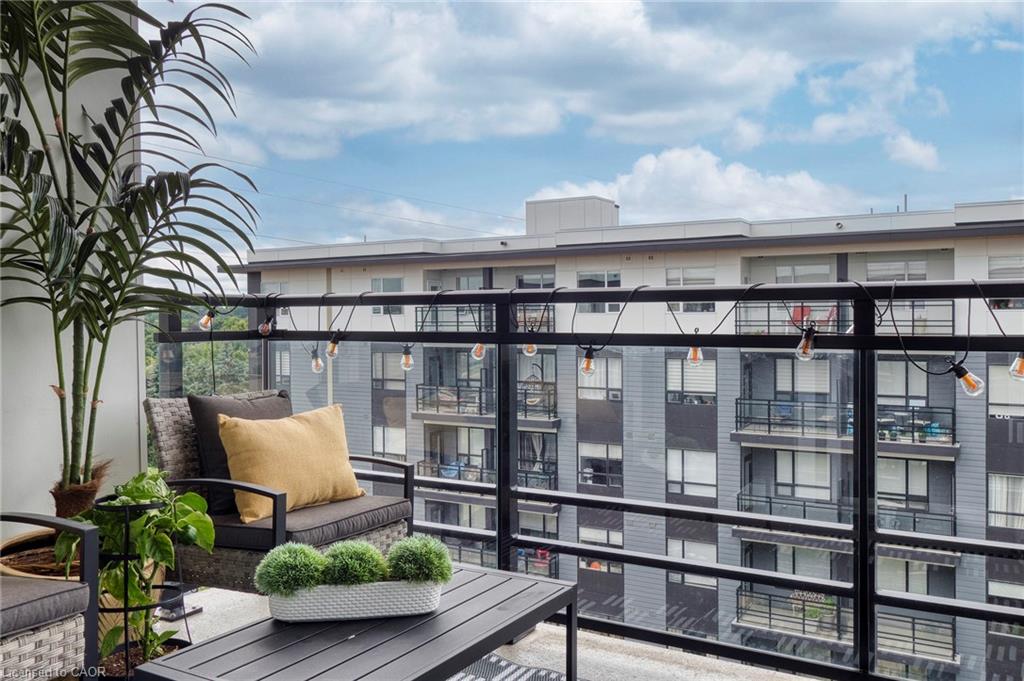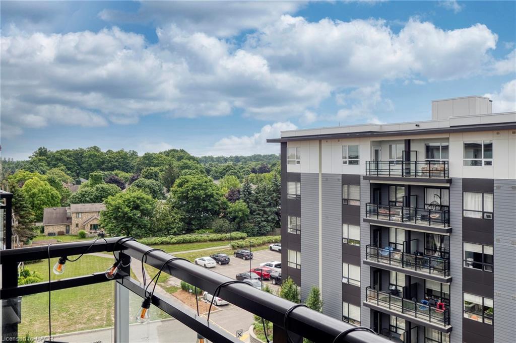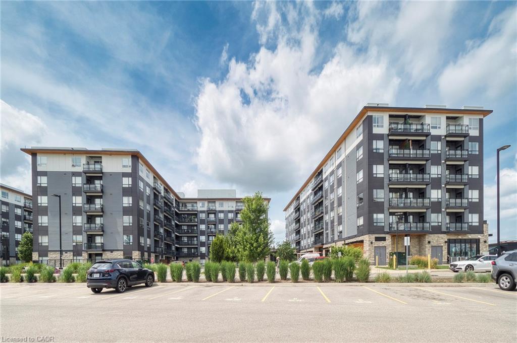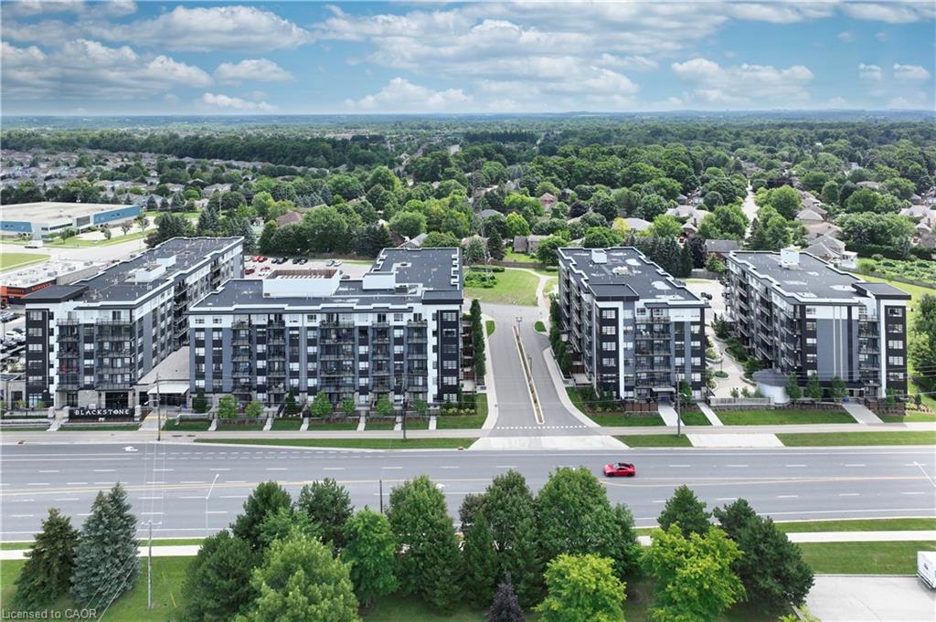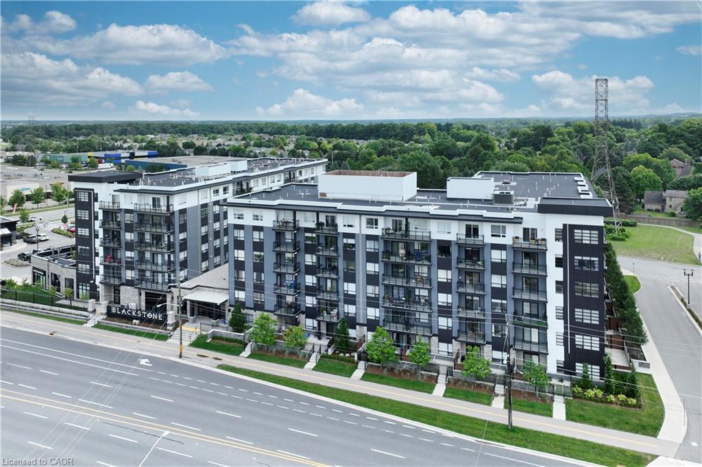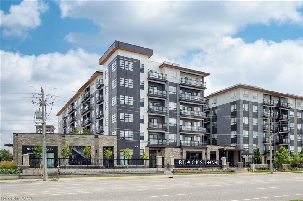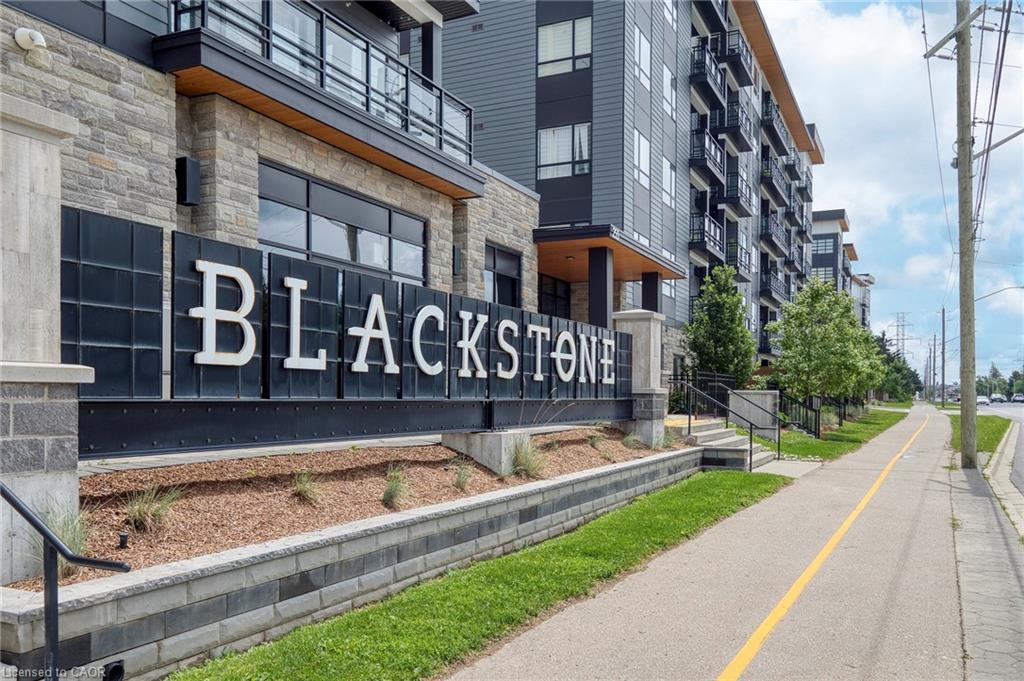 Make this penthouse-level condo your own! Sitting on the top floor of the modern and stylish Blackstone Condos building, this condo delivers the space, view, finishes, amenities, and location that make it an exceptional place to call home. As one of the largest 1-bedroom layouts in the building and only offered on the 6th floor, this condo provides 581 interior, and 62 exterior, square footage. Notice sky views from inside the condo, or step onto the balcony to enjoy the 180-degree sky view. Inside the unit, enjoy a list of upgrades that include a custom kitchen with extended upper cabinets, quartz countertops, subway tile backsplash, undermount double sink with pull-down chef’s faucet, stylish black handles and pulls, stainless-steel appliances, and kitchen island with built-in microwave, breakfast bar, and storage. Discover upgrades to the bathroom including walk-in shower, matte black fixtures, custom shower door, drawers in the vanity, and additional storage feature. Set the mood with dimmable main-area potlights and dimmable overhead lighting in the bedroom, and gain privacy with custom window blinds. Keep organized and tidy with a walk-in closet provided in the bedroom, stacked laundry insuite, and front-hall closet. Notice that this unit is carpet-free! Make use of the stunning lounge room for work meetups, social hangouts, or quiet work time. Offering bar and prep area, fireplace, board-room tables, and conversation cubicles, the lounge is versatile and impressive. Also provided: fitness and study rooms, bike storage with repair station, dog wash, and two outdoor lounges with bbq and hot tub. On the ground level, find bakery, beauty salon, restaurants, pub, and dental at your convenience. Just a short drive, bike, or bus to RIM Park, this location allows close proximity to the Region of Waterloo’s top recreation facility with its nearby ball diamonds, soccer fields, indoor turf, basketball courts, beach volleyball courts, skating rinks, and fitness centre.