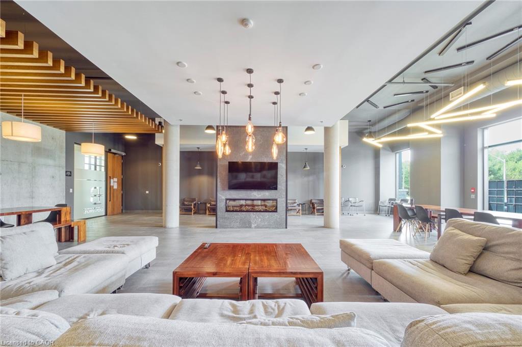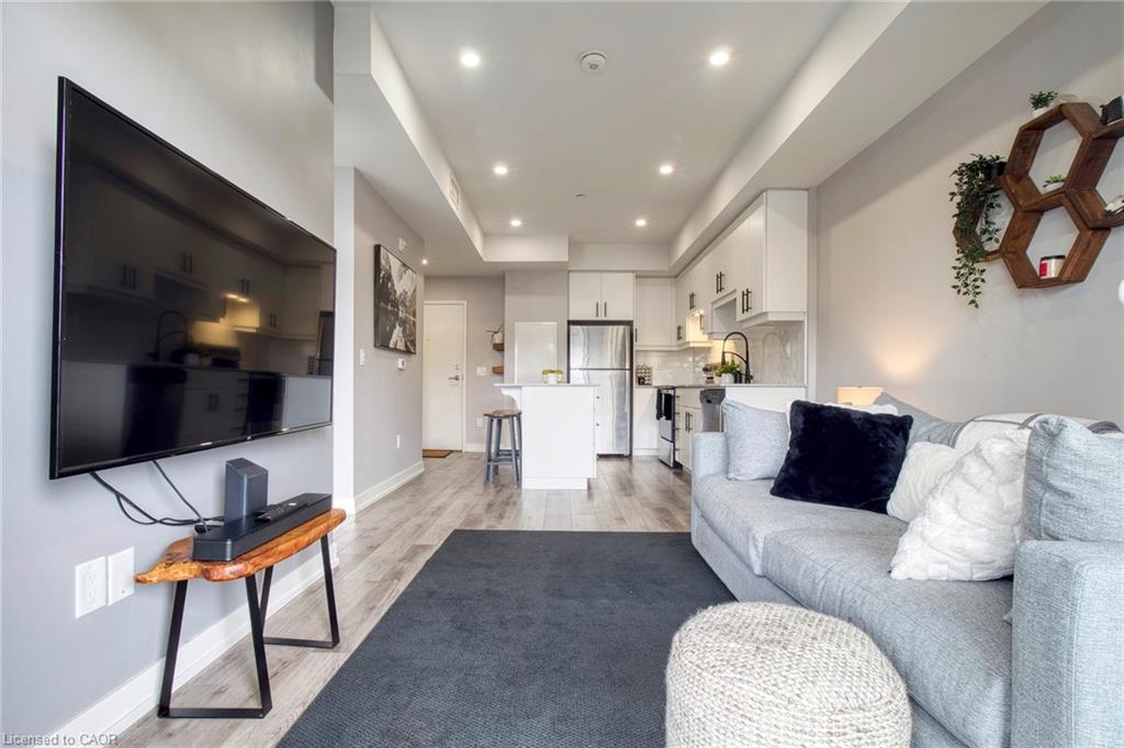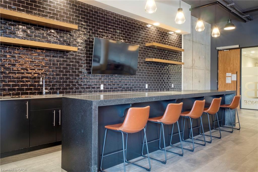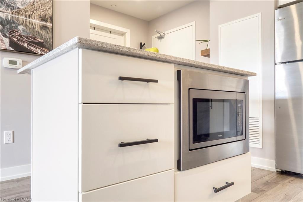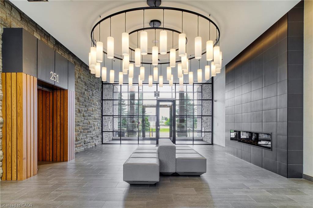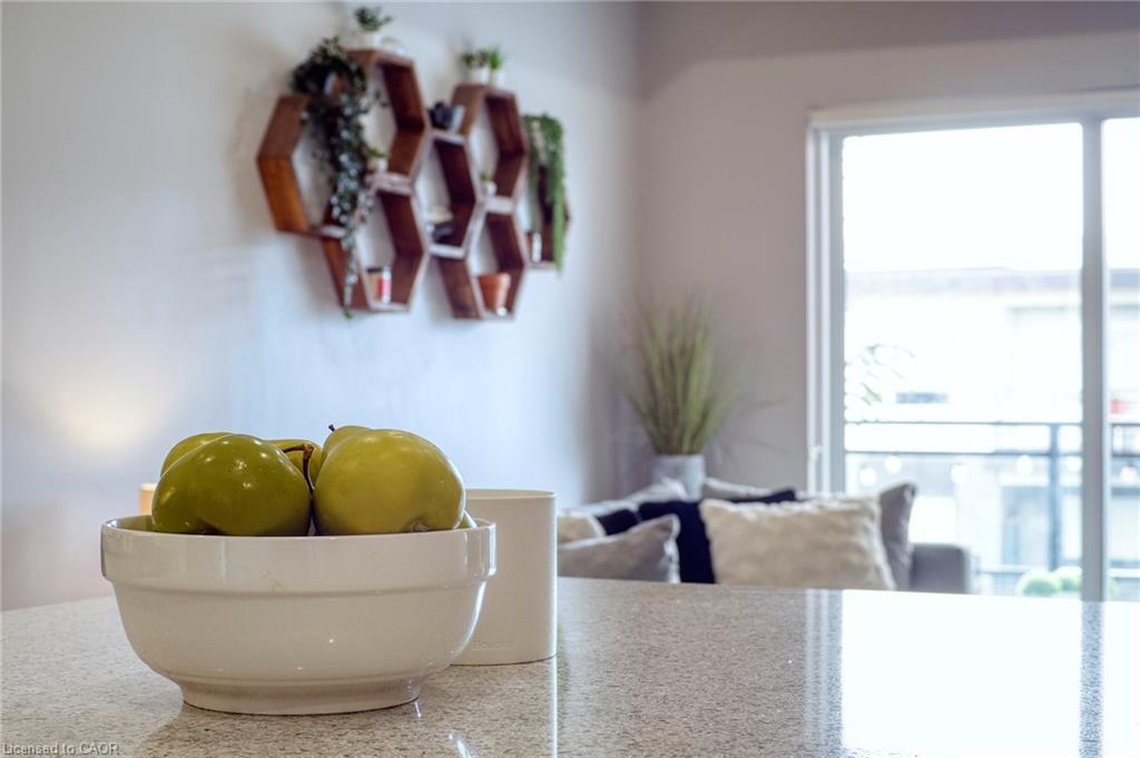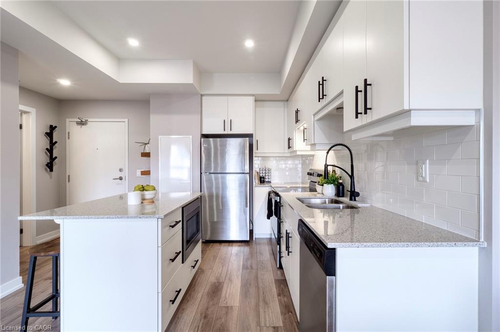Make this penthouse-level condo your own! Sitting on the top floor of the modern and stylish Blackstone Condos building, this condo delivers the space, view, finishes, amenities, and location that make it an exceptional place to call home. As one of the largest 1-bedroom layouts in the building and only offered on the 6th floor, this condo provides 581 interior, and 62 exterior, square footage. Notice sky views from inside the condo, or step onto the balcony to enjoy the 180-degree sky view. Inside the unit, enjoy a list of upgrades that include a custom kitchen with extended upper cabinets, quartz countertops, subway tile backsplash, undermount double sink with pull-down chef’s faucet, stylish black handles and pulls, stainless-steel appliances, and kitchen island with built-in microwave, breakfast bar, and storage. Discover upgrades to the bathroom including walk-in shower, matte black fixtures, custom shower door, drawers in the vanity, and additional storage feature. Set the mood with dimmable main-area potlights and dimmable overhead lighting in the bedroom, and gain privacy with custom window blinds. Keep organized and tidy with a walk-in closet provided in the bedroom, stacked laundry insuite, and front-hall closet. Notice that this unit is carpet-free! Make use of the stunning lounge room for work meetups, social hangouts, or quiet work time. Offering bar and prep area, fireplace, board-room tables, and conversation cubicles, the lounge is versatile and impressive. Also provided: fitness and study rooms, bike storage with repair station, dog wash, and two outdoor lounges with bbq and hot tub. On the ground level, find bakery, beauty salon, restaurants, pub, and dental at your convenience. Just a short drive, bike, or bus to RIM Park, this location allows close proximity to the Region of Waterloo’s top recreation facility with its nearby ball diamonds, soccer fields, indoor turf, basketball courts, beach volleyball courts, skating rinks, and fitness centre.