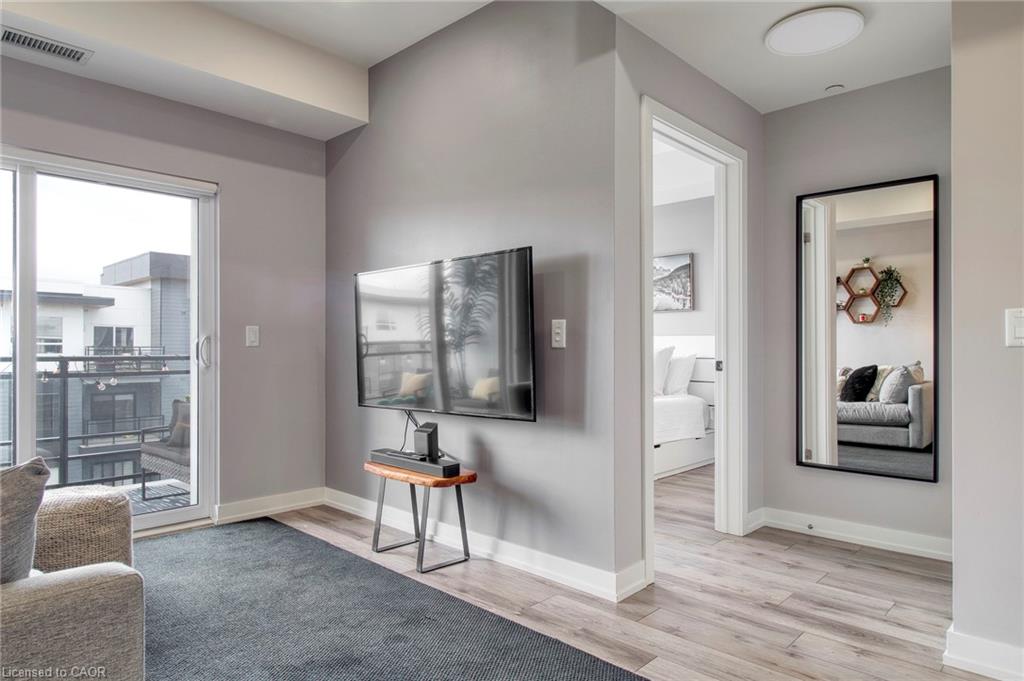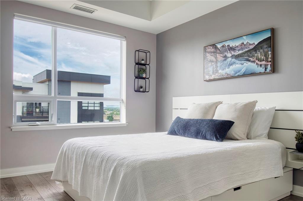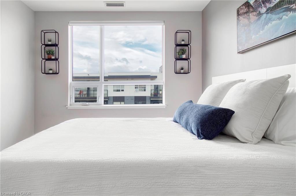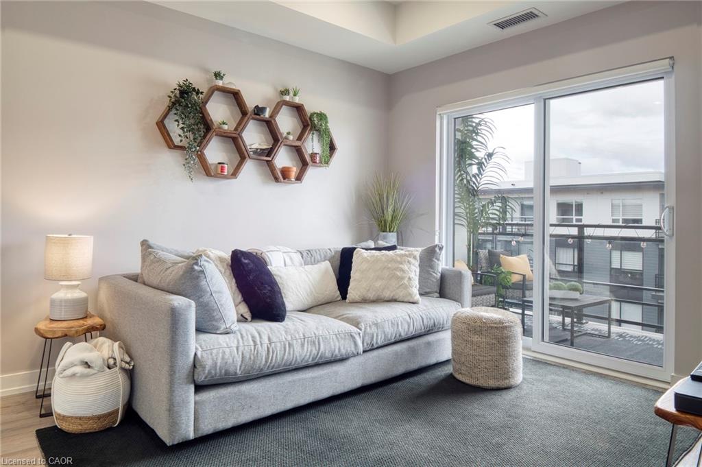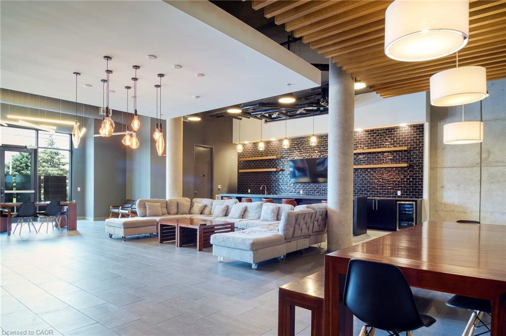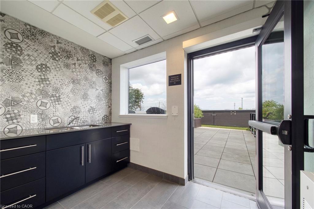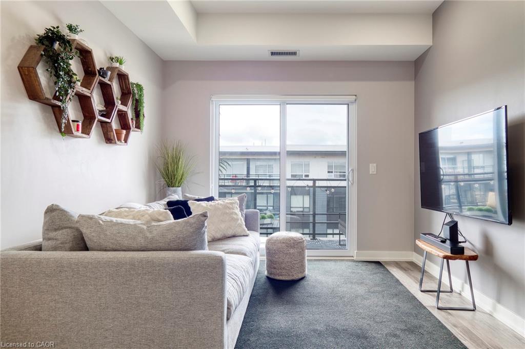 Make this penthouse-level condo your own! Sitting on the top floor of the modern and stylish Blackstone Condos building, this condo delivers the space, view, finishes, amenities, and location that make it an exceptional place to call home. As one of the largest 1-bedroom layouts in the building and only offered on the 6th floor, this condo provides 581 interior, and 62 exterior, square footage. Notice sky views from inside the condo, or step onto the balcony to enjoy the 180-degree sky view. Inside the unit, enjoy a list of upgrades that include a custom kitchen with extended upper cabinets, quartz countertops, subway tile backsplash, undermount double sink with pull-down chef’s faucet, stylish black handles and pulls, stainless-steel appliances, and kitchen island with built-in microwave, breakfast bar, and storage. Discover upgrades to the bathroom including walk-in shower, matte black fixtures, custom shower door, drawers in the vanity, and additional storage feature. Set the mood with dimmable main-area potlights and dimmable overhead lighting in the bedroom, and gain privacy with custom window blinds. Keep organized and tidy with a walk-in closet provided in the bedroom, stacked laundry insuite, and front-hall closet. Notice that this unit is carpet-free! Make use of the stunning lounge room for work meetups, social hangouts, or quiet work time. Offering bar and prep area, fireplace, board-room tables, and conversation cubicles, the lounge is versatile and impressive. Also provided: fitness and study rooms, bike storage with repair station, dog wash, and two outdoor lounges with bbq and hot tub. On the ground level, find bakery, beauty salon, restaurants, pub, and dental at your convenience. Just a short drive, bike, or bus to RIM Park, this location allows close proximity to the Region of Waterloo’s top recreation facility with its nearby ball diamonds, soccer fields, indoor turf, basketball courts, beach volleyball courts, skating rinks, and fitness centre.
