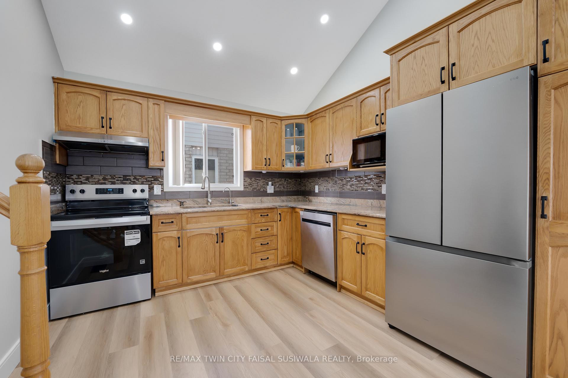 WELL-MAINTAINED BACKSPLIT OFFERING SPACE, LIGHT & ROOM TO GROW. Welcome to 640 Langlaw Drive, a beautifully maintained 4-level backsplit tucked into a quiet, family-friendly Cambridge neighbourhood, just steps from schools and parks. Offering over 1,747 sq ft of finished living space, this home strikes the perfect balance of functionality and room to grow. From the moment you step inside, you’ll appreciate the bright, open layout highlighted by updated flooring, modern lighting, and a natural, welcoming flow throughout. The spacious main level features comfortable living and dining areas that connect seamlessly to the kitchen, complete with ample cabinetry, stainless steel appliances, and peaceful views of the backyard. Sliding doors off the dining area lead directly to the deck, ideal for indoor-outdoor living. Large windows throughout flood every level with natural light. This home offers 3 generously sized bedrooms and 2 full bathrooms, including a beautifully updated bath with contemporary finishes and a sleek glass shower. The lower level provides a cozy yet versatile family room, perfect for movie nights, a playroom, or a home office, while the finished basement adds even more flexible living space, ideal for a rec room, gym, or guest area. Step outside to a fully fenced backyard offering privacy and plenty of space for kids, pets, and summer entertaining. With an attached garage, private double driveway, and a layout that truly maximizes every square foot, this move-in-ready home is an excellent opportunity for families, or anyone seeking a well-cared-for property in an established community.