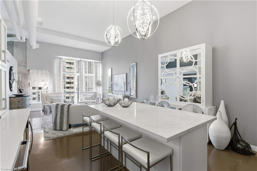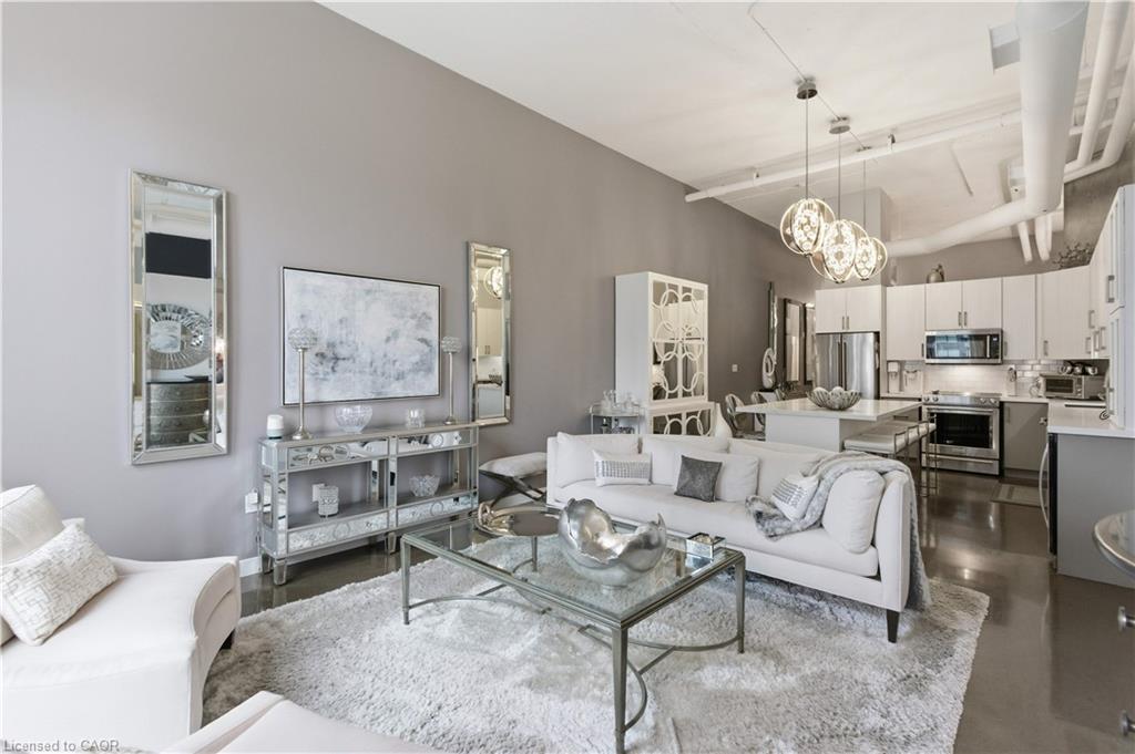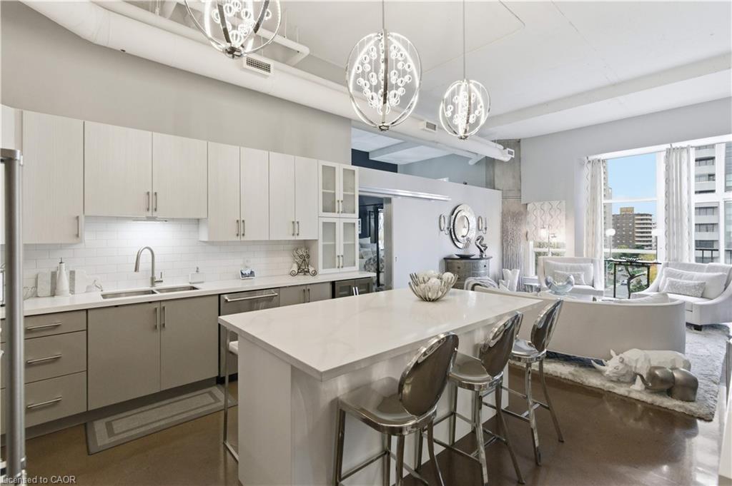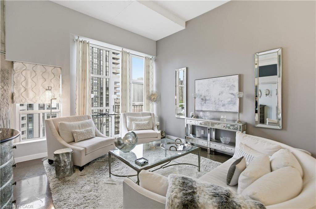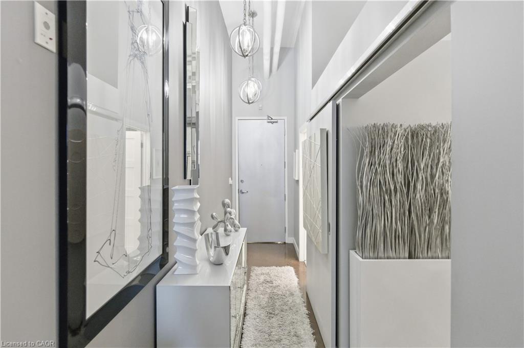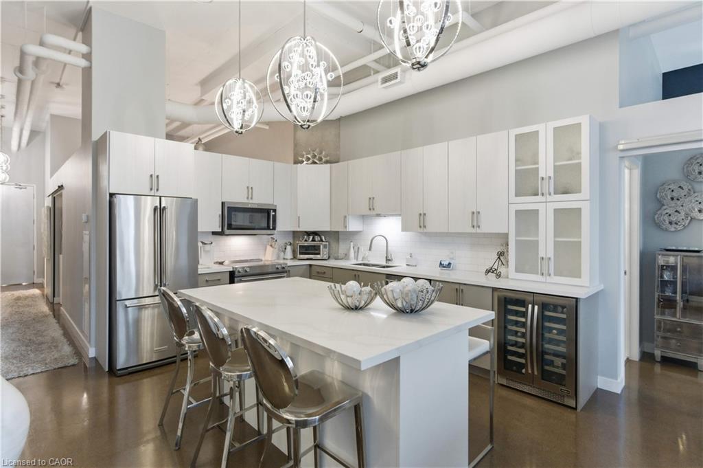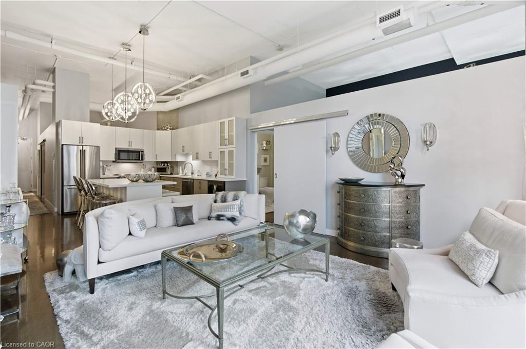 Welcome to Core Lofts – Hamilton’s premier loft condominium, ideally situated in the city’s coveted Durand neighbourhood. Once a former Bell Canada office building, this landmark conversion seamlessly blends industrial character w/ sophisticated urban design. This exceptional 1143 sq ft, 2-bdrm, 2-bath penthouse offers an elevated living experience w/ western exposure. Polished concrete floors, soaring 12.5′ ceil & expansive windows create a striking open-concept environment filled w/ natural light. The custom-reno’d kitch is a true showpiece, feat bespoke cabinetry, quartz counters, a stylish tiled backsplash, S/S app (incl a beverage fridge) & a large centre island w/ dual overhang seating for up to 8. The spacious liv rm opens to a Juliette balcony overlooking the city skyline, while the primary retreat feat an oversized closet, custom oversized wardrobe & a luxe upgraded 3-pc ensuite w/ an oversized glass shower & modern finishes. A 2nd bedroom, currently utilized as a den, provides flexibility for a home office or guest suite. The beautifully updated 4-pc main bath feat a tub/shower combo w/ a glass enclosure. Add highlights incl in-suite laundry, upgraded lighting, a tandem 2-car parking space (#59 PL-2 Lvl A), & an oversized storage locker (#23 on penthouse lvl). Steps away from access to a rooftop terrace w/ panoramic views of the city & topography, complete with BBQ areas & multiple seating zones. Add amenities incl a well-equipped gym, a stylish lobby, & a modern meeting room. Recent notable building improvements incl elevators, HVAC systems, & improved entry security. The location is second to none – steps to vibrant James St, the GO Station for easy commuting to Toronto, restaurants, shops, St. Joseph’s Hospital, & the Downtown Arts District. Walk to parks, trails, cafés, & everything downtown has to offer. This rare penthouse combines timeless industrial style, urban convenience, & luxe comfort – truly one of Hamilton’s most impressive loft residences.