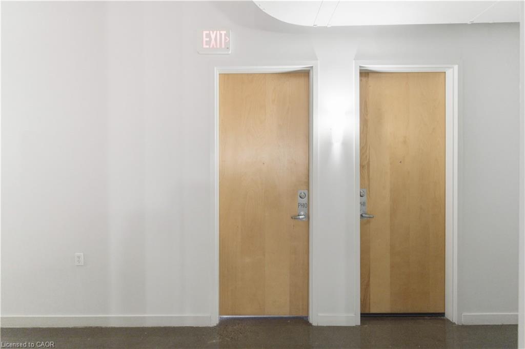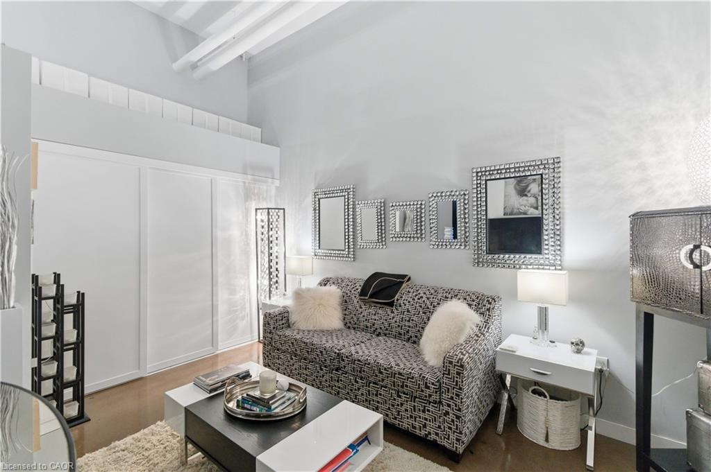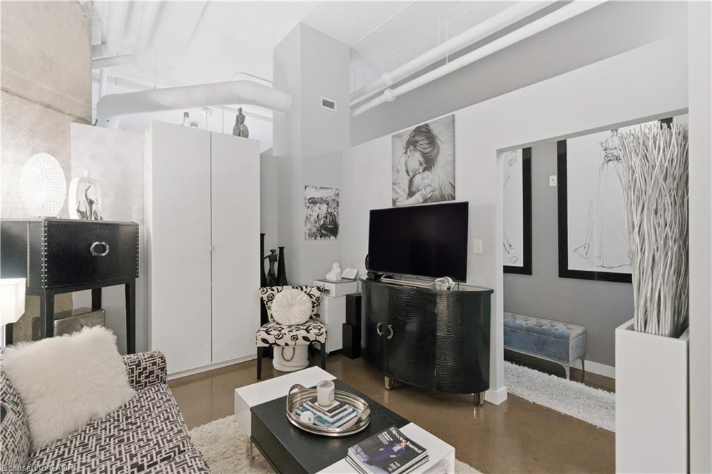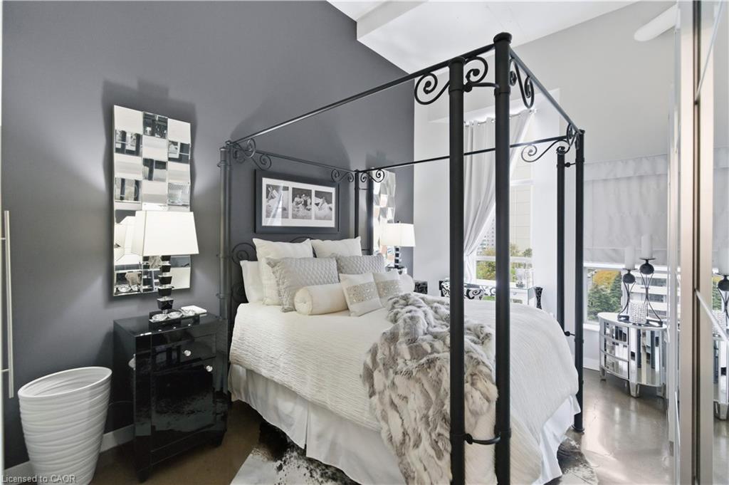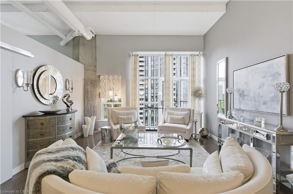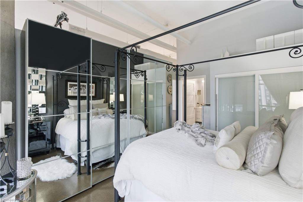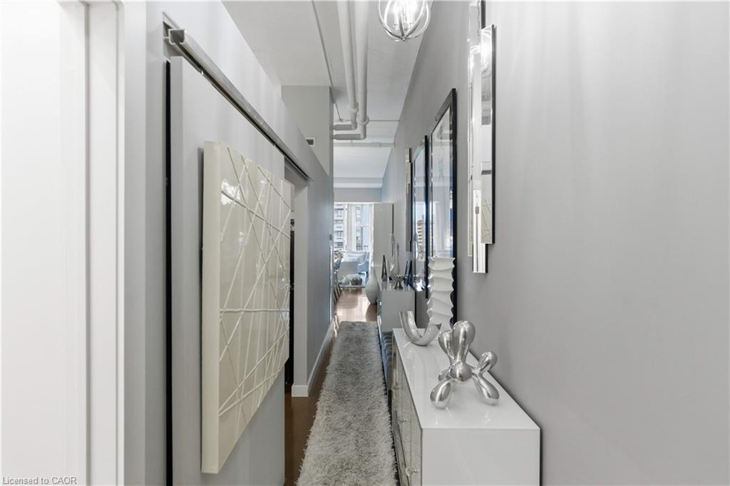 Welcome to Core Lofts – Hamilton’s premier loft condominium, ideally situated in the city’s coveted Durand neighbourhood. Once a former Bell Canada office building, this landmark conversion seamlessly blends industrial character w/ sophisticated urban design. This exceptional 1143 sq ft, 2-bdrm, 2-bath penthouse offers an elevated living experience w/ western exposure. Polished concrete floors, soaring 12.5′ ceil & expansive windows create a striking open-concept environment filled w/ natural light. The custom-reno’d kitch is a true showpiece, feat bespoke cabinetry, quartz counters, a stylish tiled backsplash, S/S app (incl a beverage fridge) & a large centre island w/ dual overhang seating for up to 8. The spacious liv rm opens to a Juliette balcony overlooking the city skyline, while the primary retreat feat an oversized closet, custom oversized wardrobe & a luxe upgraded 3-pc ensuite w/ an oversized glass shower & modern finishes. A 2nd bedroom, currently utilized as a den, provides flexibility for a home office or guest suite. The beautifully updated 4-pc main bath feat a tub/shower combo w/ a glass enclosure. Add highlights incl in-suite laundry, upgraded lighting, a tandem 2-car parking space (#59 PL-2 Lvl A), & an oversized storage locker (#23 on penthouse lvl). Steps away from access to a rooftop terrace w/ panoramic views of the city & topography, complete with BBQ areas & multiple seating zones. Add amenities incl a well-equipped gym, a stylish lobby, & a modern meeting room. Recent notable building improvements incl elevators, HVAC systems, & improved entry security. The location is second to none – steps to vibrant James St, the GO Station for easy commuting to Toronto, restaurants, shops, St. Joseph’s Hospital, & the Downtown Arts District. Walk to parks, trails, cafés, & everything downtown has to offer. This rare penthouse combines timeless industrial style, urban convenience, & luxe comfort – truly one of Hamilton’s most impressive loft residences.