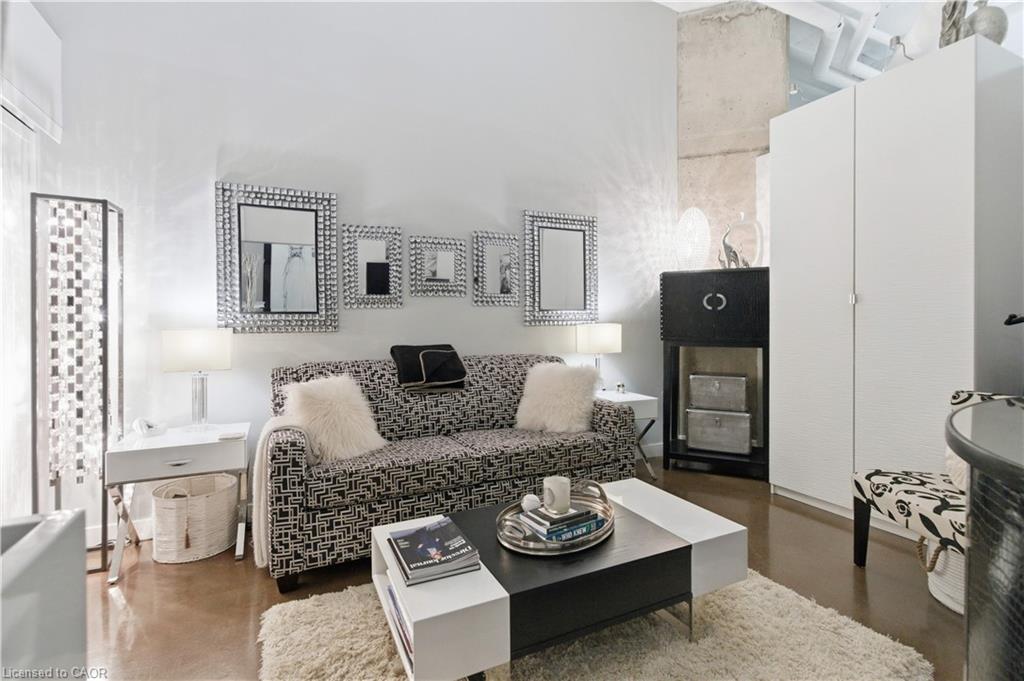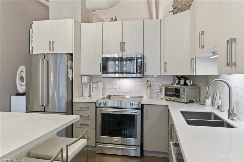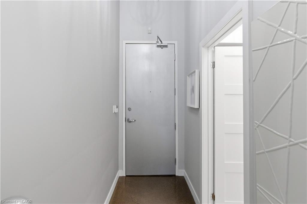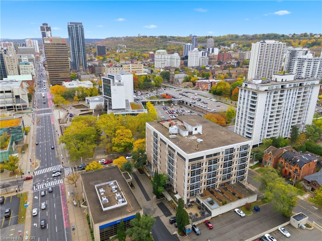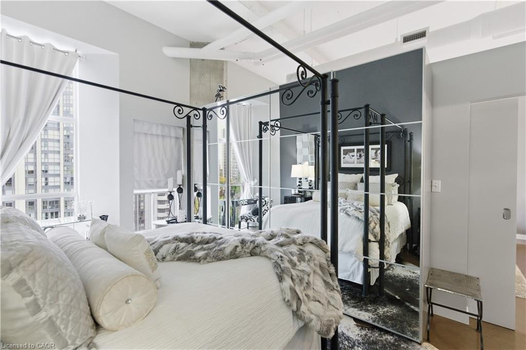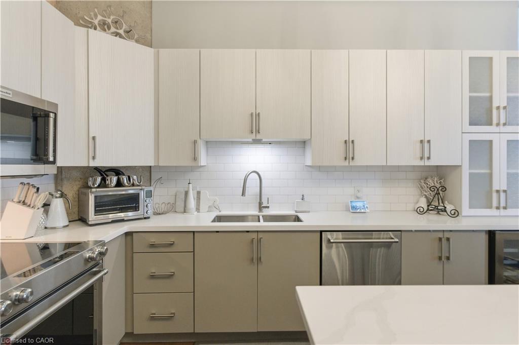 Welcome to Core Lofts – Hamilton’s premier loft condominium, ideally situated in the city’s coveted Durand neighbourhood. Once a former Bell Canada office building, this landmark conversion seamlessly blends industrial character w/ sophisticated urban design. This exceptional 1143 sq ft, 2-bdrm, 2-bath penthouse offers an elevated living experience w/ western exposure. Polished concrete floors, soaring 12.5′ ceil & expansive windows create a striking open-concept environment filled w/ natural light. The custom-reno’d kitch is a true showpiece, feat bespoke cabinetry, quartz counters, a stylish tiled backsplash, S/S app (incl a beverage fridge) & a large centre island w/ dual overhang seating for up to 8. The spacious liv rm opens to a Juliette balcony overlooking the city skyline, while the primary retreat feat an oversized closet, custom oversized wardrobe & a luxe upgraded 3-pc ensuite w/ an oversized glass shower & modern finishes. A 2nd bedroom, currently utilized as a den, provides flexibility for a home office or guest suite. The beautifully updated 4-pc main bath feat a tub/shower combo w/ a glass enclosure. Add highlights incl in-suite laundry, upgraded lighting, a tandem 2-car parking space (#59 PL-2 Lvl A), & an oversized storage locker (#23 on penthouse lvl). Steps away from access to a rooftop terrace w/ panoramic views of the city & topography, complete with BBQ areas & multiple seating zones. Add amenities incl a well-equipped gym, a stylish lobby, & a modern meeting room. Recent notable building improvements incl elevators, HVAC systems, & improved entry security. The location is second to none – steps to vibrant James St, the GO Station for easy commuting to Toronto, restaurants, shops, St. Joseph’s Hospital, & the Downtown Arts District. Walk to parks, trails, cafés, & everything downtown has to offer. This rare penthouse combines timeless industrial style, urban convenience, & luxe comfort – truly one of Hamilton’s most impressive loft residences.