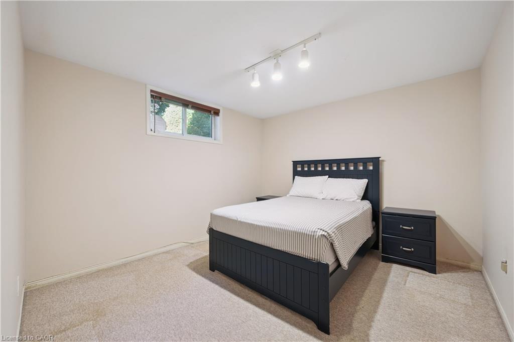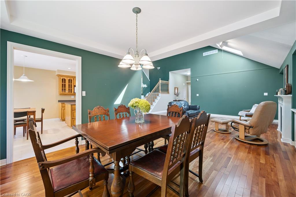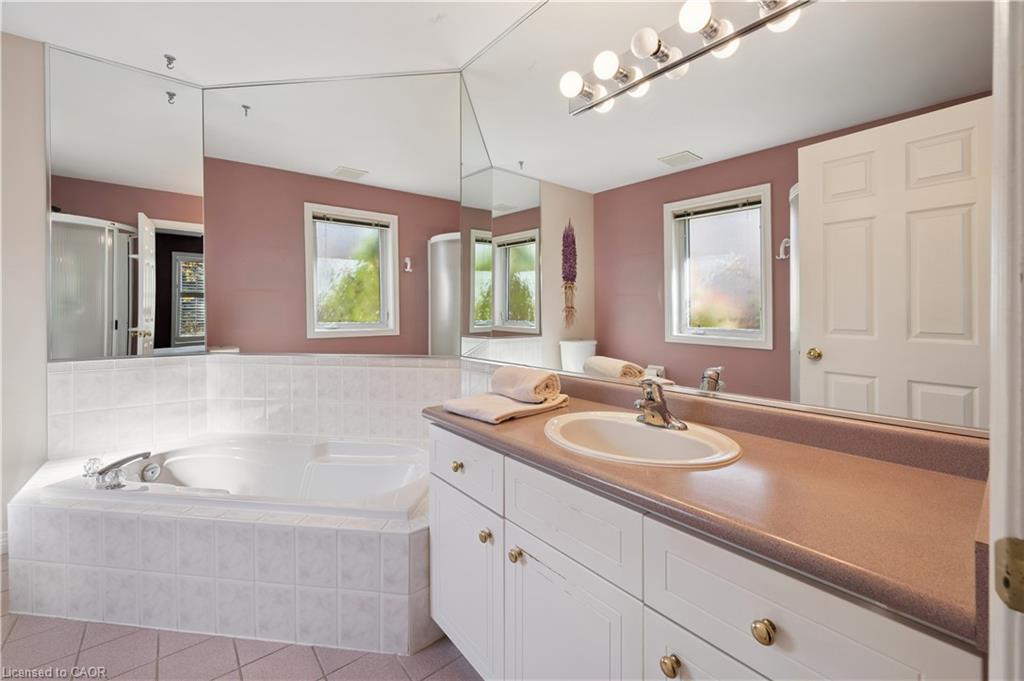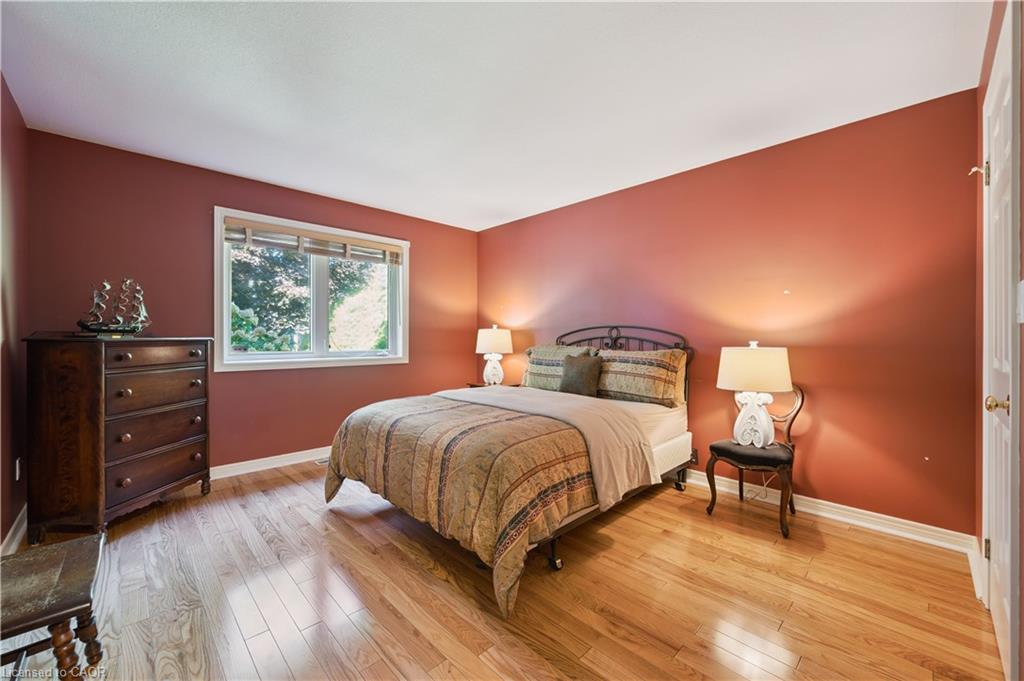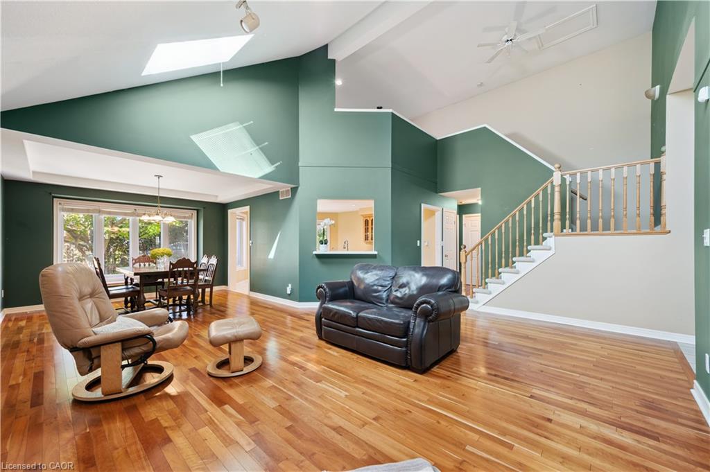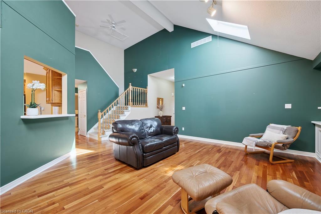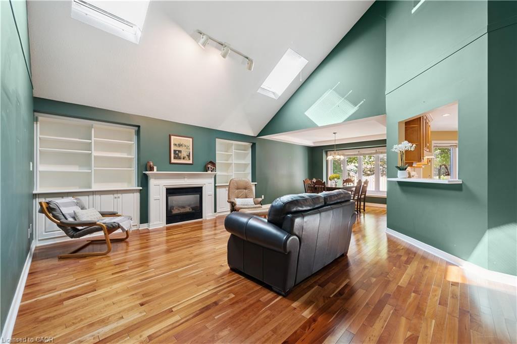 Welcome to this beautifully maintained bungaloft in Guelph’s highly sought-after Kortright East neighbourhood – where comfort, functionality, and charm come together seamlessly.The main floor offers a bright and spacious layout featuring two bedrooms, including a primary suite with a walk-in closet and private ensuite bathroom. A second bedroom with its own 3-piece bath provides flexibility for guests or family. Enjoy the ease of main floor laundry, vaulted ceilings with skylights, and a cozy gas fireplace that anchors the sun-filled living room.Downstairs, the finished basement extends your living space with two additional bedrooms, a den, office, and a 2-piece bath with shower rough-in-perfect for a growing family, home business, or multigenerational living with separate basement entrance through the garage. Ample storage throughout ensures everything has its place.Step outside to a private backyard surrounded by mature trees, ideal for relaxing or entertaining. A double car garage and spacious driveway complete this exceptional property.Located in a quiet, established community close to parks, trails, top-rated schools, shopping, and transit, this home offers the perfect blend of tranquility and convenience.