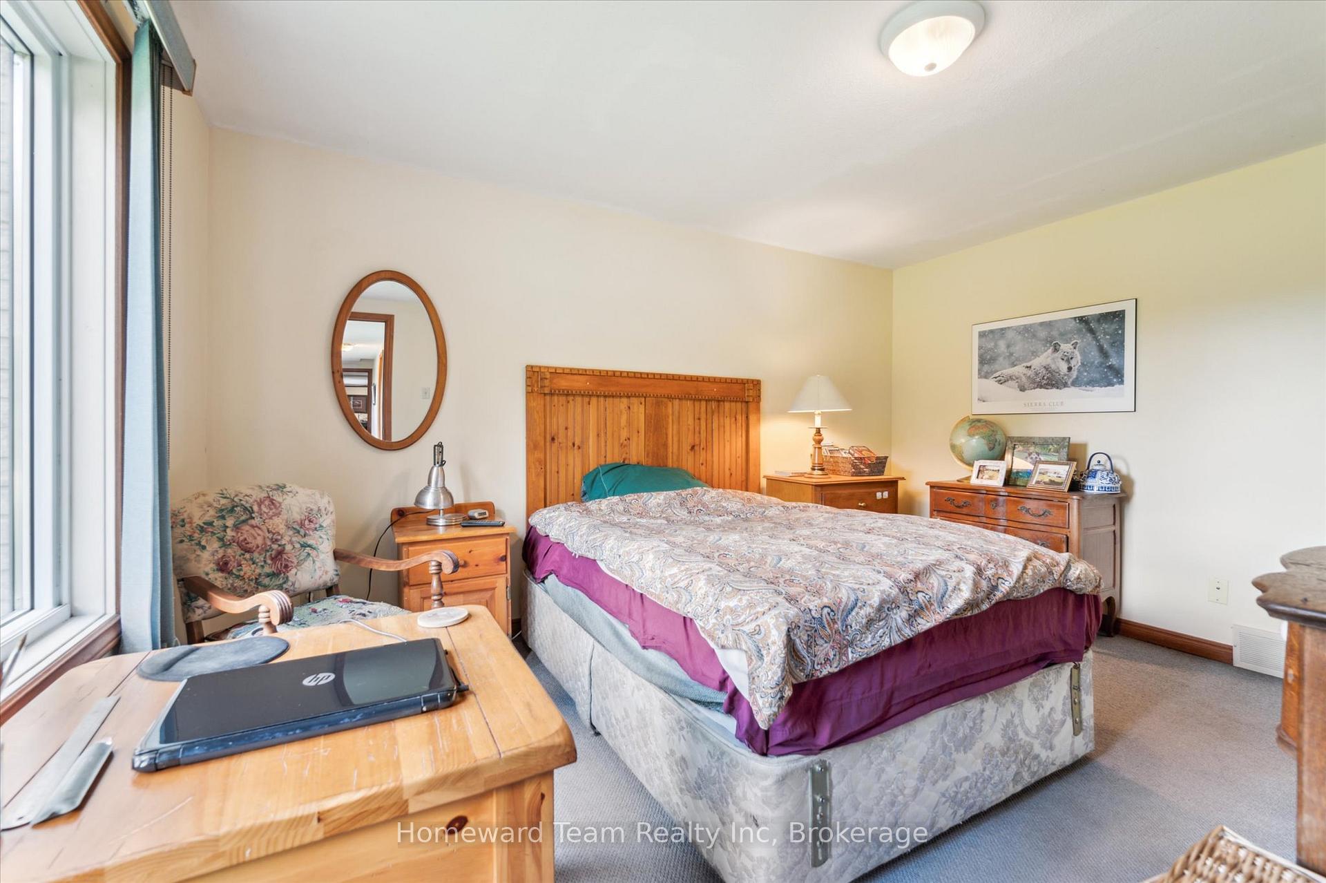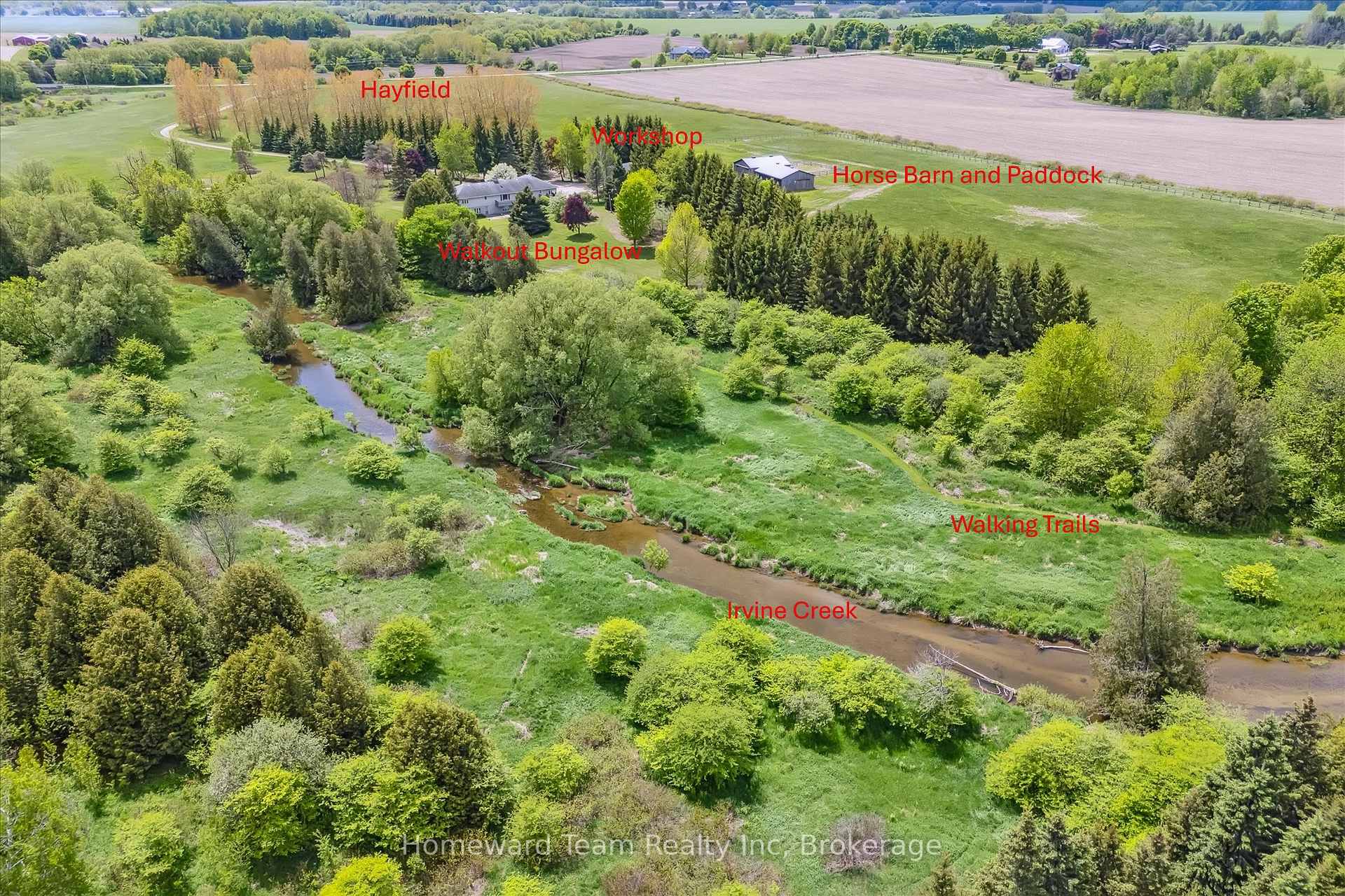Looking for lifestyle change? Enjoy serene country living just minutes from golf course, Belwood Lake and the thriving town of Fergus. This unreal property is ready for new owners to make lasting memories. Zoning here allows for the building of a 2nd single-detached dwelling. Nestled on 54 acres you will find this 2200 sqft walkout bungalow positioned well off the paved road in this ultimate of private settings. Ever thought of organic farming? This land has not had herbicide or pesticide used for over 30 years. A house that checks all the boxes… ranch style bungalow with oversized attached 2 car garage, finished walkout basement with recroom, sauna, office, storage and workshop, 4 bath, 4 bedroom, floor to ceiling brick fireplace, soaring cathedral ceiling, sunken Living and Family room, main floor laundry, 3 season sunroom, family sized kitchen with island, pantry and walkout to deck. Outdoor adventure awaits while you navigate your very own trails along the Irvine Creek, forests and pond. Dreamed of having horses/livestock? You’ll find a manageable 8 stall barn (33’x48′) with wash stall, tack room, and an attached hay storage barn (40’x32′). 5 Acres (tile drained) fenced paddocks, 14 acre (tile drained)hayfield, additional 7 acres that could be worked. (Total of potential 27 acres workable). Double sized workshop/storage 24’x 50′. Propane furnace October 2021, roof shingles 2010. Be sure to watch the virtual tour for additional photos and iguide tour for floorplan and layout. Property is currently fully taxed at Residential rate, taxes will be significantly lower once agricultural rate is applied. Please take the time to walk the trails along the river to truly appreciate the peace and quiet this property offers.