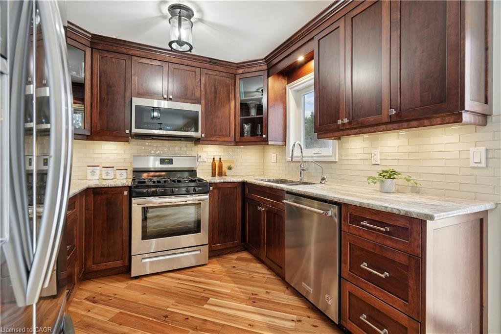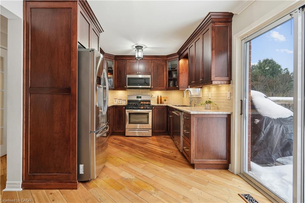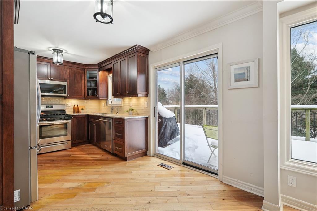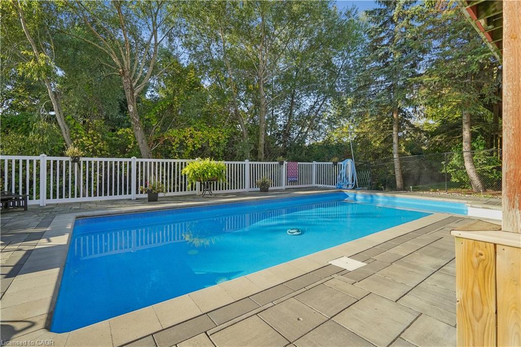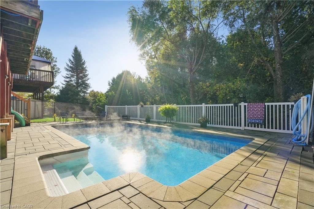 WALKOUT BASEMENT! INGROUND POOL! NO BACKYARD NEIGHBOURS! Welcome to 7 Birchway Place. This well-cared-for 2-storey detached home offers a comfortable blend of thoughtful updates, functional design, and a backyard oasis the whole family will love. Set on a quiet cul-de-sac and backing onto the natural green space surrounding Fairy Lake, this property offers rare privacy with no rear neighbours. Inside, the main floor features hardwood flooring throughout, a bright living room, a large dining area, and a well-appointed kitchen with granite countertops and under-cabinet lighting. A sliding door walkout leads to a raised deck overlooking mature trees and the heated inground pool below. It’s the perfect setting for morning coffee, family dinners, or relaxed summer evenings. Upstairs, you’ll find three comfortable bedrooms, including a spacious primary suite with an updated ensuite bathroom. The main bathroom has also been tastefully refreshed. The fully finished walkout basement expands your living space with a newer 3-piece bathroom, convenient second laundry area, and direct access to the backyard patio and pool. This layout is ideal for teens, extended family, or guests. The lot is an impressive 46.92 x 100.07 feet, offering room to relax and play. The heated inground pool is the highlight of the backyard, surrounded by a lower patio and framed by mature trees for added privacy. Additional features include a double-car garage, driveway parking for two vehicles, and main-floor laundry in addition to the basement laundry. Located just minutes from Downtown Acton, Prospect Park, and Fairy Lake, and only a 15 minute drive to the 401, this home brings together nature, convenience, and community in a family-friendly setting.