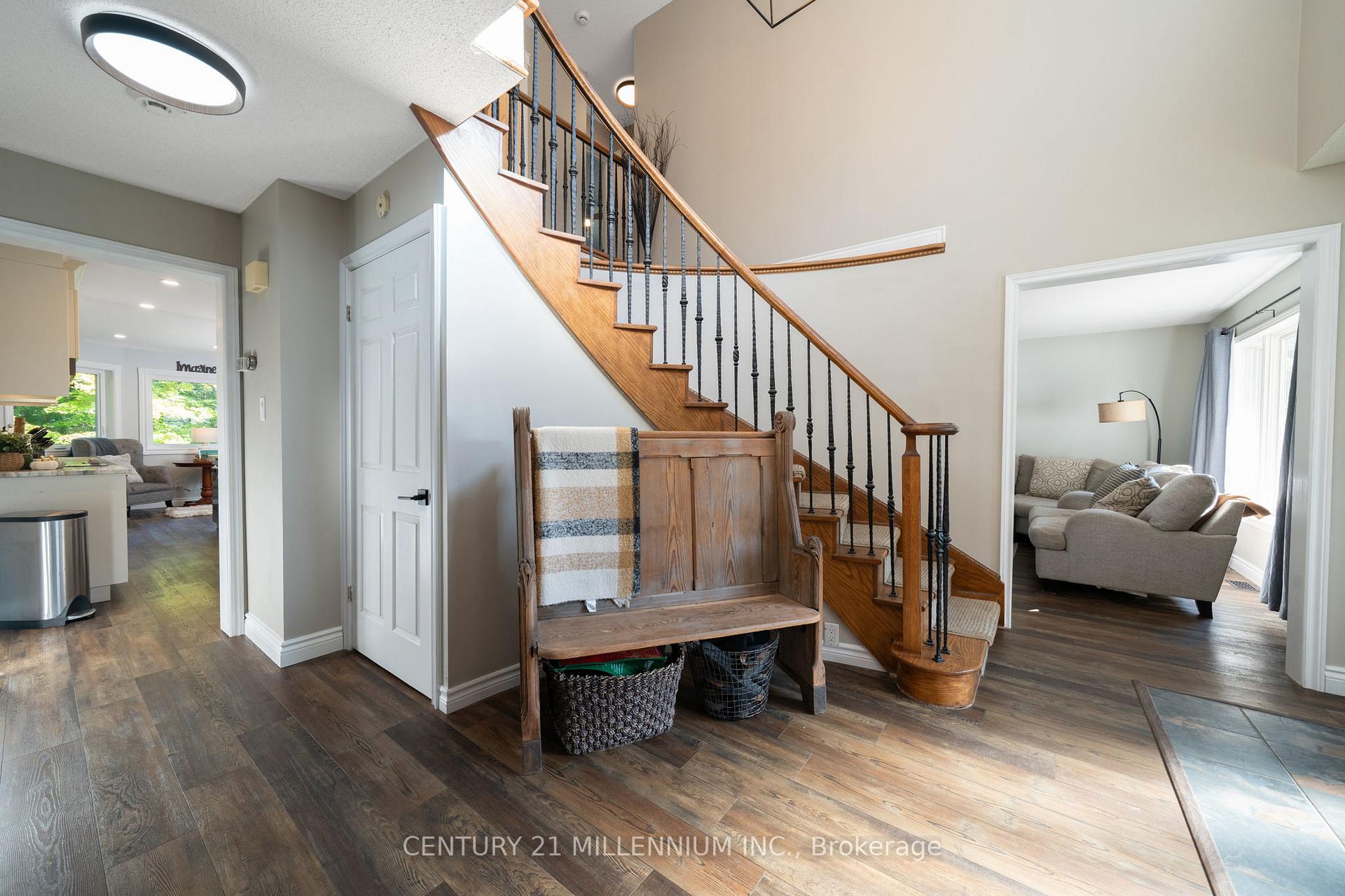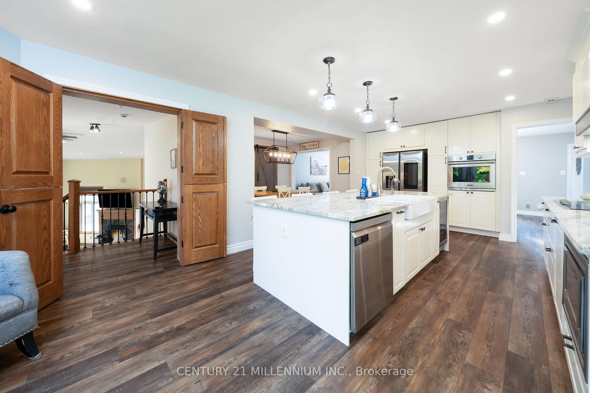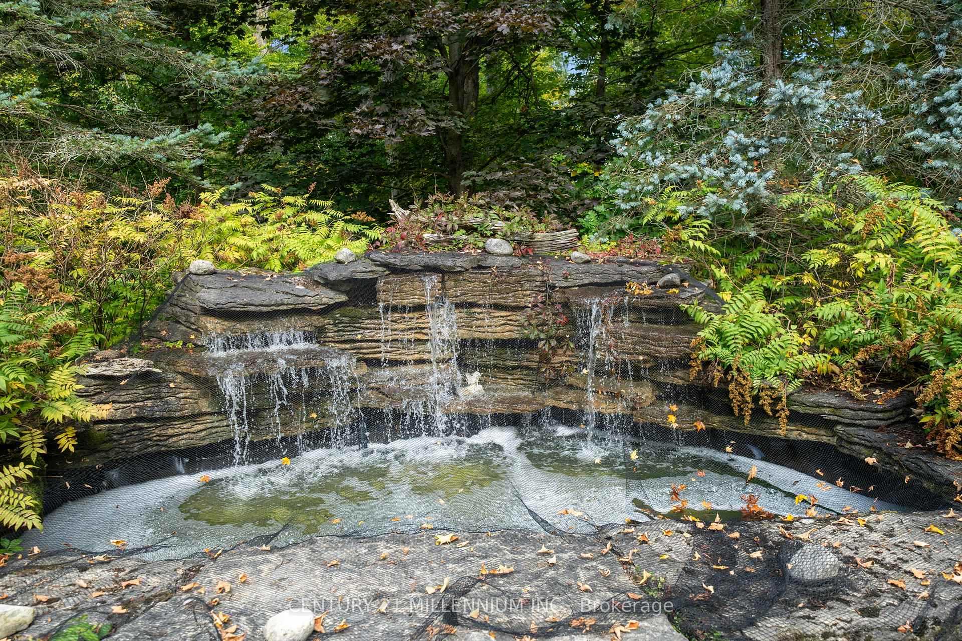 Remarkable country home! Stunning private setting with a waterfall feature, pond, surrounded by Harwood forest. Large family home, with upgraded flooring throughout, newly renovated kitchen with induction cooktop, large centre island and eating area, open concept dining area overlooking kitchen with a large pantry area. Main floor family room with wood burning fireplace, large front living room, wrap around deck off kitchen, Huge great room with in floor heating, soaring ceiling, fireplace and loads of natural light, walkout to a stone patio with waterfall feature, outdoor fireplace, and a enclosed gazebo …great for entertaining! 4 large bedrooms with renovated ensuite bath and 4pc bath, loft area over garage is perfect for home office or craft room. Unfinished w/o basement. Car enthusiast dream 3 garage with both heating and air conditioning!!! Large storage shed off garage. Fantastic fenced in backyard, with a pond (great for skating in the winter), separate detached single car garage. Large paved driveway with loads of parking. Generac Generator large enough to power whole house! Rogers High Speed internet service, and natural gas.
