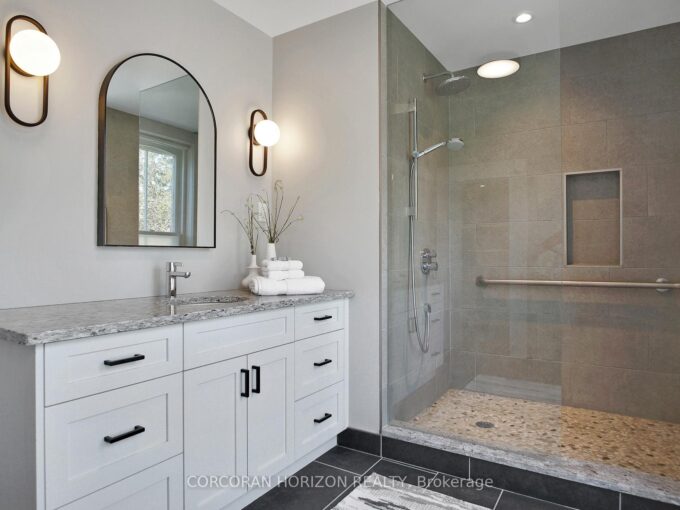 Escape to contemporary elegance in this architecturally stunning estate, nestled on a serene one-acre lot in sought-after Puslinch. Thoughtfully designed and masterfully built, this custom home redefines luxury. Inside, soaring 10-foot ceilings, expansive windows, & a sculptural white oak staircase set the tone for refined living. Natural light fills the home, highlighting exceptional craftsmanship & an effortless sense of openness. At its heart lies a chef’s kitchen featuring quartzite countertops, a full-height backsplash, and sleek Barzotti custom cabinetry throughout. A large island with seating for six, integrated high-end appliances, a walk-through butler’s pantry, and designer lighting. The kitchen flows into a two-storey great room, where a dramatic gas fireplace anchors the space. Dual glass sliding doors open to a covered porch and private rear yard, an idyllic backdrop for relaxing or entertaining. A formal dining room & private office complete the main level. Upstairs, four spacious bedrooms and three full bathrooms, each with in-floor heating. The primary suite is a serene retreat with spa-inspired finishes & a custom closet. A conveniently located upper-level laundry room combines practicality w/ refined design. The lower level features polished concrete floors, a finished powder room, and rough-ins for in-floor heating, a future kitchen, & ensuite. A walk-up leads directly to the fully insulated triple-car garage, complemented by a detached double-car garage. Modern conveniences include 1.5 Gig fibre internet and integrated audio in the kitchen, office, garage, and primary ensuite. With parking for up to 20 vehicles, accommodating any occasion with ease. Wrapped in stone & brick w/ black Hardie board accents, a true statement of design and craftsmanship. Located minutes from Highway 6 with direct 401 access, close to South Guelph amenities, and only 40 minutes to Pearson Airport, this estate perfectly balances luxury, lifestyle, & location.