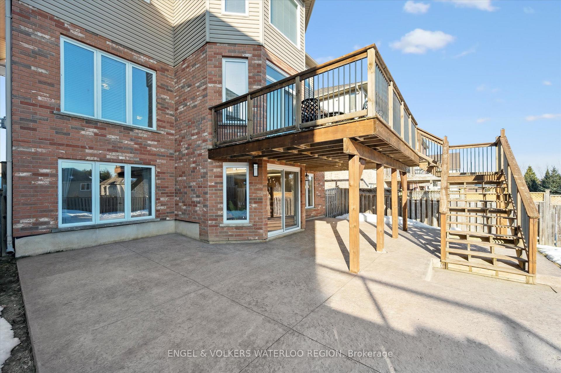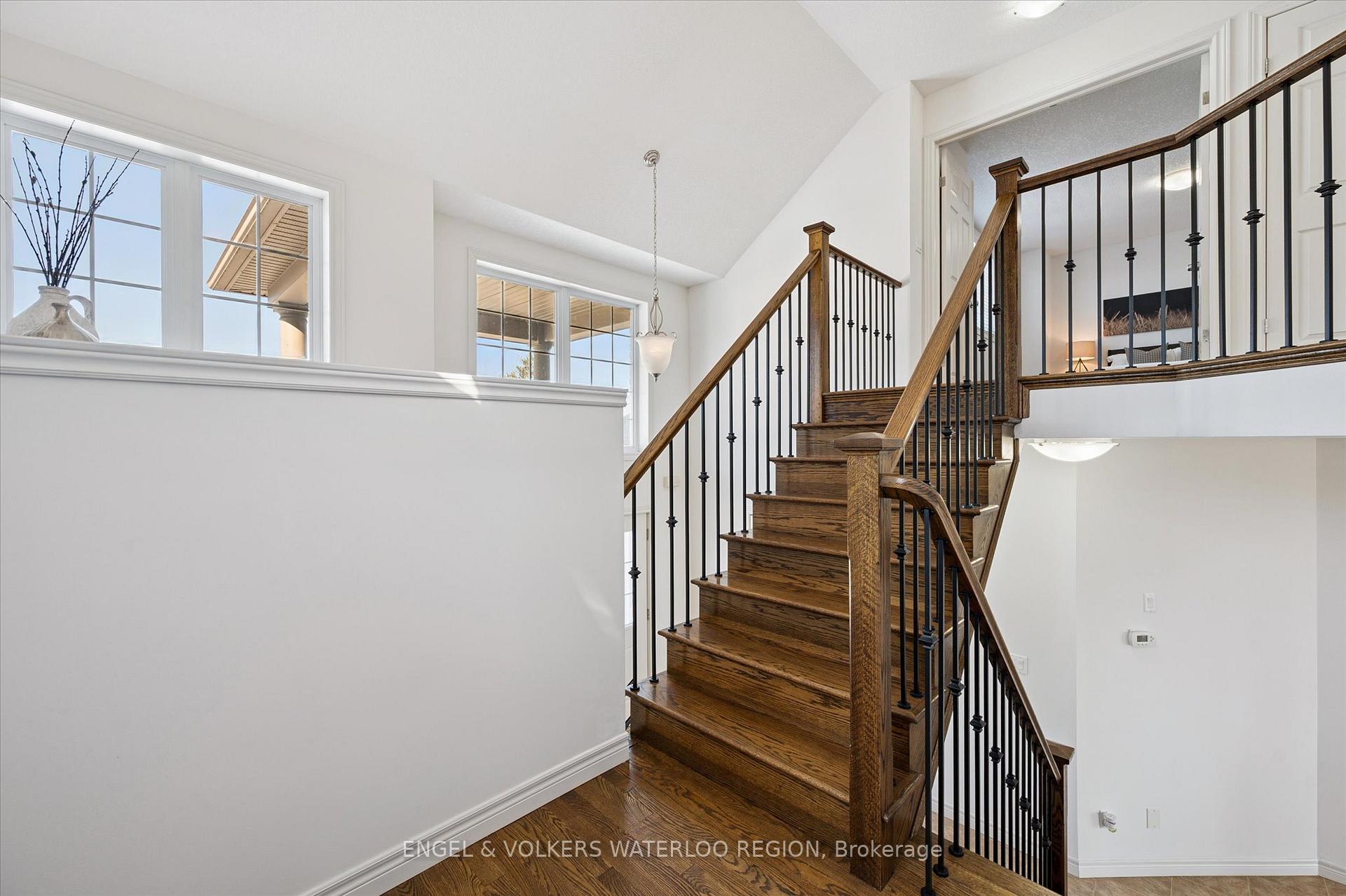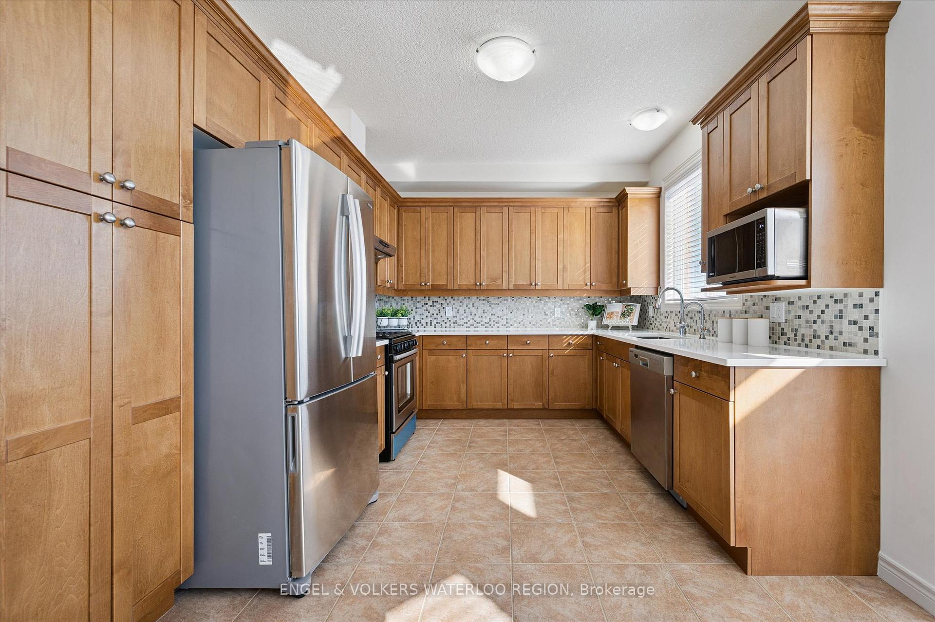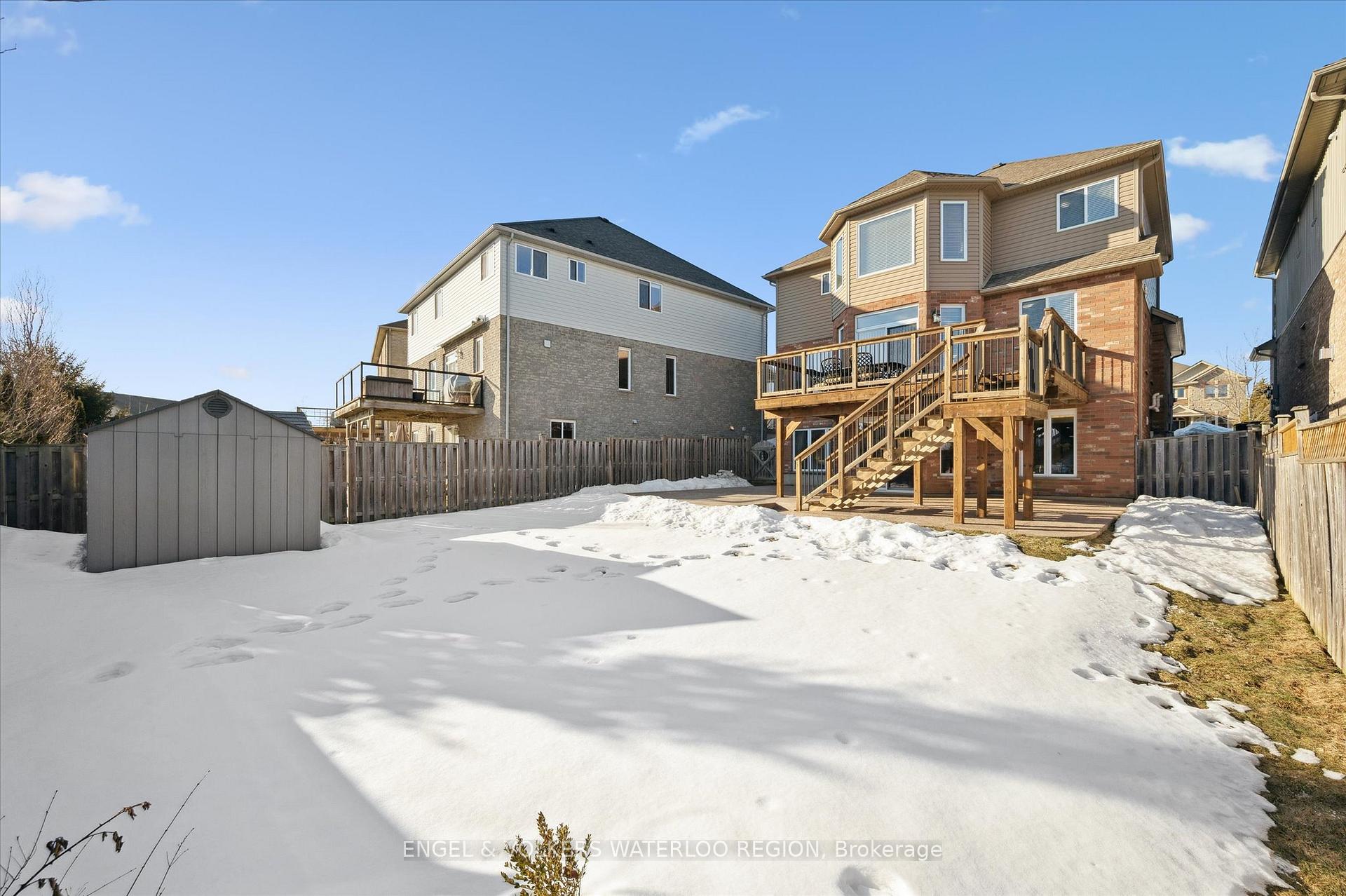 Nestled in one of Waterloo’s most sought-after neighbourhoods, this distinguished home in Conservation Meadows offers the perfect blend of elegance, comfort, and convenience. Situated on a quiet cul-de-sac, the property is thoughtfully maintained and beautifully appointed, showcasing exceptional curb appeal with its attractive exterior, double-car garage, concrete driveway accommodating four vehicles, and no sidewalk. Step inside to a bright and welcoming foyer featuring a soaring double-height ceiling and a walk-in closet. The main floor boasts 9-foot ceilings and a spacious, sun-filled living room with south-facing windows and a cozy gas fireplace. The generously sized kitchen is designed for both functionality and style, featuring abundant cabinetry, stainless steel appliances, and stunning quartz countertops. It opens seamlessly to the dining area, which overlooks clear, open views. Step outside to a large deck with stairs leading to an expansive concrete patio and a fully fenced, well-maintained backyard complete with manicured lawns and a solidly built shed. A versatile main-floor room with double doors offers flexibility as a private family room, home office, or formal dining room. A convenient powder room completes the main level. Upstairs, the primary bedroom is bathed in natural light from beautiful bay windows and features a walk-in closet and a 5-piece ensuite. Two additional well-sized bedrooms share a 4-piece bathroom. A second-floor laundry set adds everyday convenience. The fully finished walk-out basement significantly expands the living space, offering a large recreation room with a wet bar and dining area, a spacious bedroom with a study area and walk-in closet, a full 3-piece bathroom, an additional laundry set, and a cold room. Located just minutes from top-rated schools, shopping plazas, HWY 85, and the public library – walking distance to Conservation Park – this exceptional property offers more than just a home; it offers a lifestyle.