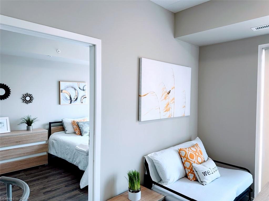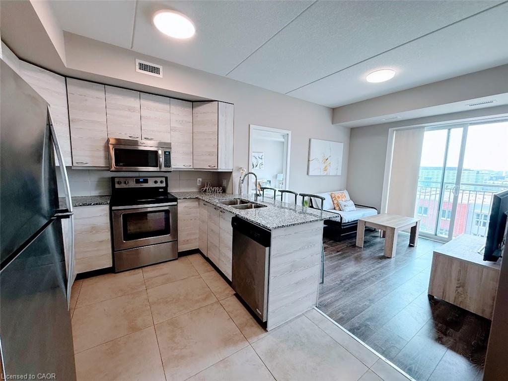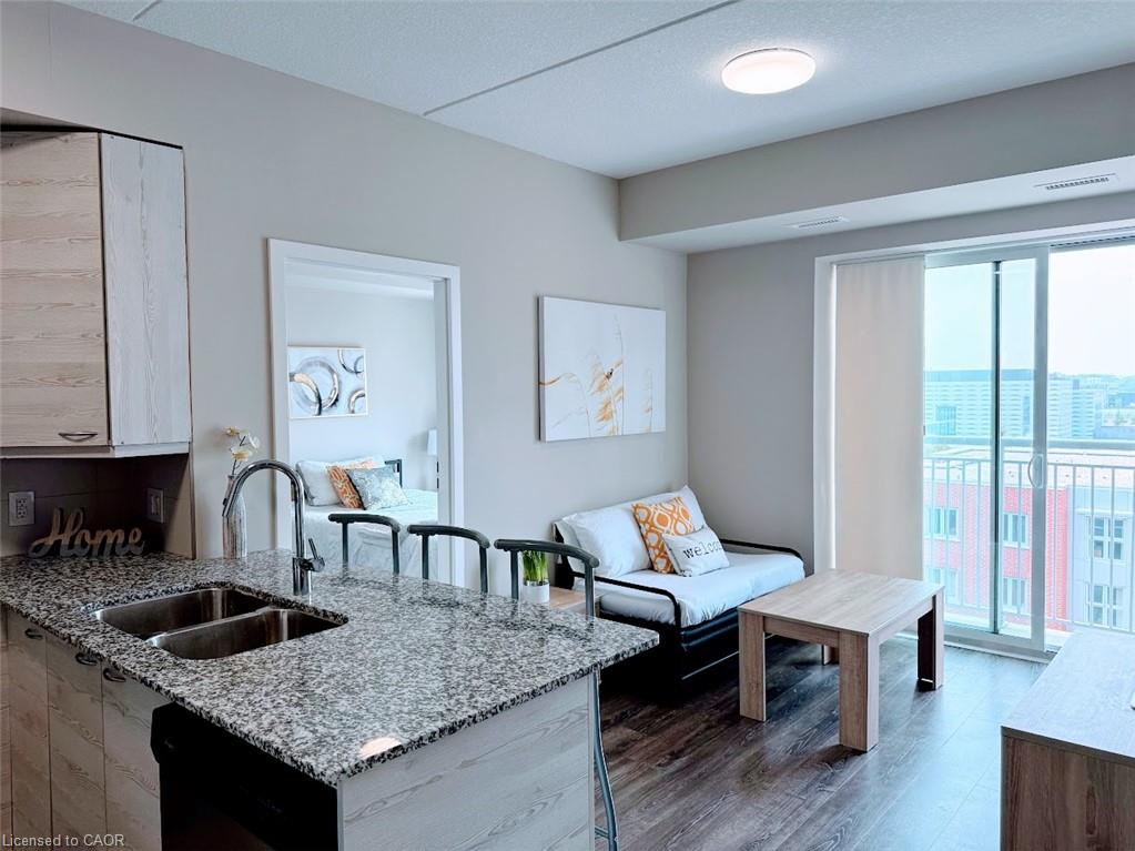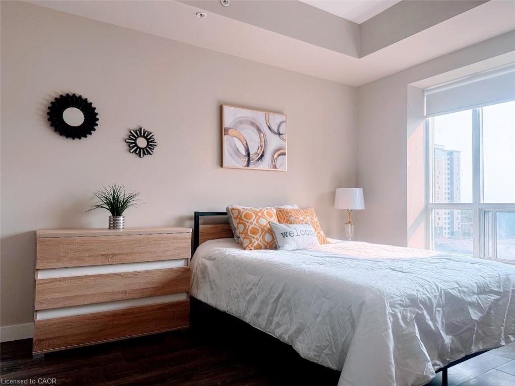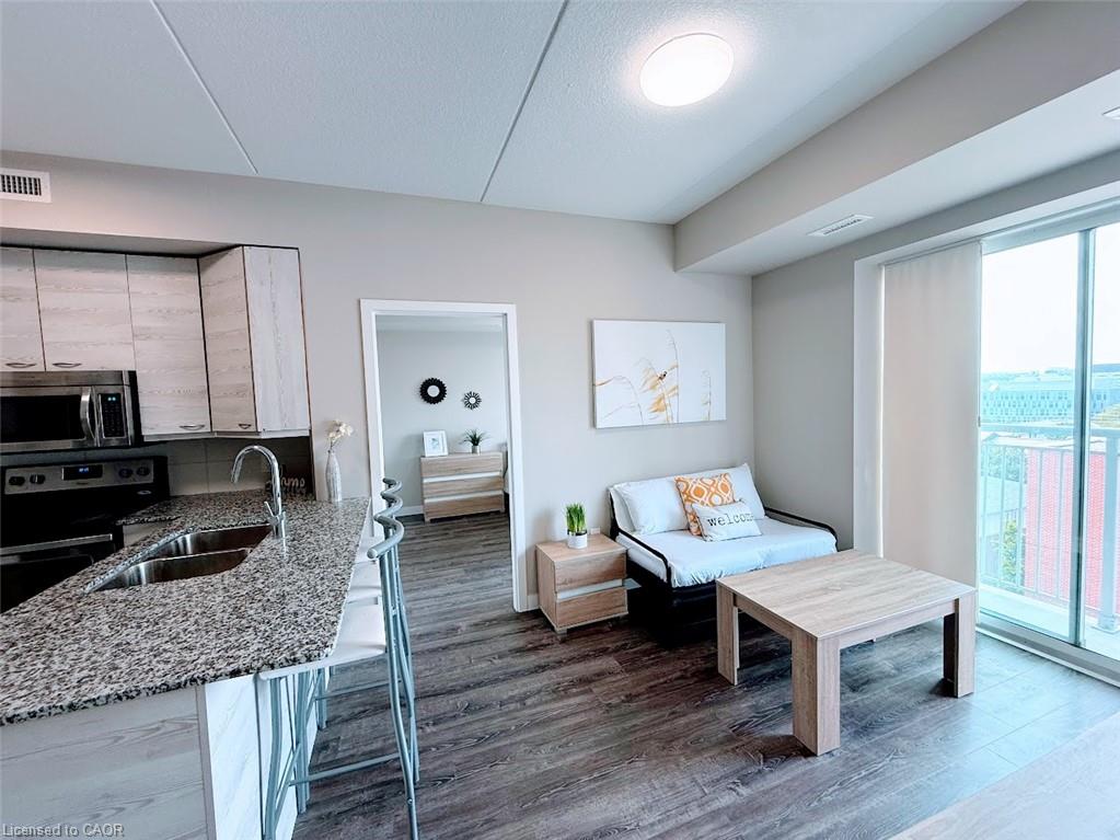 Rare find! A prime unit featuring an owned underground parking space, two bedrooms, two full bathrooms, a large wraparound balcony, and stunning city views — all located in the heart of the Waterloo university community. This sleek and modern unit boasts a spacious open-concept layout with laminate wood flooring throughout, abundant natural light, stainless steel appliances, in-suite stacked laundry, granite countertops, and comes fully furnished. Just steps away from Wilfrid Laurier University, the University of Waterloo, Conestoga College, public transit, restaurants, and a wide range of amenities.