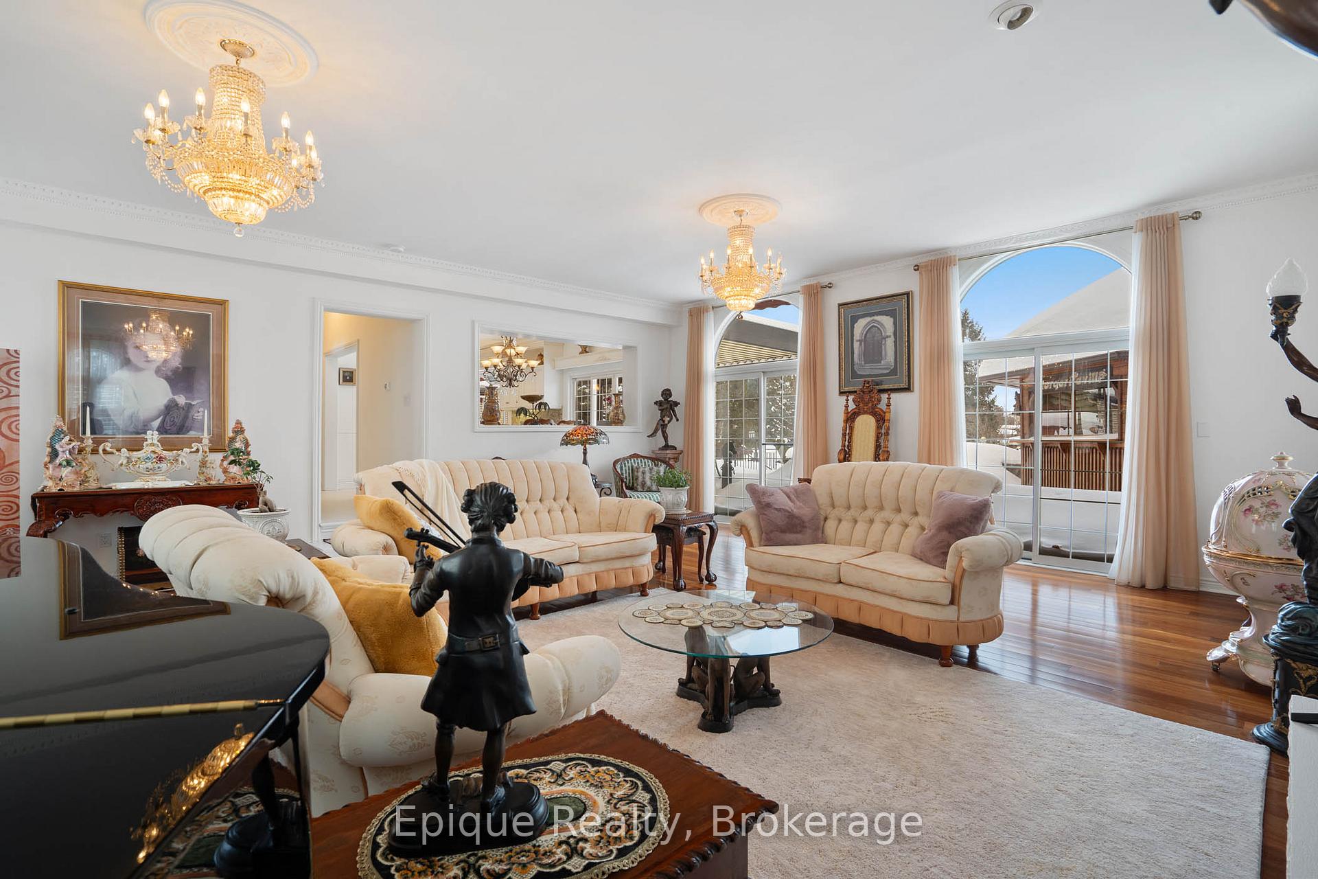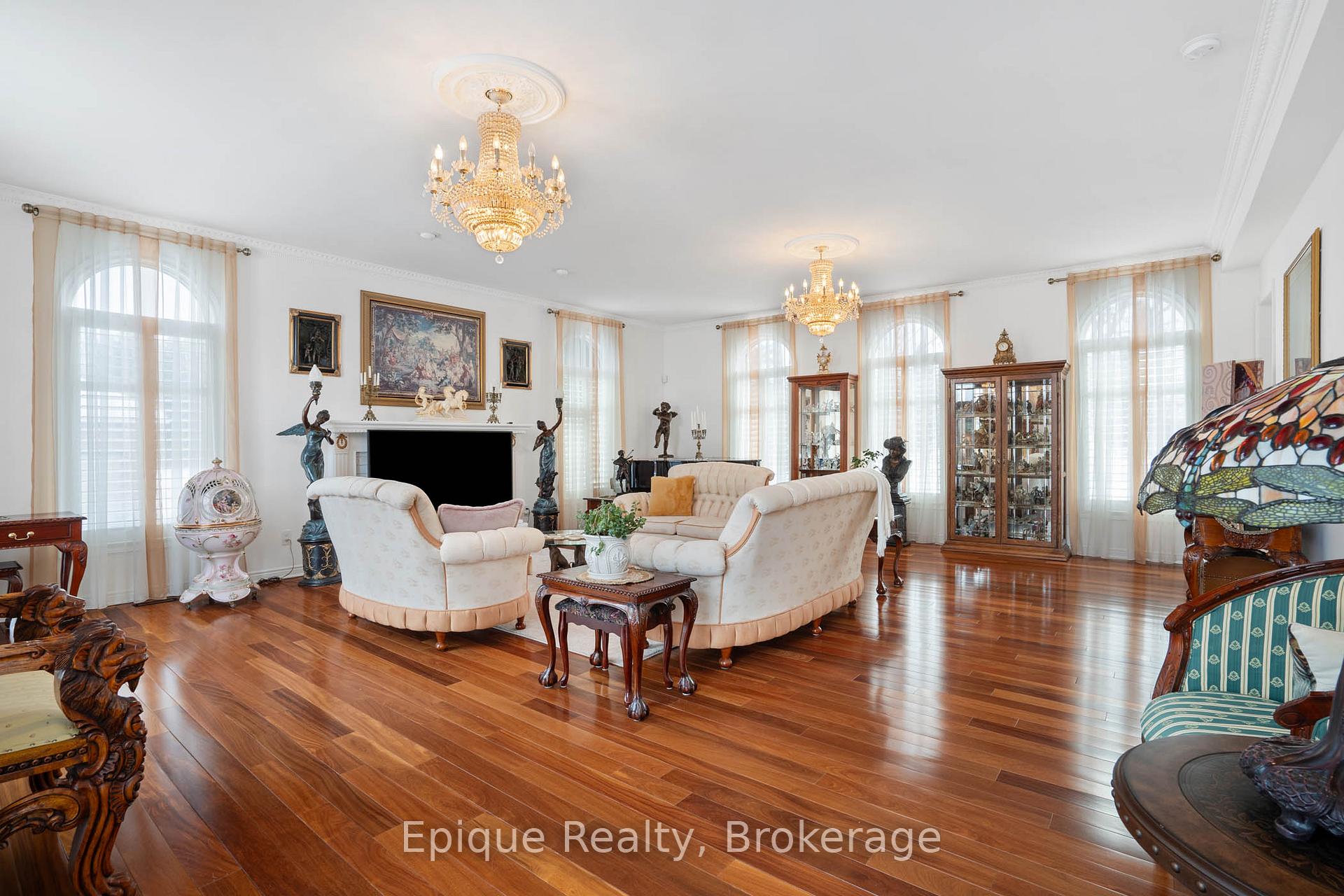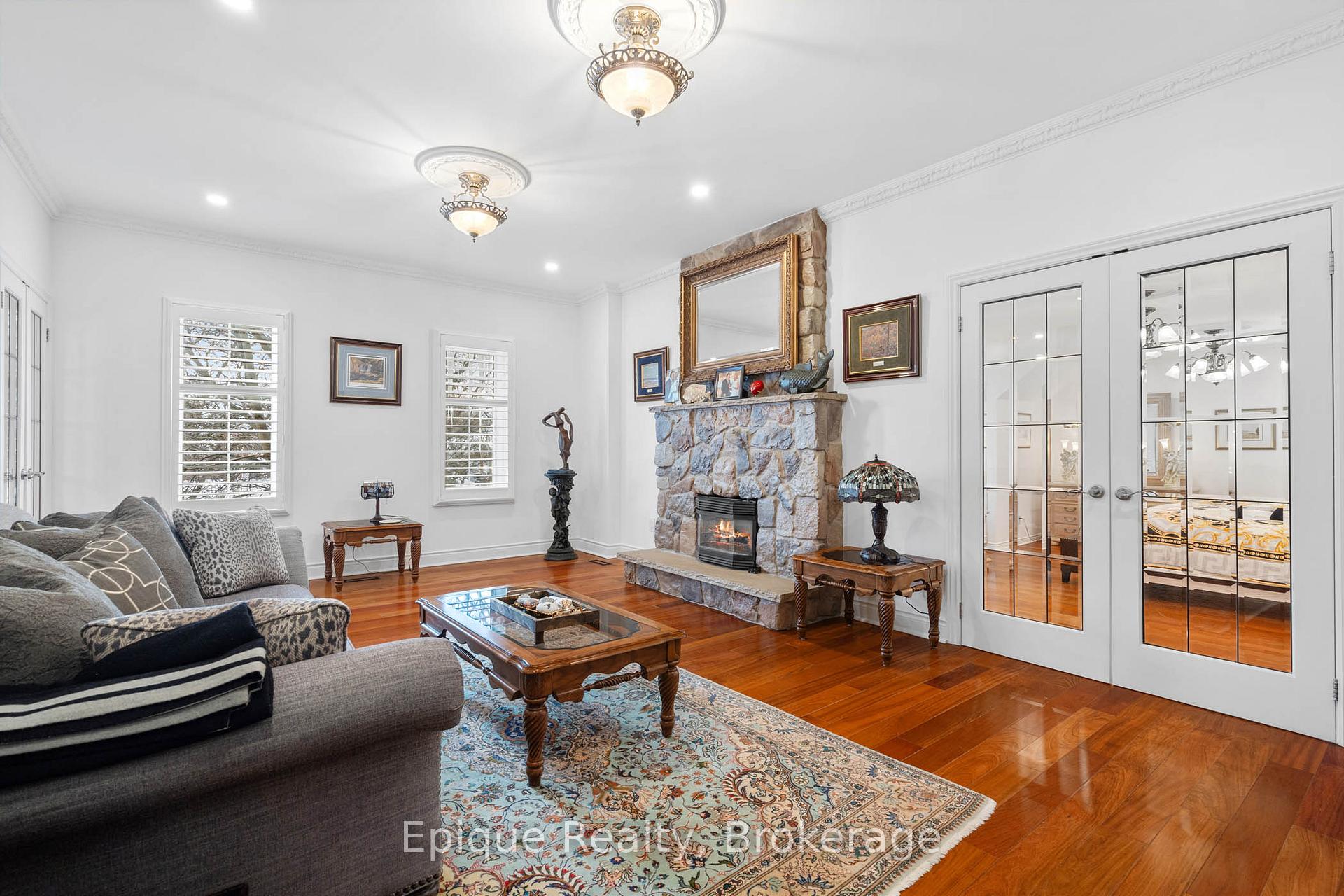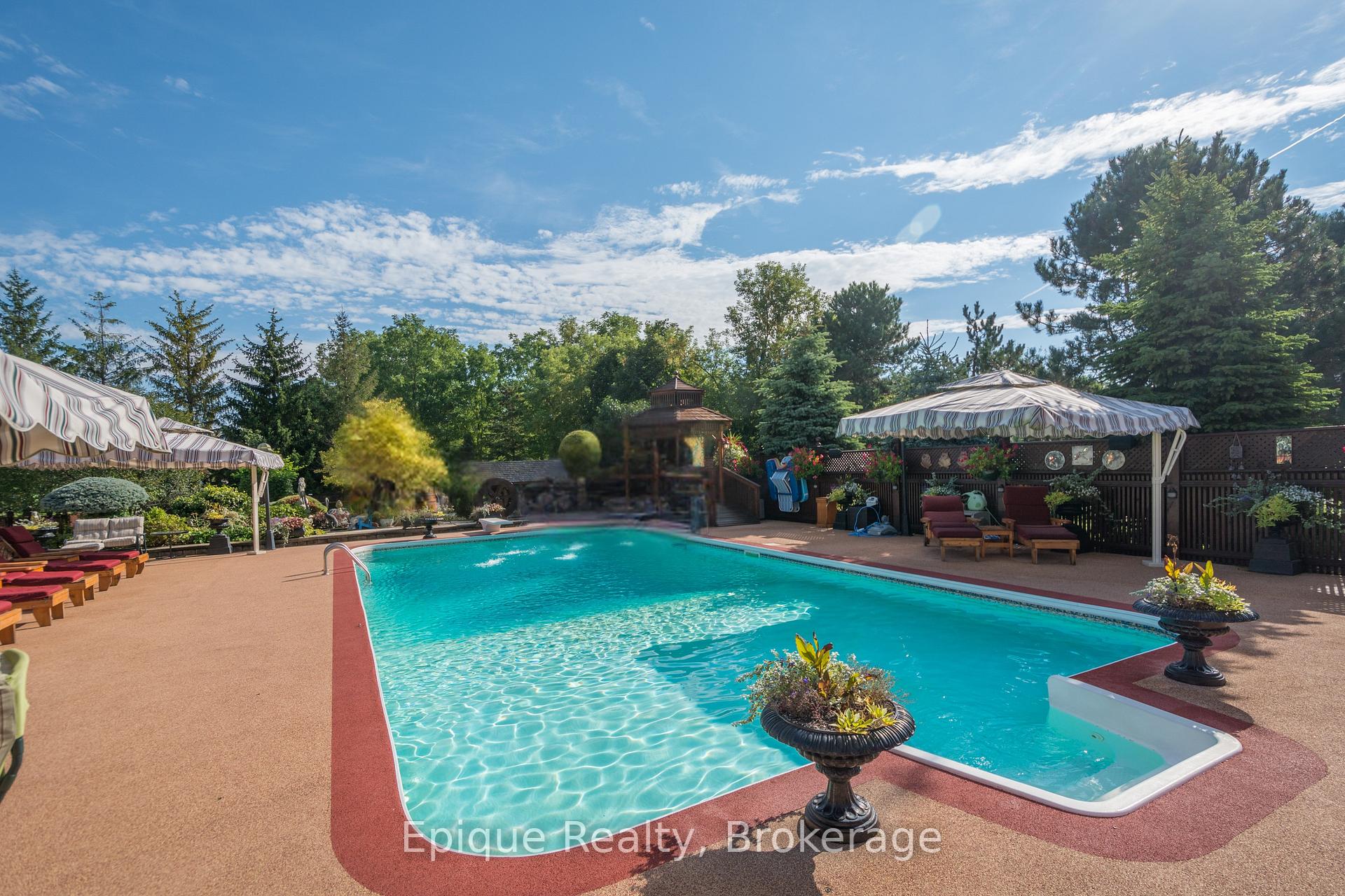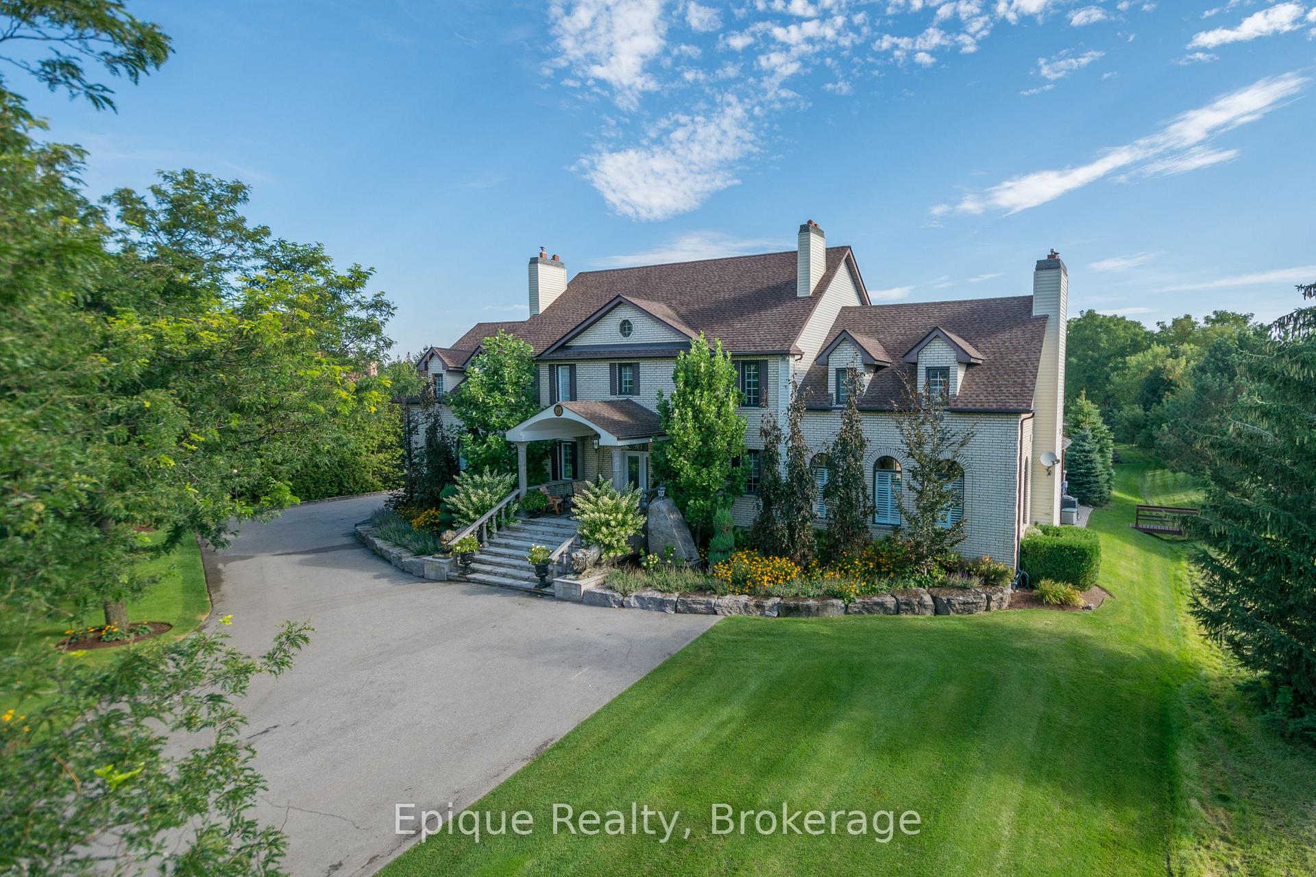 EXPERIENCE UNMATCHED LUXURY IN CAMPBELLVILLE. Nestled on a lush and private 1.13 acres, this imposing 7,200 sq. ft. estate is a masterpiece of design and craftsmanship. Exotic Brazilian cherry floors, Swarovski crystal chandeliers, and five fireplaces create an ambiance of timeless elegance.The formal dining room stuns with a majestic fireplace and chandelier, while the main-floor office connects seamlessly to the conservatory, perfect for entertaining with a baby grand piano. The gourmet kitchen boasts Jenn-Air & Bosch appliances, custom cabinetry, and quad French doors leading to an expansive deck and remote-controlled screened sunroom.The primary suite wing is a private retreat with a sitting area, gas fireplace, spa-inspired ensuite with double vanities, an oversized glass shower, a deep soaker tub, and extensive closet space. Three additional bedrooms share an opulent oversized bath, ensuring comfort and elegance.The professionally finished lower level includes a spa-inspired 3-piece bath with a steam shower. Outdoors, enjoy a 20 x 40 heated saltwater pool, pool house changeroom, and a cedar cabana bar with power and water.For the automobile enthusiast, the 4-car garage and parking for 20+ vehicles provide ample space. Just minutes from the 401, this estate offers unparalleled luxury, privacy, and accessibility.A rare opportunity to own a true luxury retreat. Schedule your private showing today.