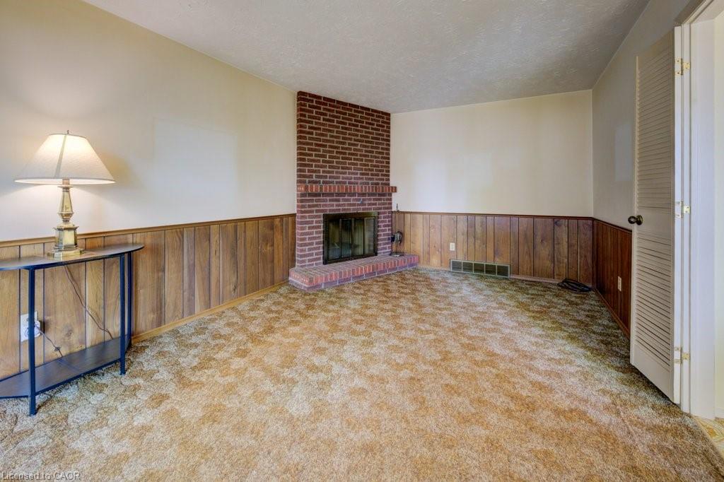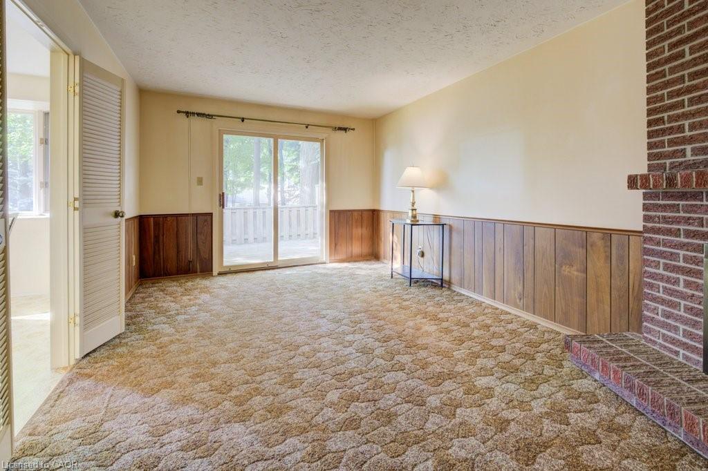 room complete with a cozy fireplace and direct walkout to the large deck and fully fenced, tree-lined