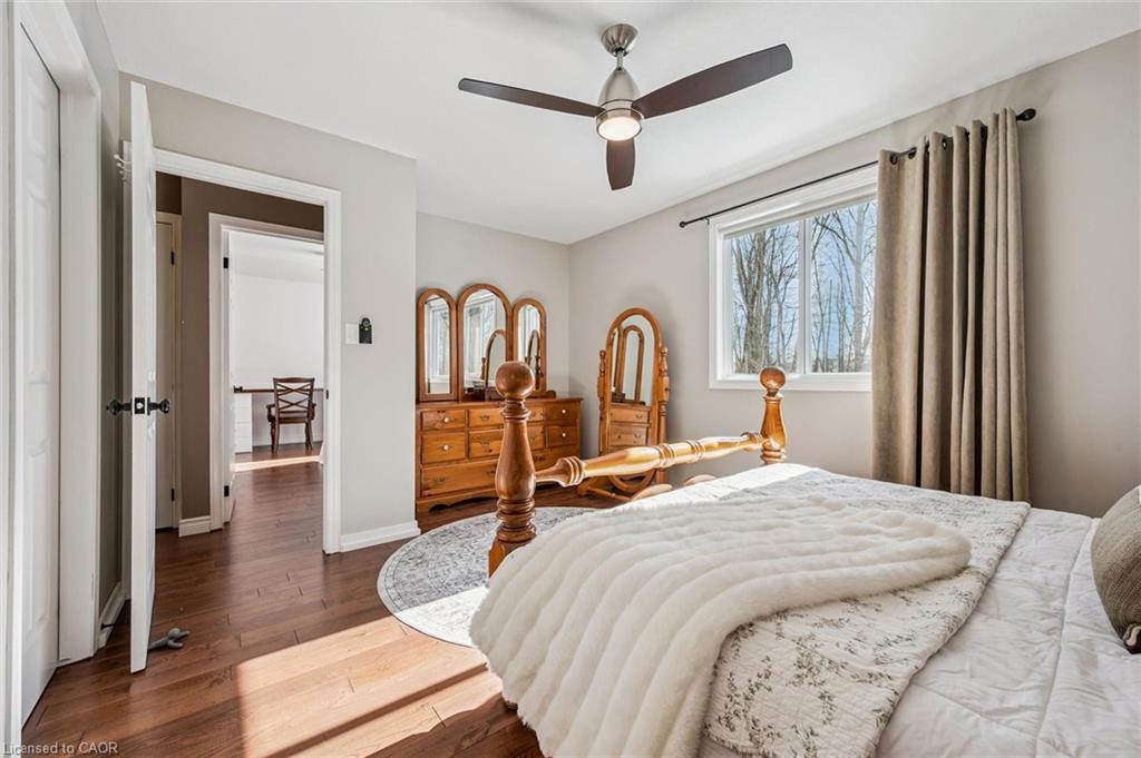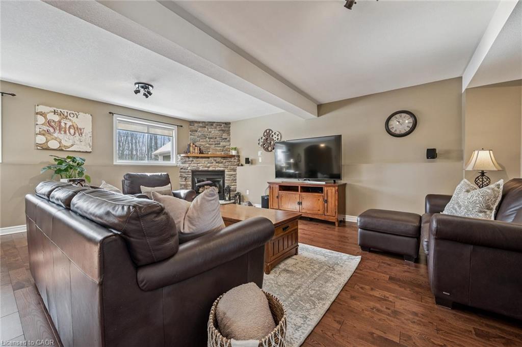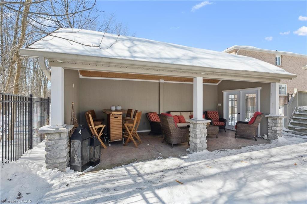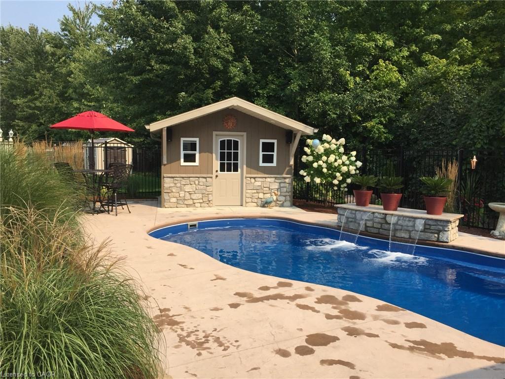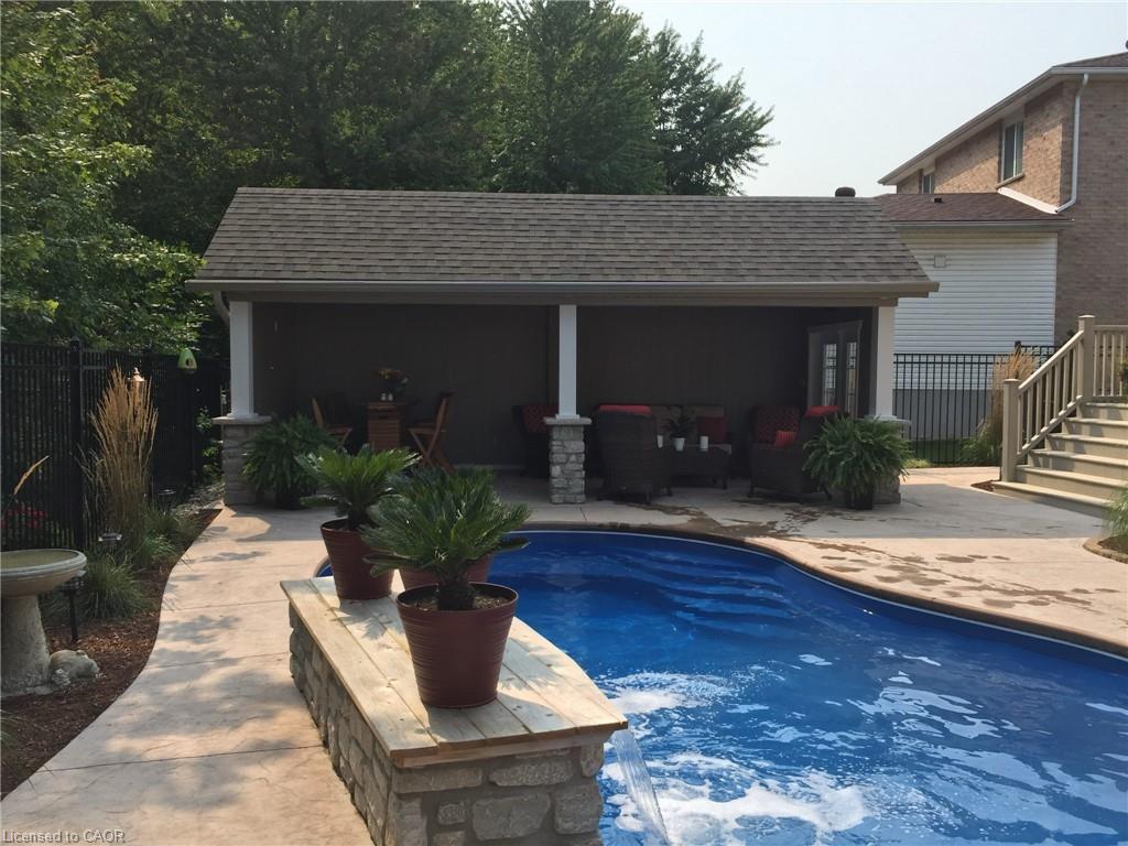Inground Pool! No expense has been spared to create this stay at home resort. Built to last this custom backsplit has been cared for and upgraded as needed, where needed. Built in 2003 the layout makes sense for at home enjoyment. Gleaming hardwood floors on 3 levels. The inground pool is a one piece fiberglass unit which means no pool liners to replace. Gas heated and with an ozonator — if you haven’t owned a pool before it won’t take long for you to become an expert. Backing onto forest ( Mitchell Park Trail ) you will enjoy privacy. The walking trail is there, but not in view of your cannon balls. Stamped concrete everywhere, and a massive cabana with all the fixings–electrical, pot lights, sound, and ceiling fans. Located on the slower and newer end of Willow Rd, there is parking on our side of the street. We have a Unilock brand interlocking triple driveway AND a double garage. Gas furnace and Central air (2016) have been serviced regularly. Upgraded shingles at the time of construction has proven worth the cost…. Holding well and looking good there have been no leaks ever, and upon inspection suggest to re examine in 5-7 years. The extended front porch will allow shaded comfort with a set back for privacy. Stairs in the garage to the basement have so many benefits. The basement set up has still space and height for finishing without sacrificing storage. The 676 sq ft of crawl space has a height of 3’10” and allows you to store without guilt. The pool shed holds the pool equipment and then some, leaving your garage for parking or a ‘car guys’ work shop. The cabana (23 x 10) was constructed as sturdy as the home. Wired for all things fun this will be a haven for your family. This home is lifestyle clean and was show ready long before it was listed. Go slowly through our pictures and consider coming to have a look!