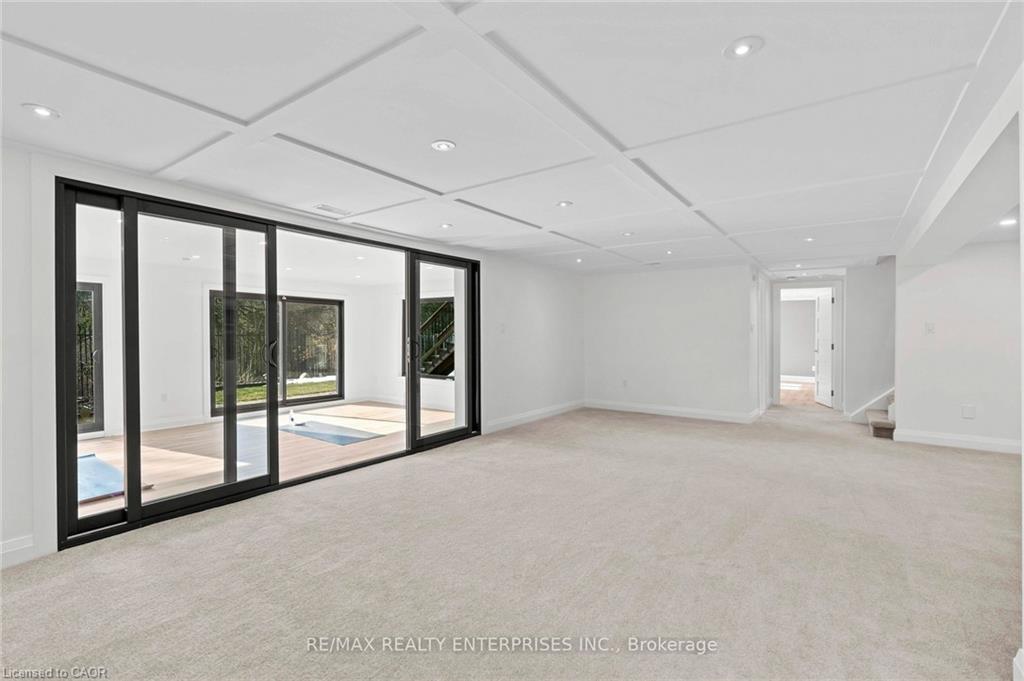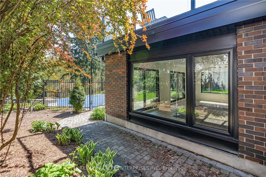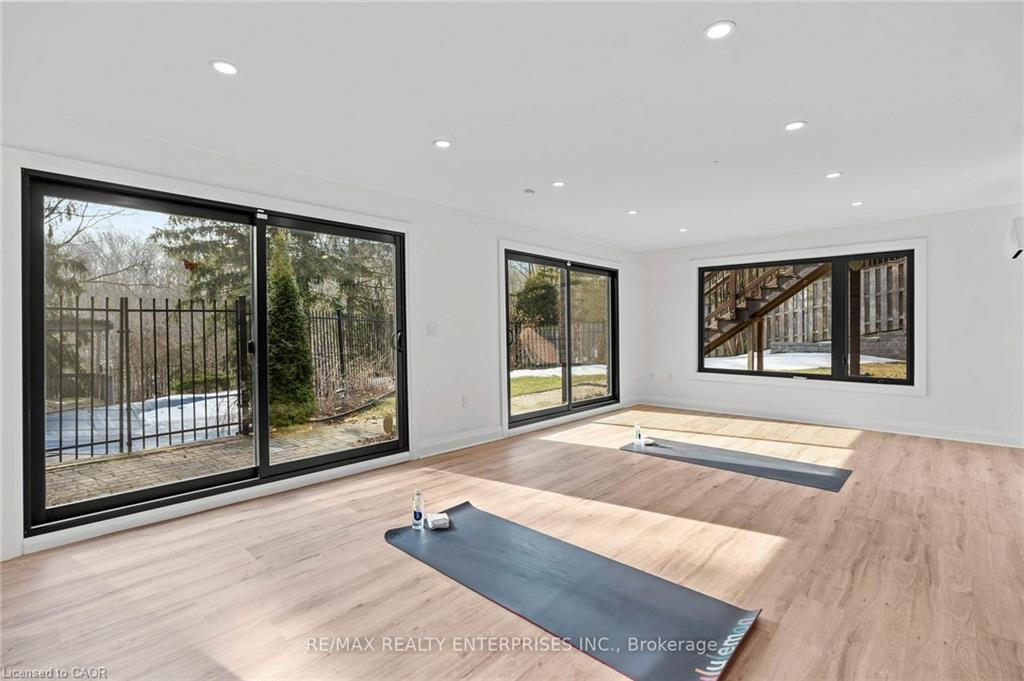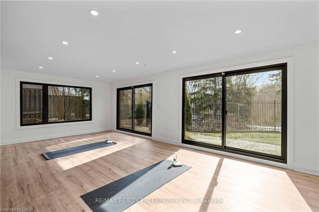 professionally waterproofed for peace of mind, expands the living space with a large family room featuring a fireplace, and fourth bedroom/office with picturesque ravine views, and a renovated 3-piece bath with an oversized glass shower. A versatile recreation/fitness studio/sunroom completely renovated including floor to ceiling windows and sliding doors, it’s