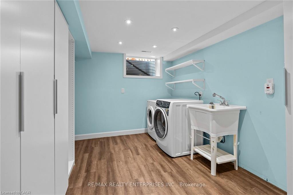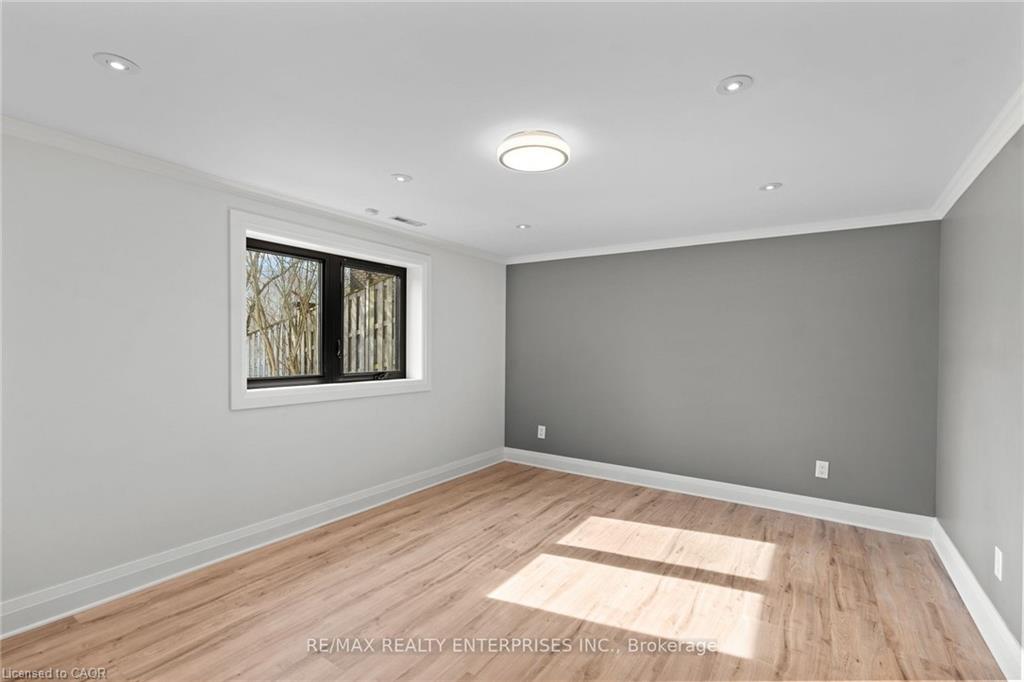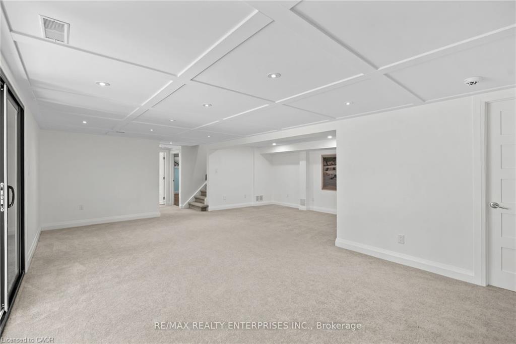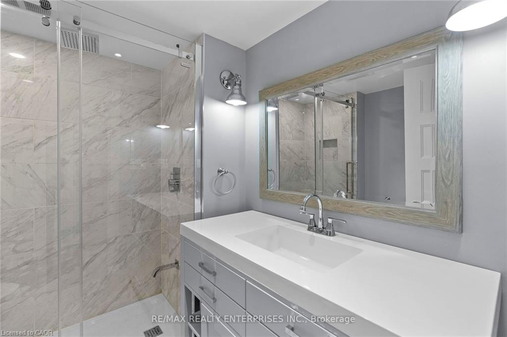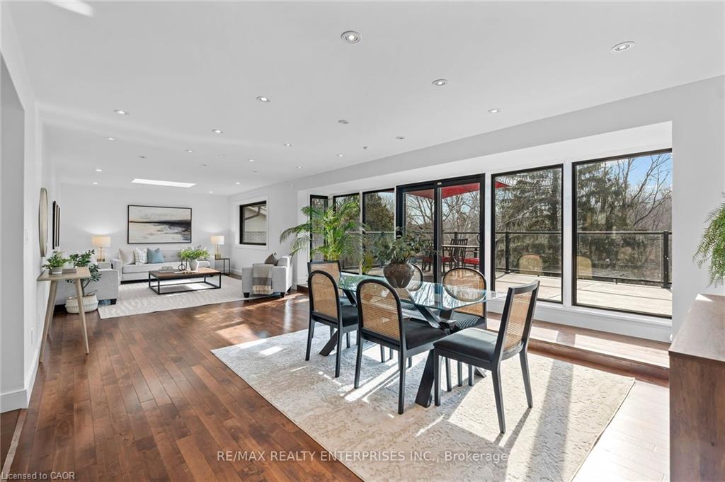 professionally waterproofed for peace of mind, expands the living space with a large family room featuring a fireplace, and fourth bedroom/office with picturesque ravine views, and a renovated 3-piece bath with an oversized glass shower. A versatile recreation/fitness studio/sunroom completely renovated including floor to ceiling windows and sliding doors, it’s