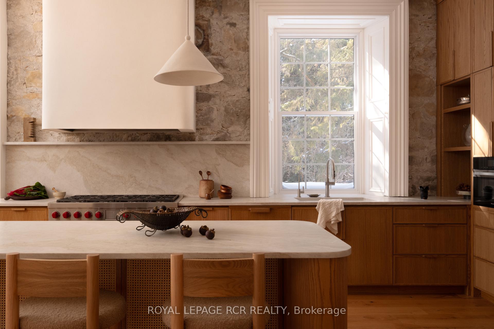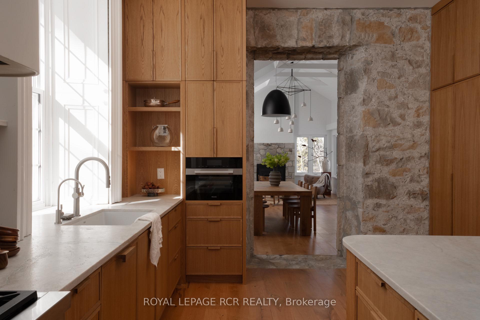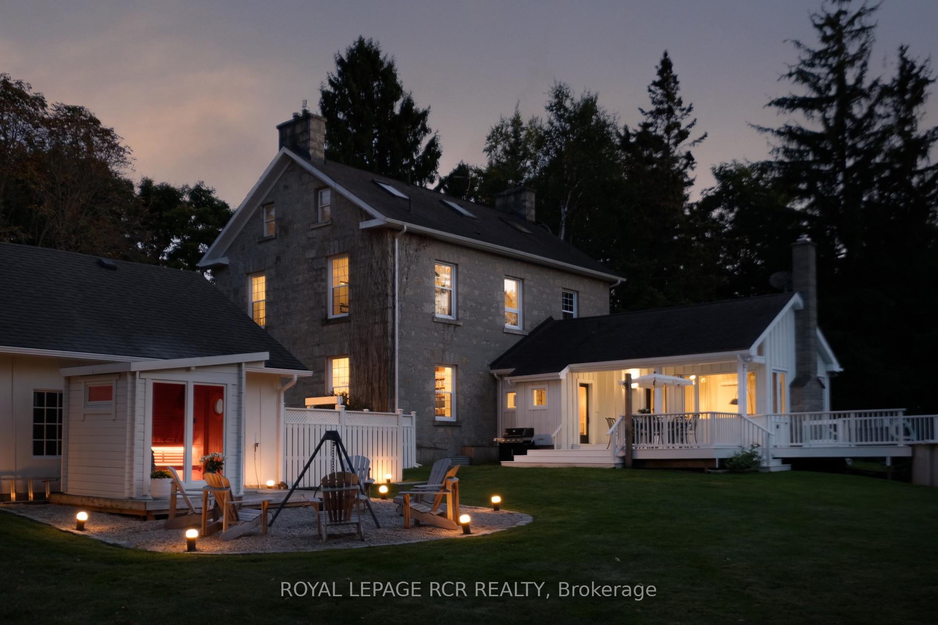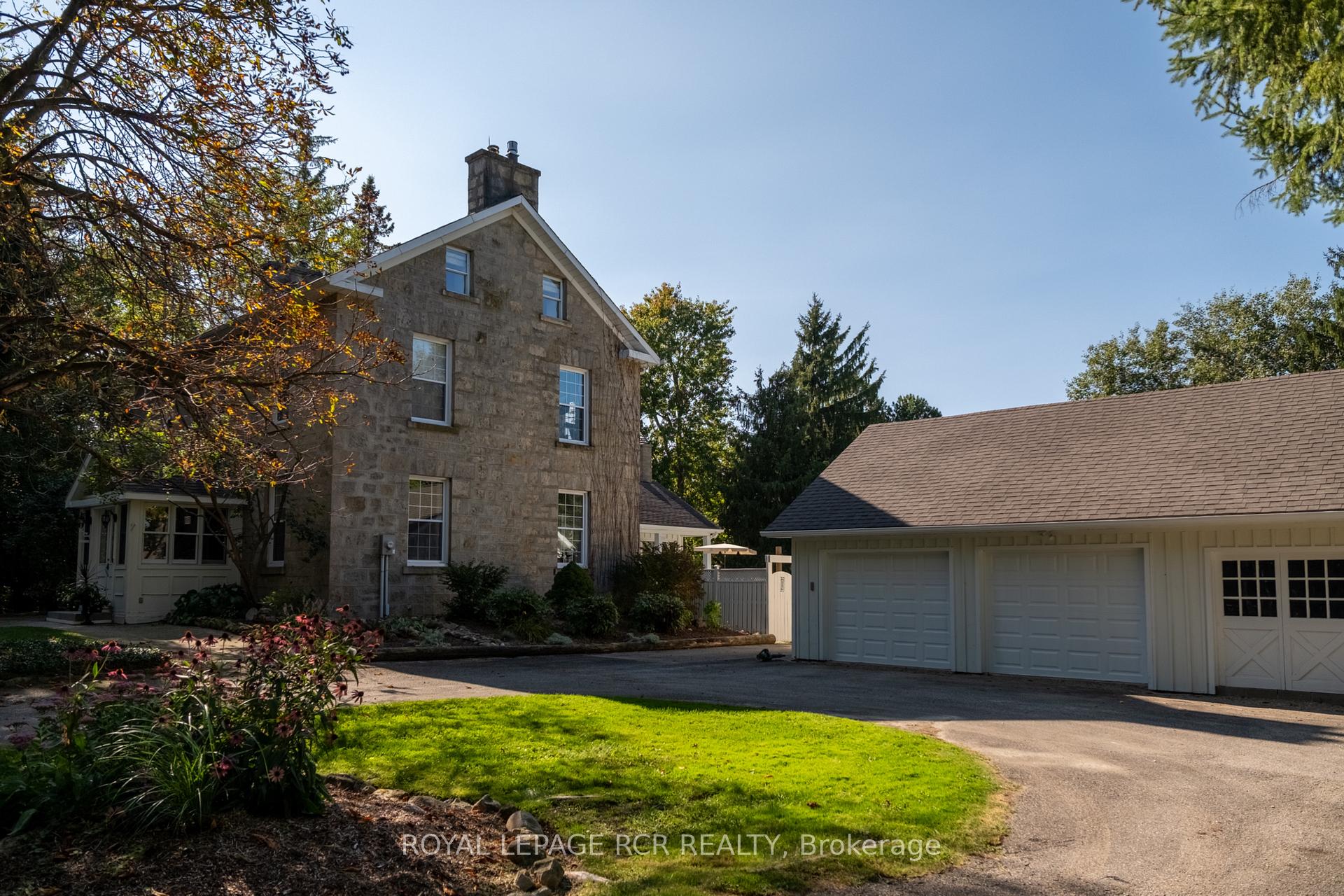Historic soul meets a high-design heartbeat. Welcome to Stonecrop, an iconic 1857 stone manor reimagined as a warm, soulful sanctuary. Just outside of Elora, set on nearly 10 private acres at the end of a dramatic tree-lined driveway, this is a rare dialogue between historic provenance and refined organic luxury. Inside, soaring 12-foot ceilings, original plaster medallions, and dramatic stone walls create an inviting, layered atmosphere. At the heart of the home, a show-stopping kitchen, recently featured in Architectural Digest (!!!), anchors daily life and entertaining. Rooted in timeless design, it blends heritage architecture with modern precision through custom wood cabinetry, integrated top-tier appliances, and natural materials in balance. The living and dining areas continue the story, where a stone fireplace is set beneath vaulted ceilings, and skylights that flood the space with light. The main level also offers a family room, dreamy private office, and magazine worthy powder room. Upstairs, 5 spacious bedrooms span 2 levels, each defined by natural light and quiet luxury. The second floor features wide-plank wood flooring, 3 large bedrooms, and a beautifully appointed 4-piece bath. The third floor is fully finished with vaulted ceilings, exposed beams, 2 additional bedrooms, a sitting area, and a 3-piece bath. The partially finished basement offers in-law suite potential with a large bedroom, kitchenette rough-in, 4-piece bath, and separate entrance. Geothermal heating supports the home with modern efficiency. Outdoors, a heated above-ground pool, outdoor sauna, fire pit lounge, and outdoor pizza kitchen set the tone for unforgettable summers. An orchard, gardens, and private trails wind through nearly 10 acres of countryside. The impressive 58-foot detached garage includes a dedicated home gym and ample space for cars, toys, and equipment, completing this private country compound. AD-worthy interiors. Expansive acreage. Stonecrop is iconic.