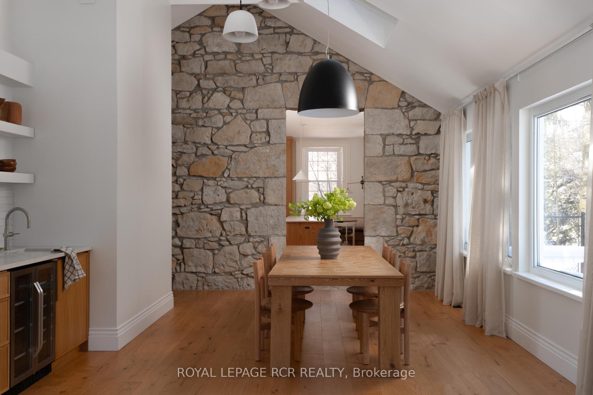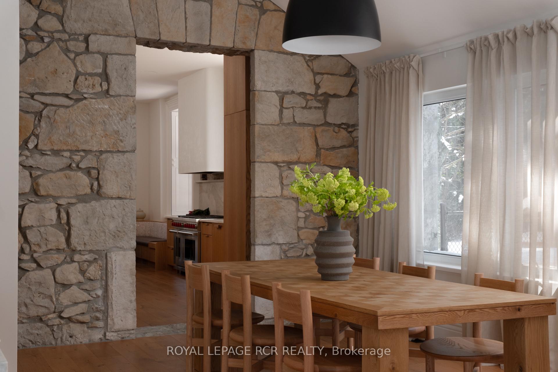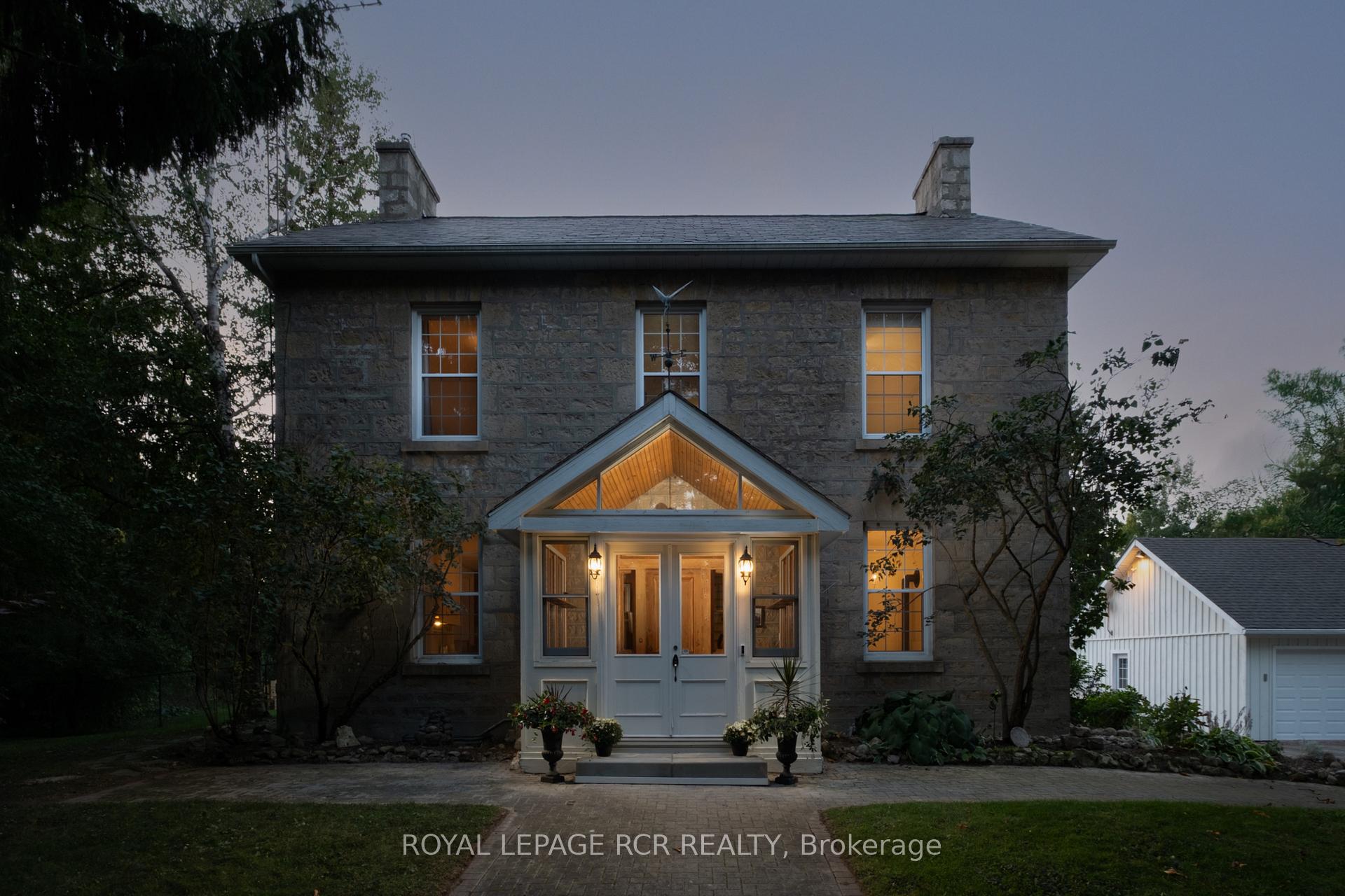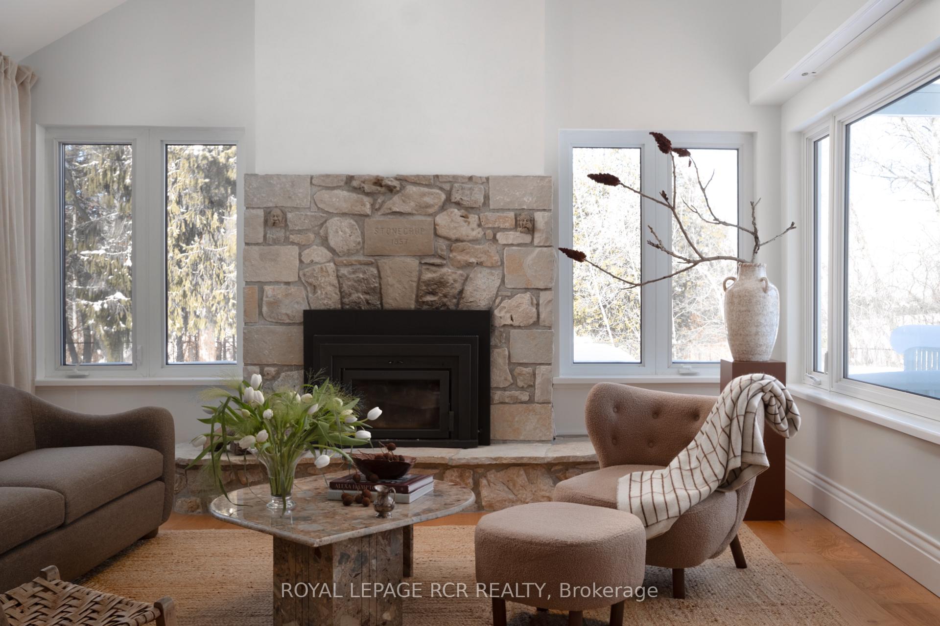 Historic soul meets a high-design heartbeat. Welcome to Stonecrop, an iconic 1857 stone manor reimagined as a warm, soulful sanctuary. Just outside of Elora, set on nearly 10 private acres at the end of a dramatic tree-lined driveway, this is a rare dialogue between historic provenance and refined organic luxury. Inside, soaring 12-foot ceilings, original plaster medallions, and dramatic stone walls create an inviting, layered atmosphere. At the heart of the home, a show-stopping kitchen, recently featured in Architectural Digest (!!!), anchors daily life and entertaining. Rooted in timeless design, it blends heritage architecture with modern precision through custom wood cabinetry, integrated top-tier appliances, and natural materials in balance. The living and dining areas continue the story, where a stone fireplace is set beneath vaulted ceilings, and skylights that flood the space with light. The main level also offers a family room, dreamy private office, and magazine worthy powder room. Upstairs, 5 spacious bedrooms span 2 levels, each defined by natural light and quiet luxury. The second floor features wide-plank wood flooring, 3 large bedrooms, and a beautifully appointed 4-piece bath. The third floor is fully finished with vaulted ceilings, exposed beams, 2 additional bedrooms, a sitting area, and a 3-piece bath. The partially finished basement offers in-law suite potential with a large bedroom, kitchenette rough-in, 4-piece bath, and separate entrance. Geothermal heating supports the home with modern efficiency. Outdoors, a heated above-ground pool, outdoor sauna, fire pit lounge, and outdoor pizza kitchen set the tone for unforgettable summers. An orchard, gardens, and private trails wind through nearly 10 acres of countryside. The impressive 58-foot detached garage includes a dedicated home gym and ample space for cars, toys, and equipment, completing this private country compound. AD-worthy interiors. Expansive acreage. Stonecrop is iconic.