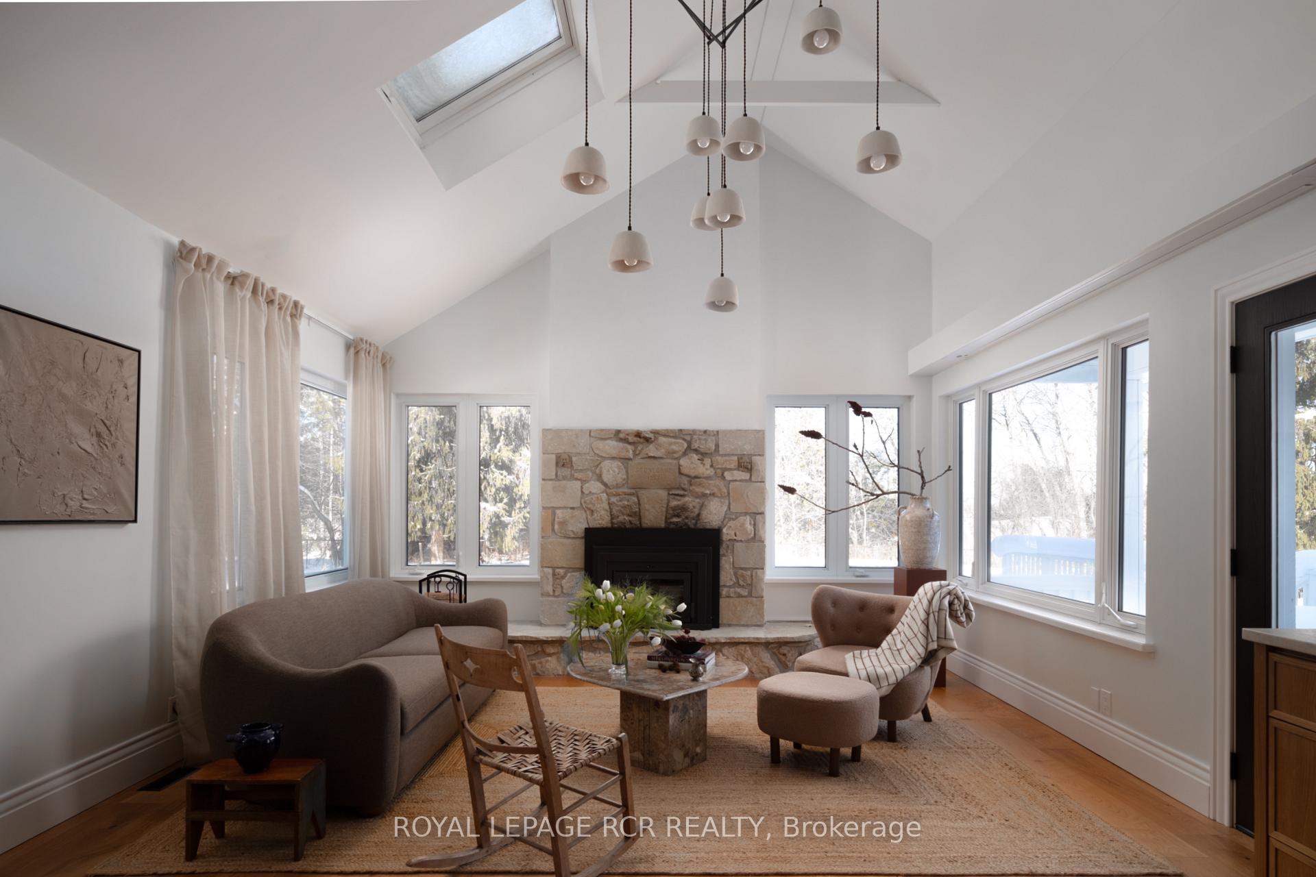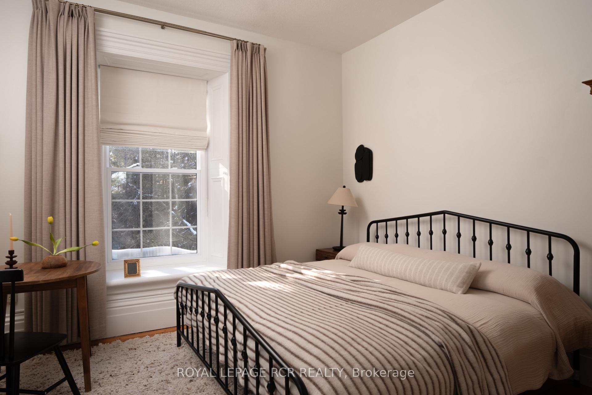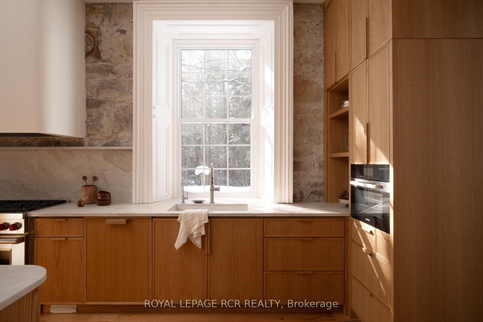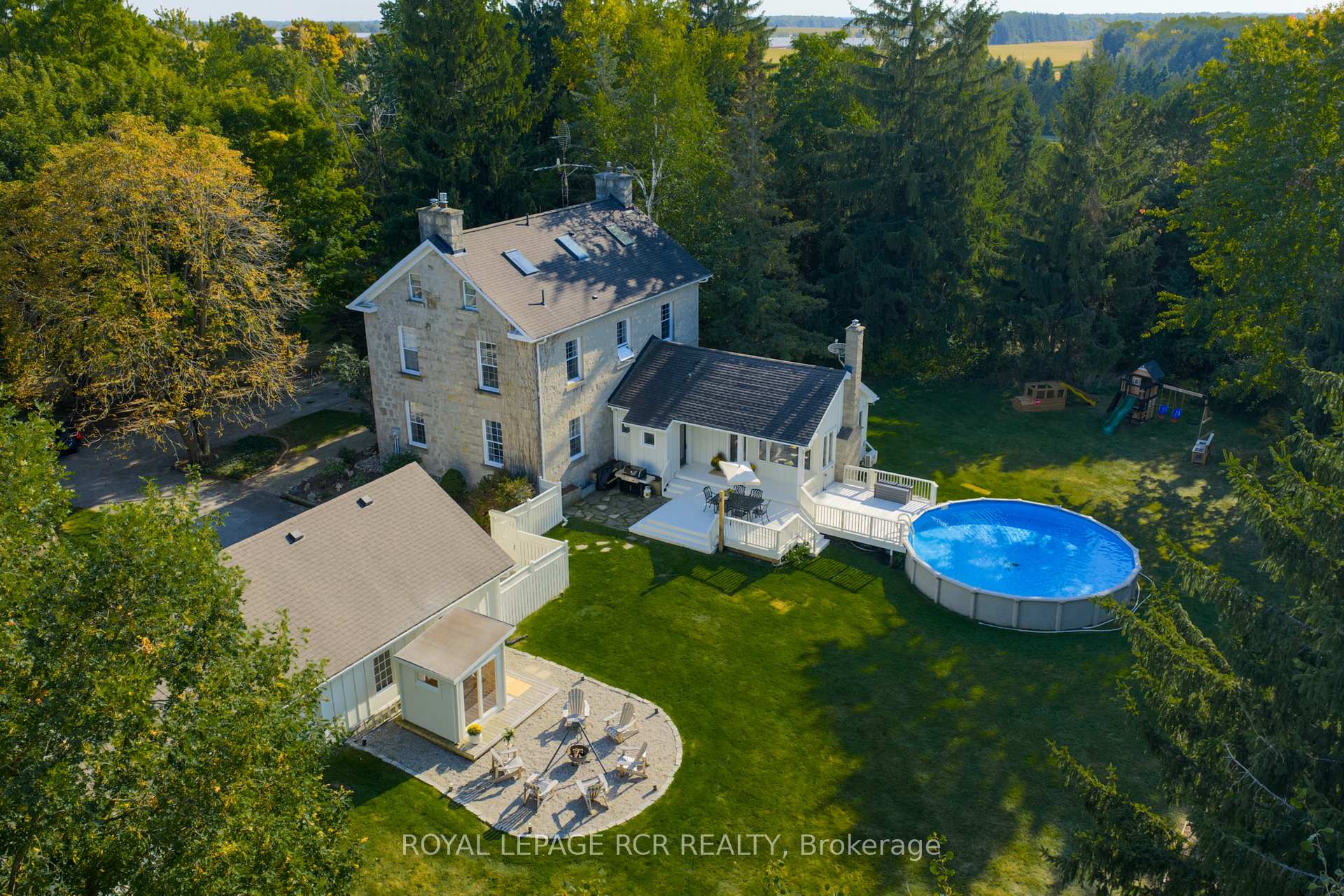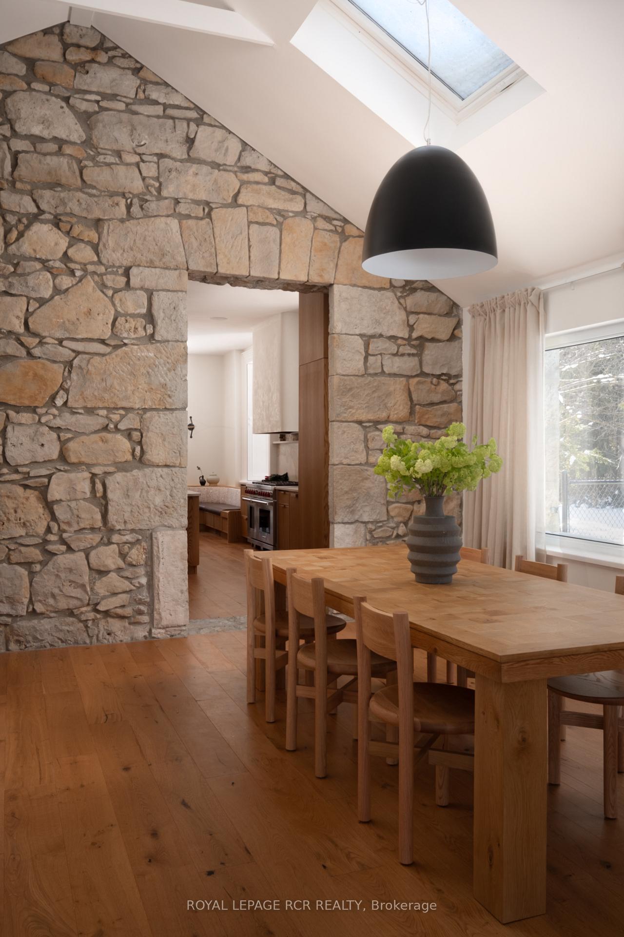 Historic soul meets a high-design heartbeat. Welcome to Stonecrop, an iconic 1857 stone manor reimagined as a warm, soulful sanctuary. Just outside of Elora, set on nearly 10 private acres at the end of a dramatic tree-lined driveway, this is a rare dialogue between historic provenance and refined organic luxury. Inside, soaring 12-foot ceilings, original plaster medallions, and dramatic stone walls create an inviting, layered atmosphere. At the heart of the home, a show-stopping kitchen, recently featured in Architectural Digest (!!!), anchors daily life and entertaining. Rooted in timeless design, it blends heritage architecture with modern precision through custom wood cabinetry, integrated top-tier appliances, and natural materials in balance. The living and dining areas continue the story, where a stone fireplace is set beneath vaulted ceilings, and skylights that flood the space with light. The main level also offers a family room, dreamy private office, and magazine worthy powder room. Upstairs, 5 spacious bedrooms span 2 levels, each defined by natural light and quiet luxury. The second floor features wide-plank wood flooring, 3 large bedrooms, and a beautifully appointed 4-piece bath. The third floor is fully finished with vaulted ceilings, exposed beams, 2 additional bedrooms, a sitting area, and a 3-piece bath. The partially finished basement offers in-law suite potential with a large bedroom, kitchenette rough-in, 4-piece bath, and separate entrance. Geothermal heating supports the home with modern efficiency. Outdoors, a heated above-ground pool, outdoor sauna, fire pit lounge, and outdoor pizza kitchen set the tone for unforgettable summers. An orchard, gardens, and private trails wind through nearly 10 acres of countryside. The impressive 58-foot detached garage includes a dedicated home gym and ample space for cars, toys, and equipment, completing this private country compound. AD-worthy interiors. Expansive acreage. Stonecrop is iconic.