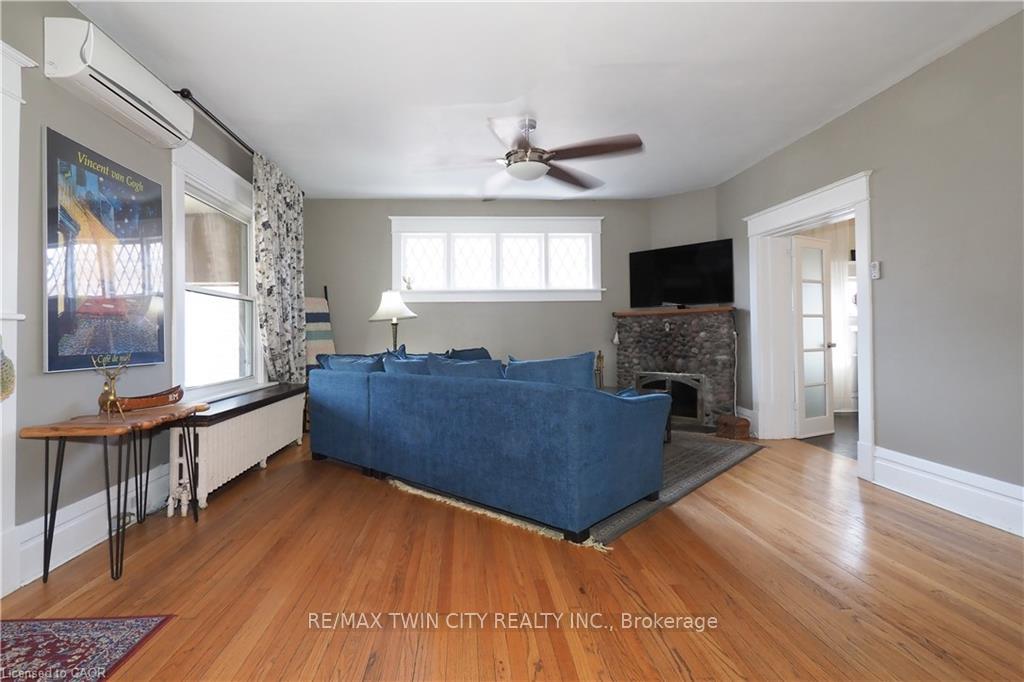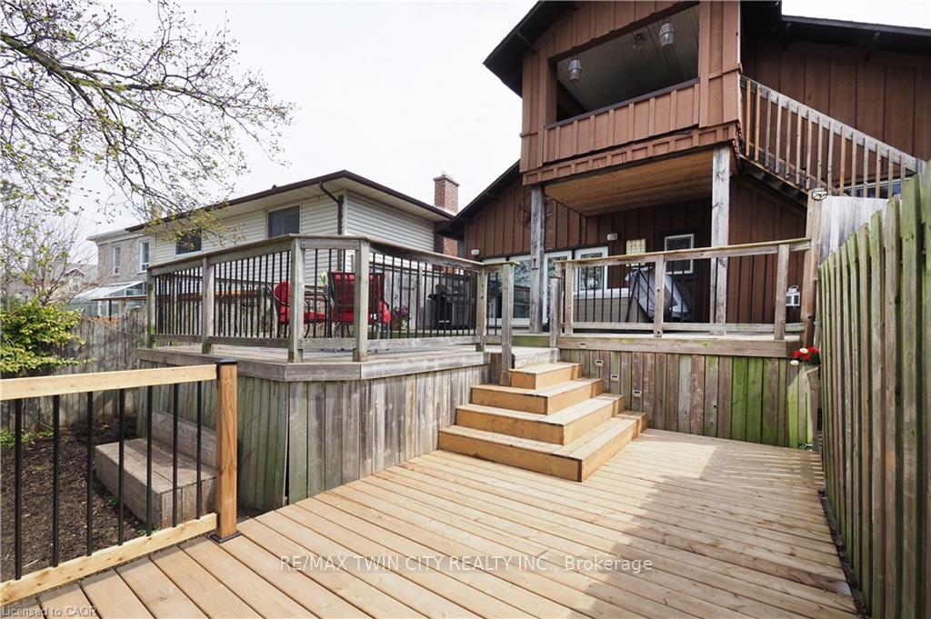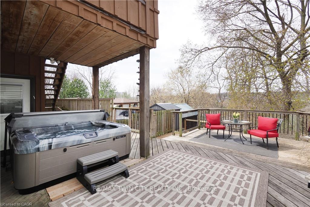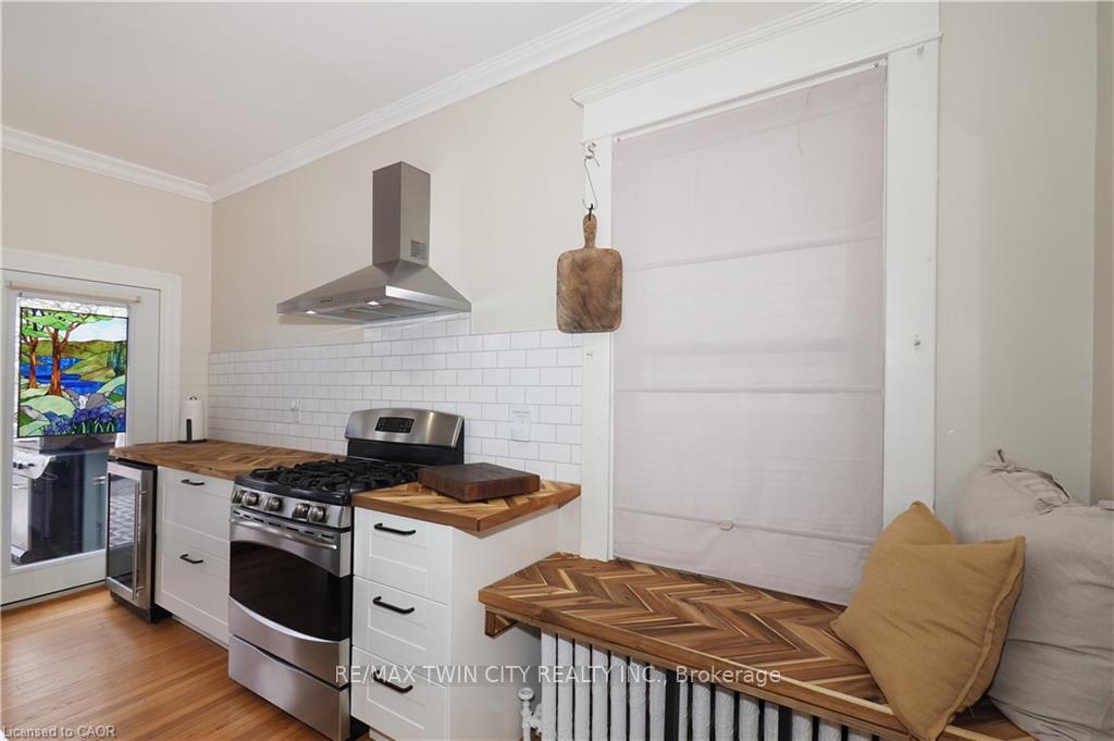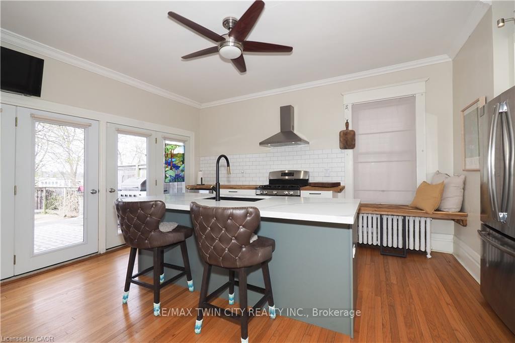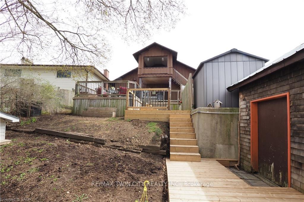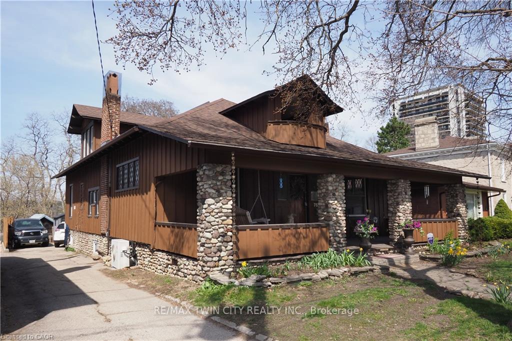 Absolutely charming, single detached 1 1/2 storey 3 bedroom home in a quiet neighbourhood steps from downtown Cambridge & all amenities. Main floor features a spacious family room with 1 of 4 wood burning fireplaces, a stunning new custom kitchen with quartz island, stainless steel appliances (including Miele dishwasher, gas stove, large fridge, wine cooler & microwave). Beautiful cabinetry with fantastic hidden drawers! Walk-out to the deck & hottub overlooking the tiered deck & yard. Massive front porch adds character to this special home. Updated main floor 3 pc bathroom with soaker tub, 2 bedrooms, laundry and second kitchenette (ideal for a possible inlaw suite with 2 separate entrances). The upper level loft is perfect for a primary bedroom or accessory apartment space including a 3 pc bathroom & balcony with it’s own exterior staircase! Basement finished with games room, utility space & tons of storage! The fully fenced private yard includes a lovely deck and covered hot-tub area. Steps down to the shed and a Detached Workshop that also has potential for many uses! Parking for 2+ cars. This is a one of a kind home!