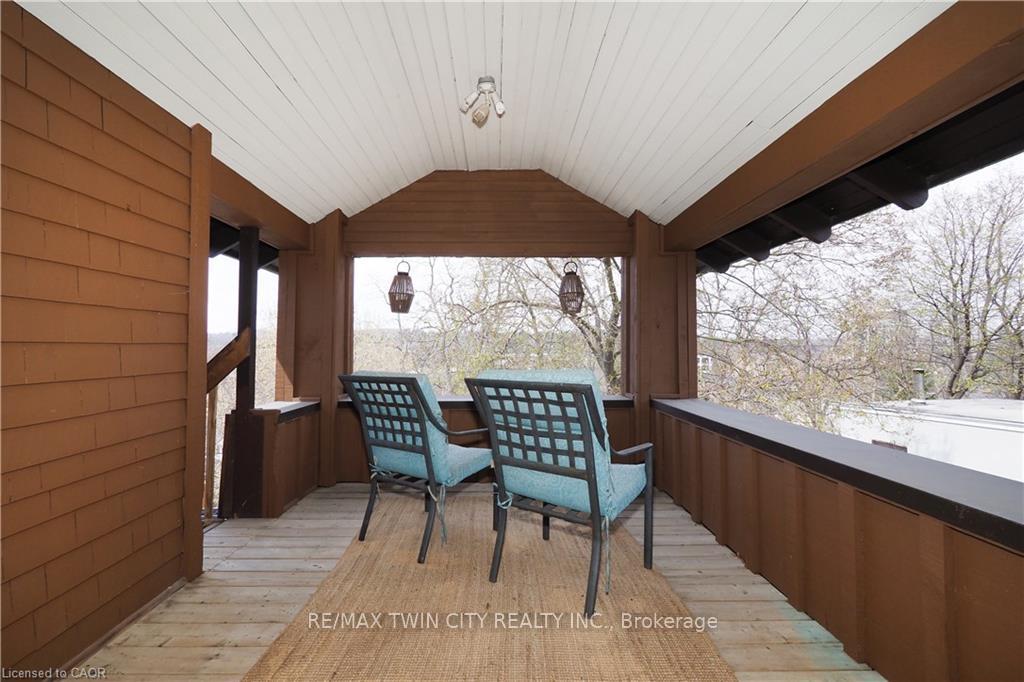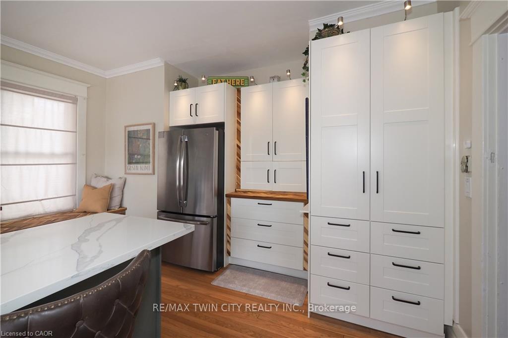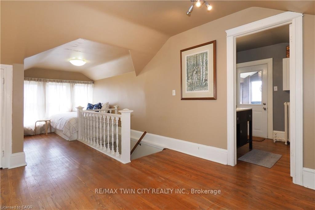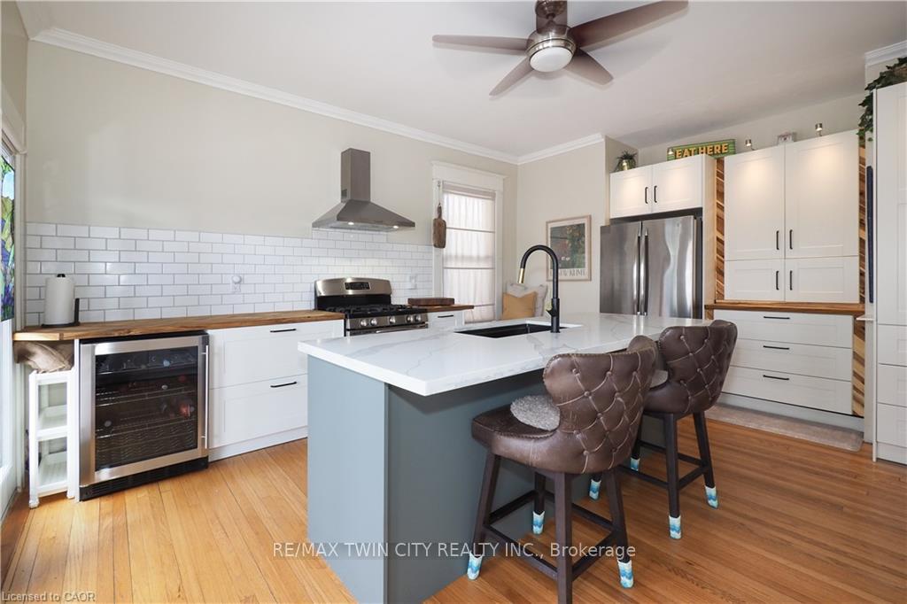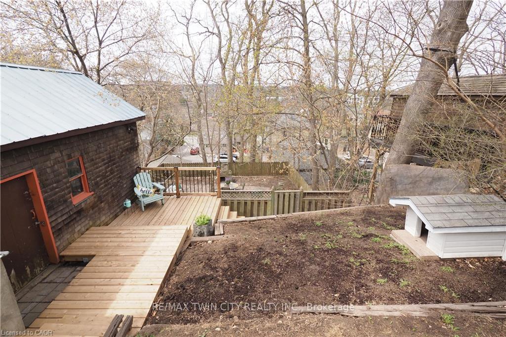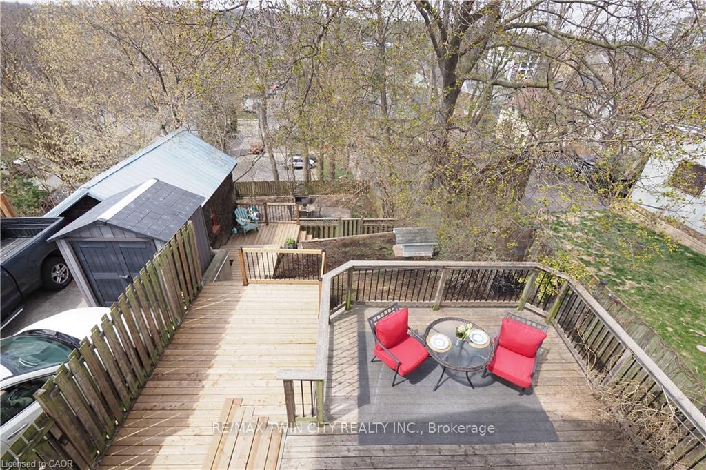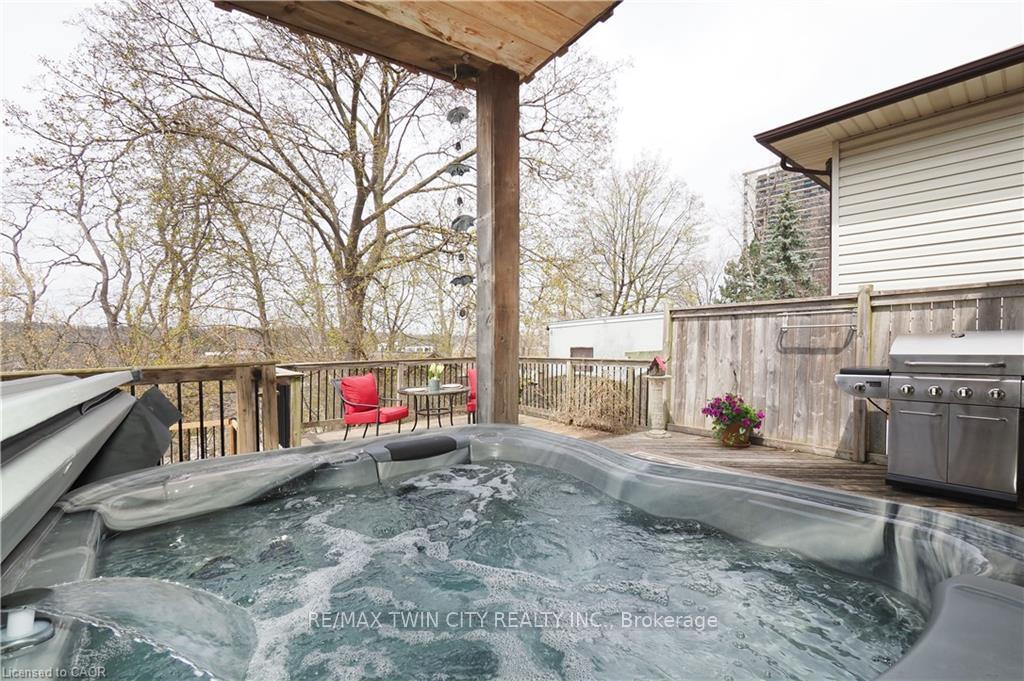 Absolutely charming, single detached 1 1/2 storey 3 bedroom home in a quiet neighbourhood steps from downtown Cambridge & all amenities. Main floor features a spacious family room with 1 of 4 wood burning fireplaces, a stunning new custom kitchen with quartz island, stainless steel appliances (including Miele dishwasher, gas stove, large fridge, wine cooler & microwave). Beautiful cabinetry with fantastic hidden drawers! Walk-out to the deck & hottub overlooking the tiered deck & yard. Massive front porch adds character to this special home. Updated main floor 3 pc bathroom with soaker tub, 2 bedrooms, laundry and second kitchenette (ideal for a possible inlaw suite with 2 separate entrances). The upper level loft is perfect for a primary bedroom or accessory apartment space including a 3 pc bathroom & balcony with it’s own exterior staircase! Basement finished with games room, utility space & tons of storage! The fully fenced private yard includes a lovely deck and covered hot-tub area. Steps down to the shed and a Detached Workshop that also has potential for many uses! Parking for 2+ cars. This is a one of a kind home!