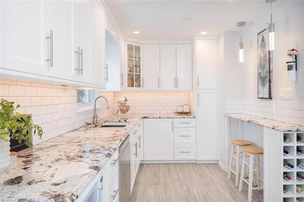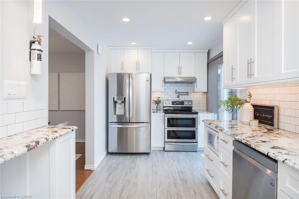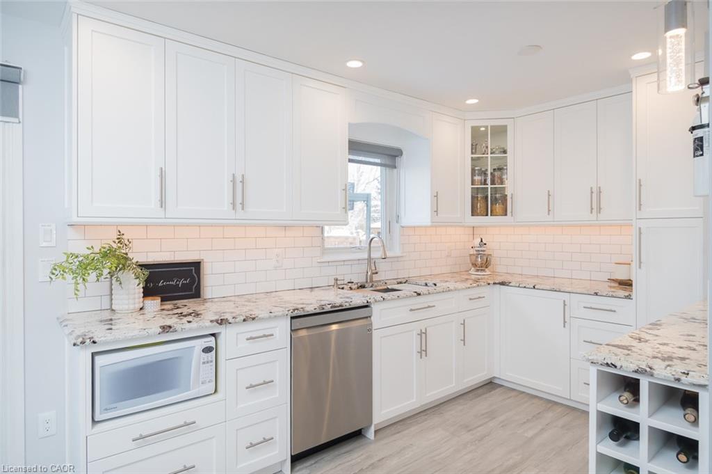Meticulously cared for and maintained, this detached home offers an ideal family layout on a generous lot, with extensive updates. The main floor features hardwood flooring throughout, a front entry with closet, and an open living and dining area that flows into the renovated kitchen. that features granite countertops, custom cabinetry, stainless steel appliances, updated hardware and fixtures, pot lights, and a breakfast bar with seating.