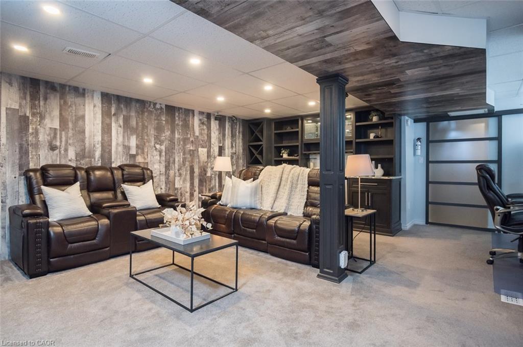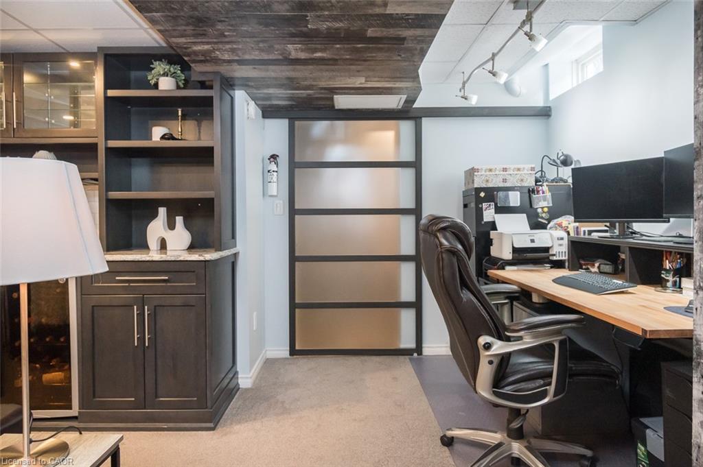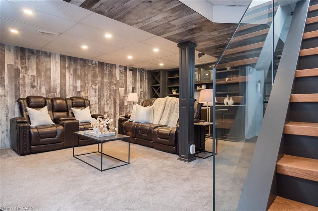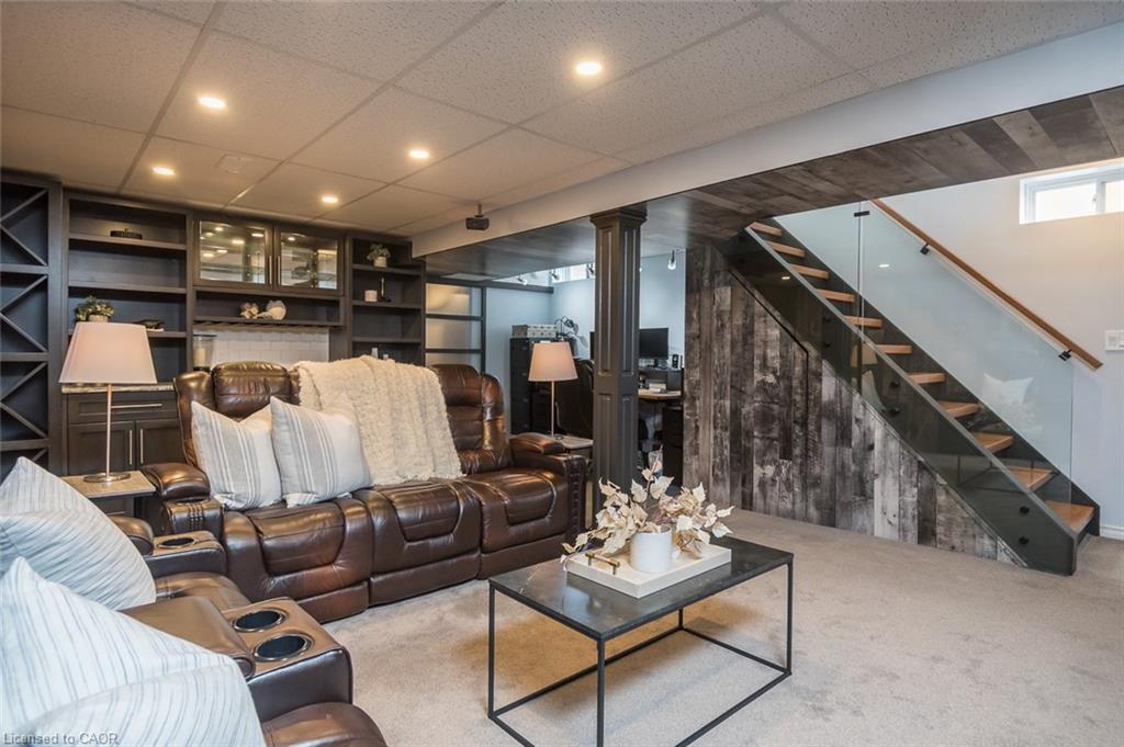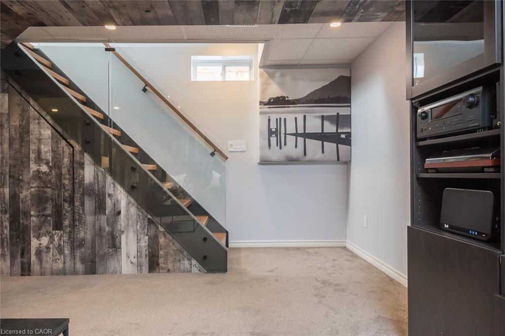 The custom renovated lower level provides a flexible extension of the living space. Finished with a glass staircase detail and a wood board accent wall, this level includes a built-in granite bar with wine fridge, bar fridge, and cabinetry, along with space suited to a home office, lounge, or recreation area.