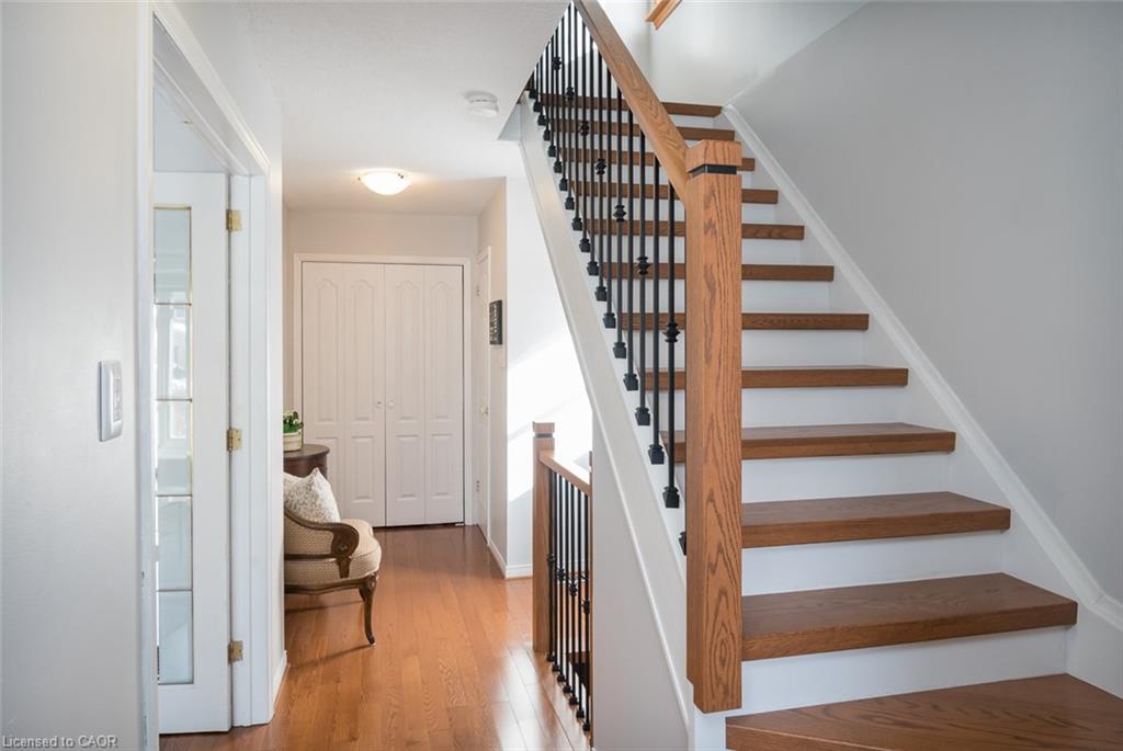 Upstairs, a wood staircase leads to three well-proportioned bedrooms, including a primary bedroom with hardwood flooring and two additional bedrooms all with closet space.