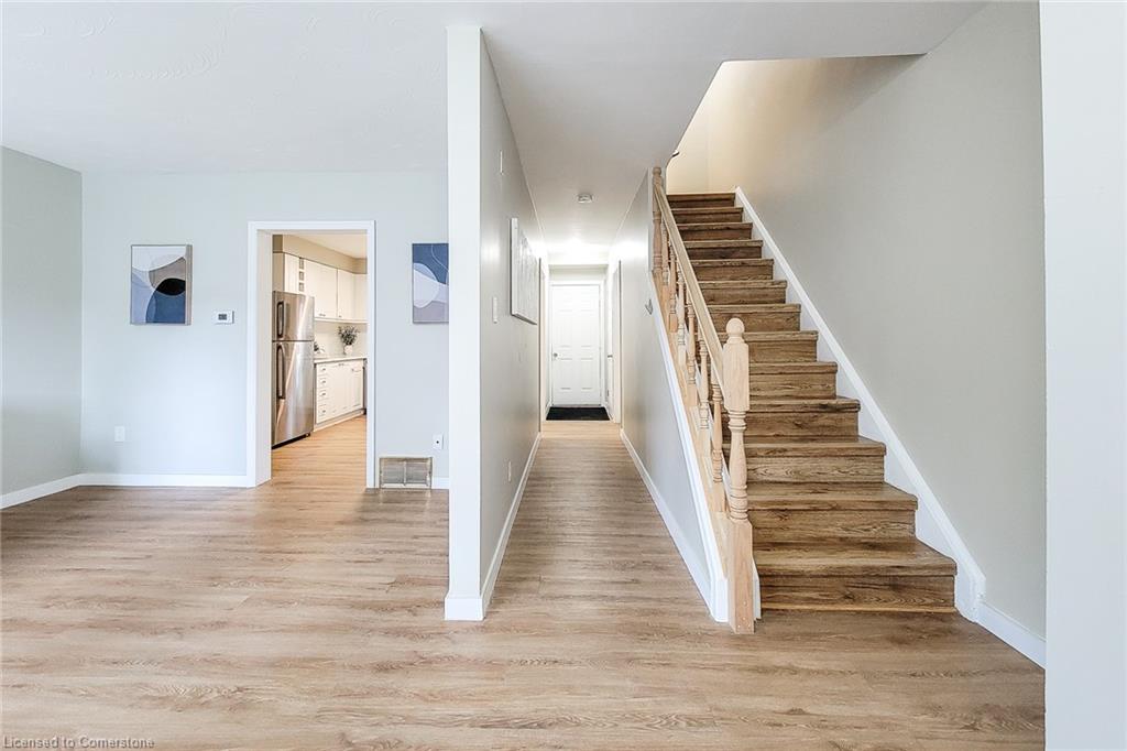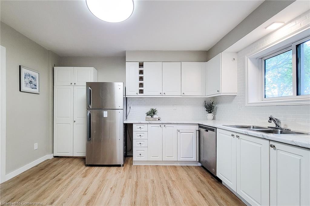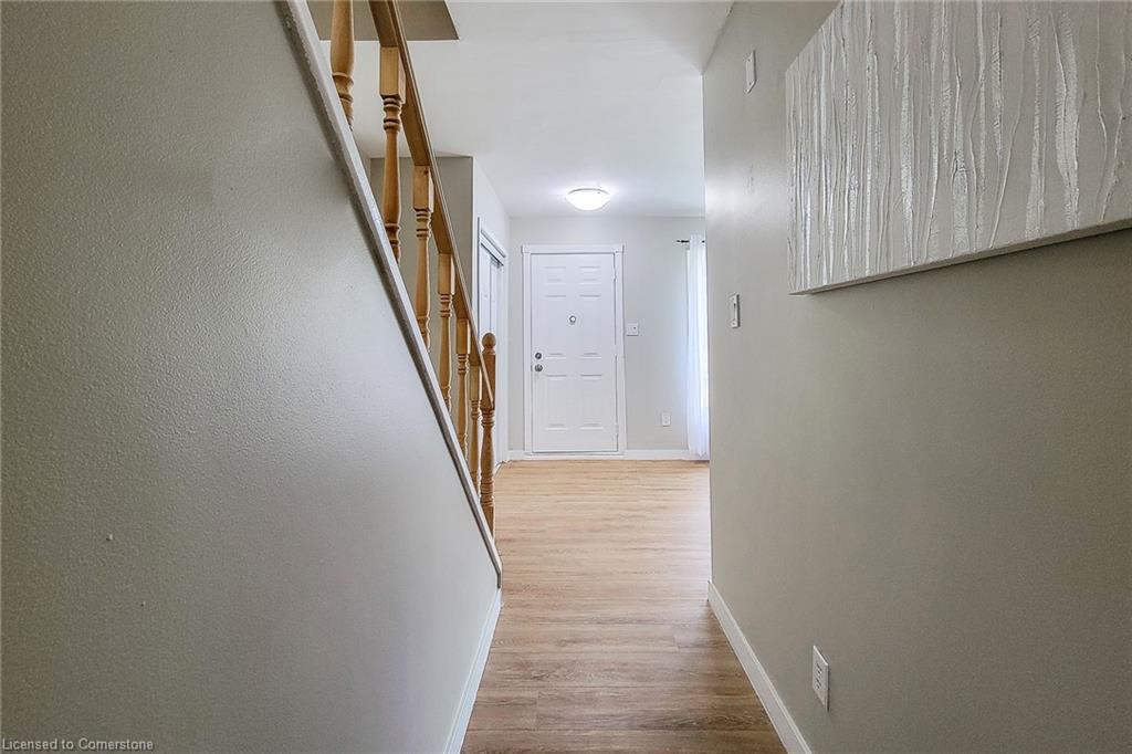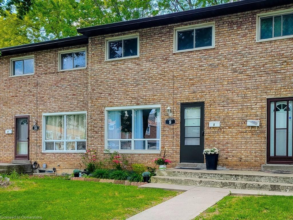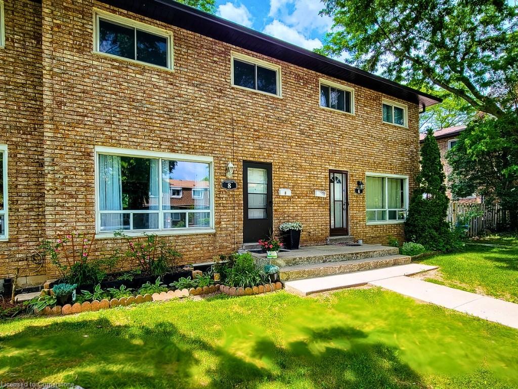 RENOVATED! This gorgeous 3 bedroom, 3-bathroom condo townhouse is ideal for first time buyers looking for MOVE-IN READY. Nothing to do, just move in! Loads of natural light on the main level welcomes you through the living area and into the elegant, white kitchen; its super spacious with beautiful stainless appliances and tons of storage space, large enough for a good-sized kitchen table and 4 chairs. Upstairs you’ll find 3 bedrooms with a fully renovated 3-piece main bathroom. More to come in the finished basement, which features a secondary studio suite with a mini kitchenette and 3-piece bathroom, perfect for guests, friends, or family to stay! Rounding out the home is the lovely private backyard, fully fenced with a lockable gate and an assigned parking space in the parking lot. The 2025 renovation includes new paint throughout, new wood railing on main staircase, new light fixtures on main and second level, and new drop ceiling and pot lights in basement. In addition, renovated main floor and second floor bathrooms (2023), updated kitchen and new flooring (2022), and new laminate flooring on the second level (2018). Move in and enjoy! In addition to the usuals the condo fee includes water, cable TV, and high-speed internet, a great savings! Ideally located near all amenities. Eastgate Square shopping centre just a few minutes walk, close to restaurants, schools, and parks, and just a few minutes driving to Red Hill Valley Parkway for easy commuting.