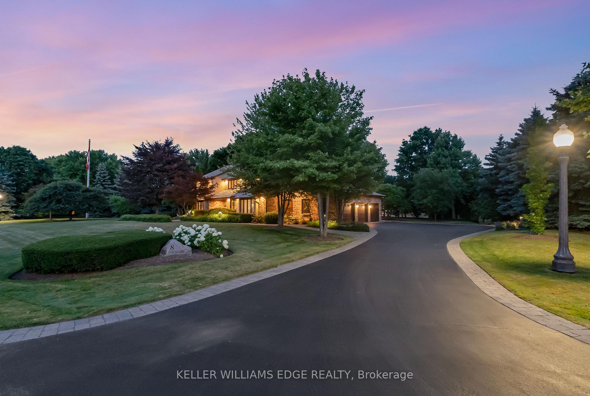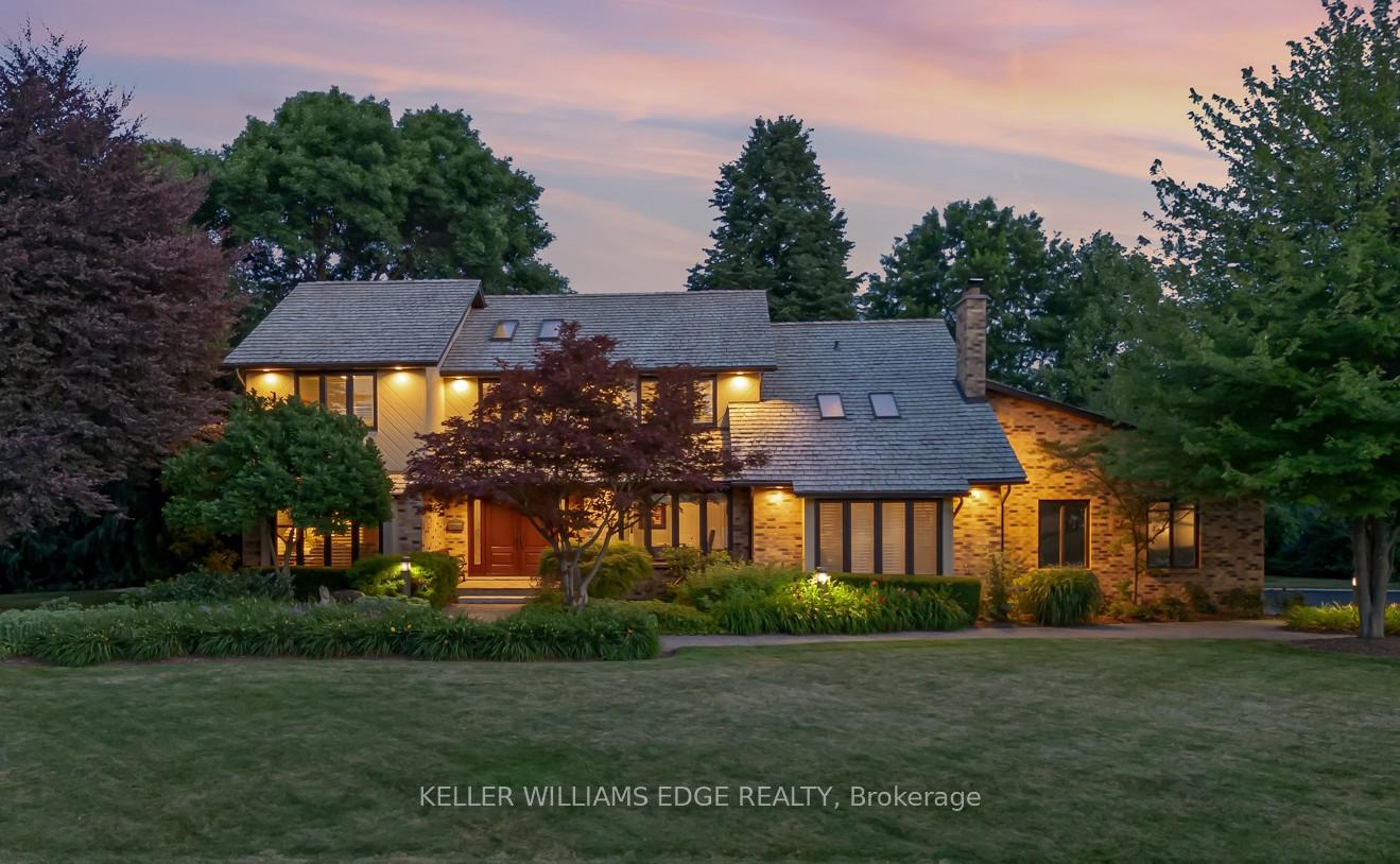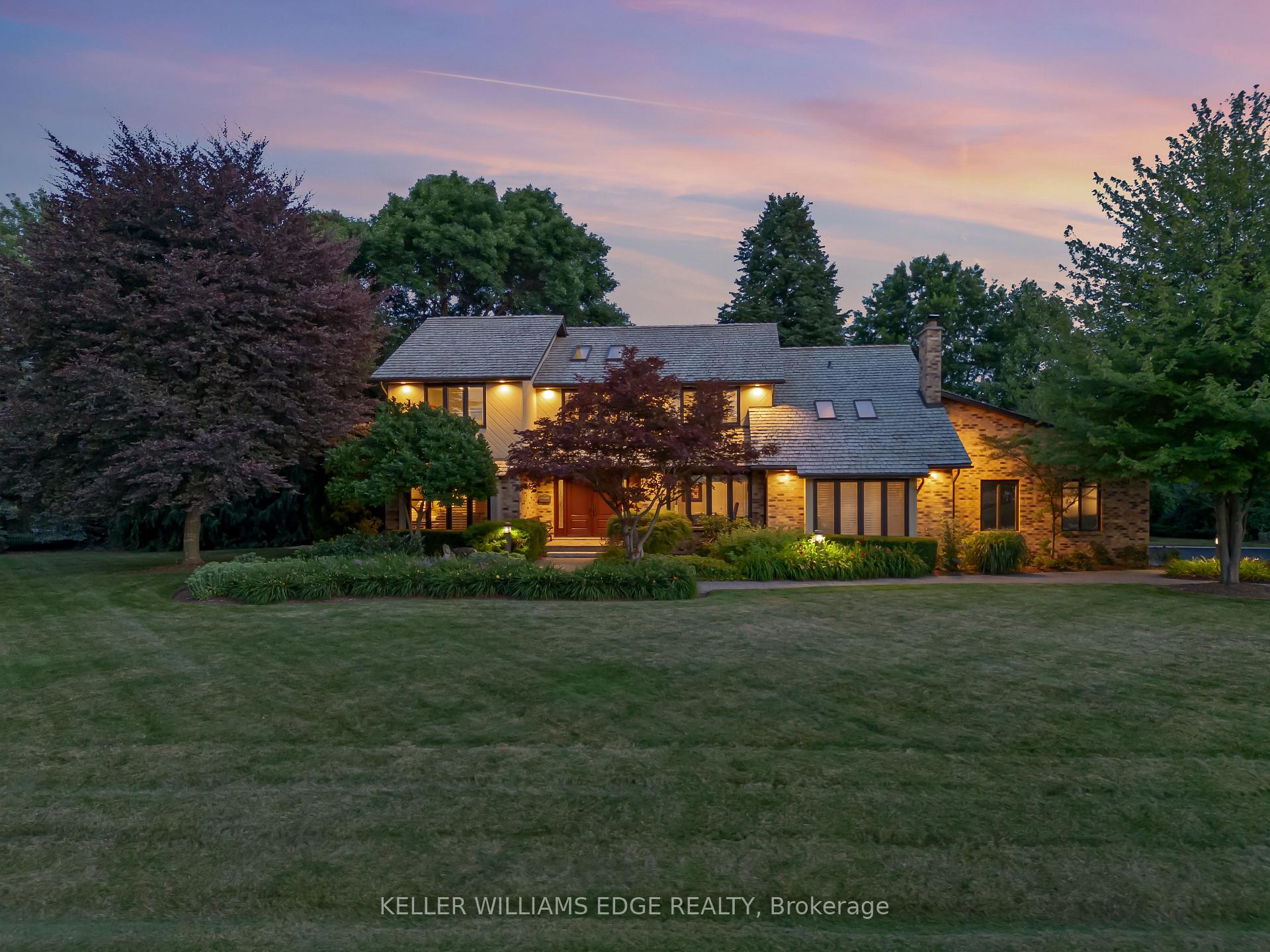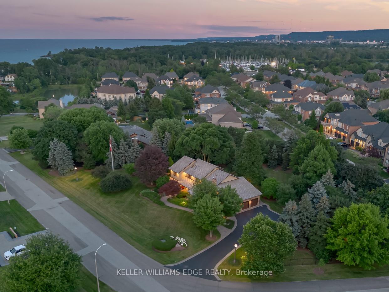 LAKESIDE LUXURY – One-Acre Estate Lot. Discover refined living in Stoney Creek’s most coveted executive lakeside enclave. Custom-built w/over 5,400 sq. ft. of total living space, steps from Fifty Point Conservation Area & Marina, across from Lake Ontario. A soaring foyer welcomes you into a home of peaceful sophistication. Chef’s eat-in kitchen is the heart of the home: stainless steel appliances & granite countertops. Imported hardwood floors add warmth & timeless style. Main floor family room impresses w/vaulted ceilings & wood-burning fireplace w/natural brick surround, creating an elevated layout rarely found. Formal dining room, private office, living room, large bathroom, & mudroom w/laundry complete the thoughtfully designed main level. Upstairs, retreat to the expansive master suite w/spa-inspired five-piece ensuite: standalone tub, rejuvenating spa shower, granite finishes, & heated floors. Versatile lower level offers a remarkable recreation space w/pool table, mounted flat-screen TV, integrated sound system, gym, & ample storage areas, w/potential for an in-law suite. Enjoy outdoor dining beneath the covered portico, surrounded by mature, unique trees, professionally landscaped gardens, & a fully irrigated property. Space abounds w/potential for further customization to create your dream outdoor oasis. The grounds are a masterpiece of nature w/private sitting areas & a fire pit. The home has been continuously upgraded inside and out. 2025 updates include: new roof (50-year transferable warranty), skylights, dual sump system, renovated 3-car garage w/epoxy floors. The 22,000W Generac backup generator is hardwired to power the entire property in the event of a power outage. Minutes to top-tier amenities, QEW & Toronto/Buffalo airports & is at the gateway to Niagara’s Wine Region. The quiet cul-de-sac location offers the ultimate family-friendly sanctuary. This is more than a home – it’s a lifestyle of peace, privacy, & captivating views of Lake Ontario.