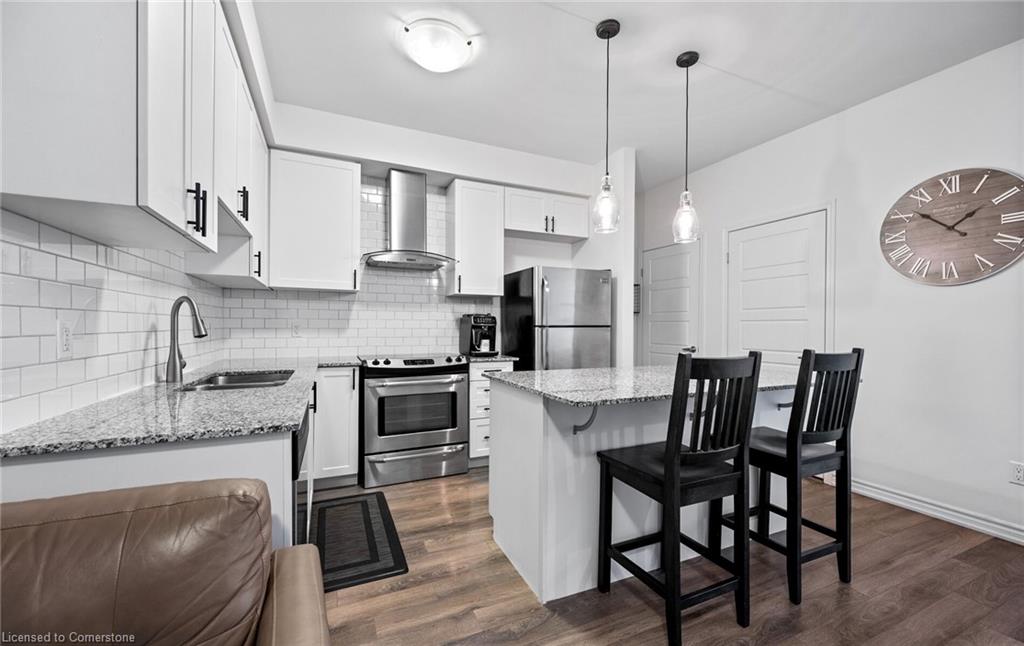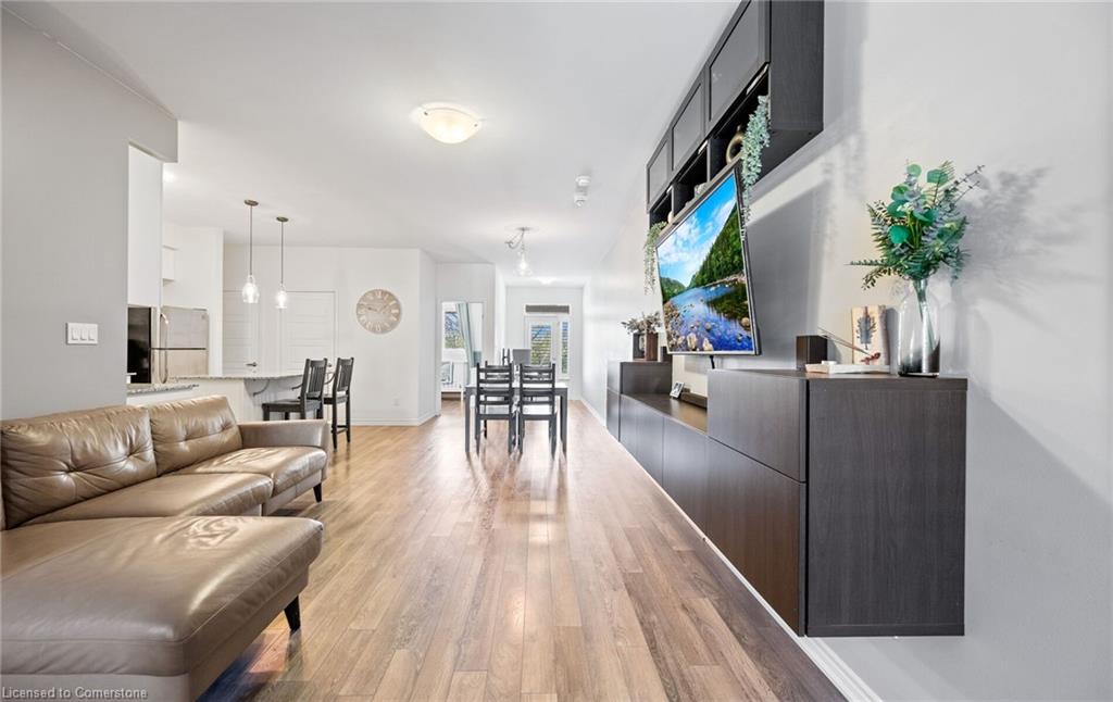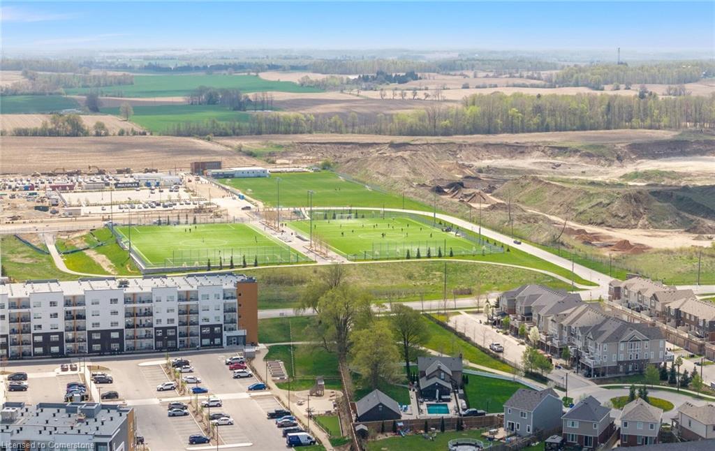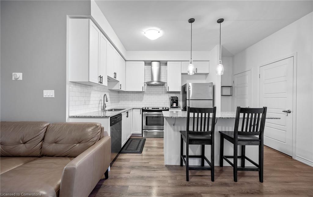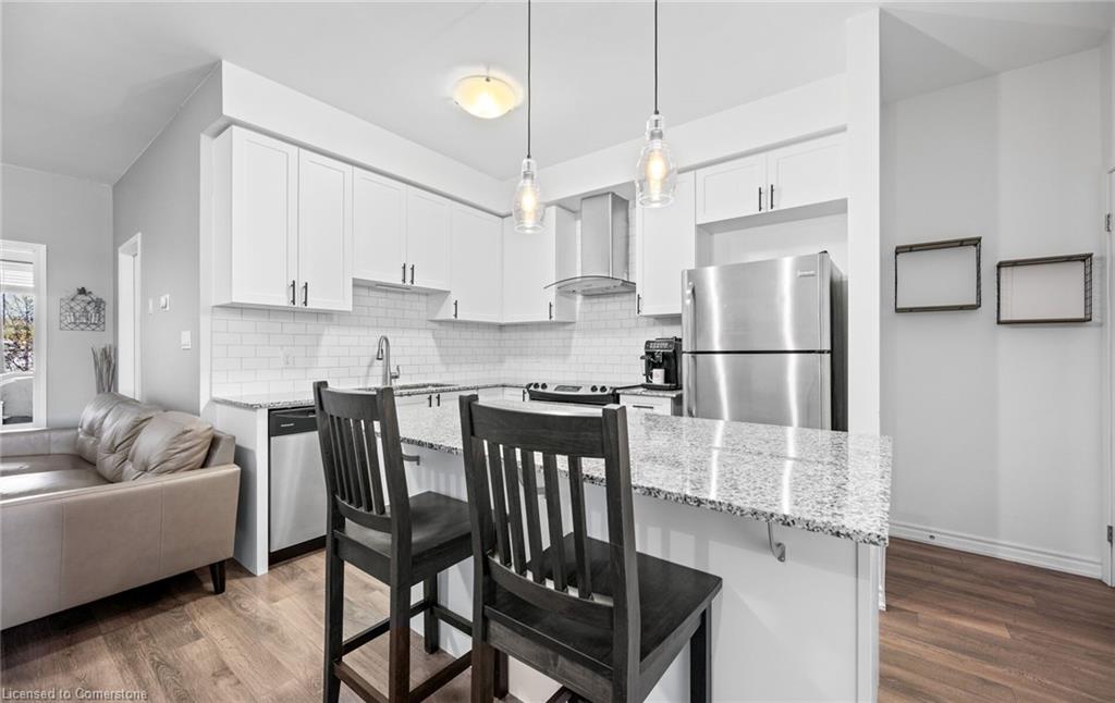 Step into this thoughtfully designed main-floor stacked townhome offering the ease of single-level living with the bonus of private basement access- combining convenience of a condo with the feel of bungalow living. This open-concept layout is highlighted by 9-foot ceilings, creating a bright and airy atmosphere that feels both spacious and welcoming. At the heart of the home is a spacious, contemporary kitchen, ideal for entertaining or family meals, with ample cabinetry and prep space. The seamless flow into the living and dining area is complemented by two covered patios – perfect for enjoying fresh air year-round, rain or shine. Every detail has been thoughtfully considered, from same-floor laundry to two private parking spots and a generously sized crawl space for all your storage needs – a true bonus in condo living. Located in a vibrant, family-friendly neighborhood, you’re just steps away from RBJ Schlegel Park, featuring a brand-new multi-million-dollar sportsplex with an indoor soccer field and aquatic centre. Within walking distance, you’ll find Longos Plaza, the new South Kitchener Library, and four public schools with childcare centres, all within 20 minutes. Commuters will appreciate the easy access to Highway 401 and Highway 7, making travel around the region effortless. Whether you’re a first-time buyer, downsizer, or investor, this home offers the ideal mix of lifestyle, location, and low-maintenance living. Don’t miss this opportunity to own a beautifully designed stacked townhome in one of Kitchener’s most desirable communities!