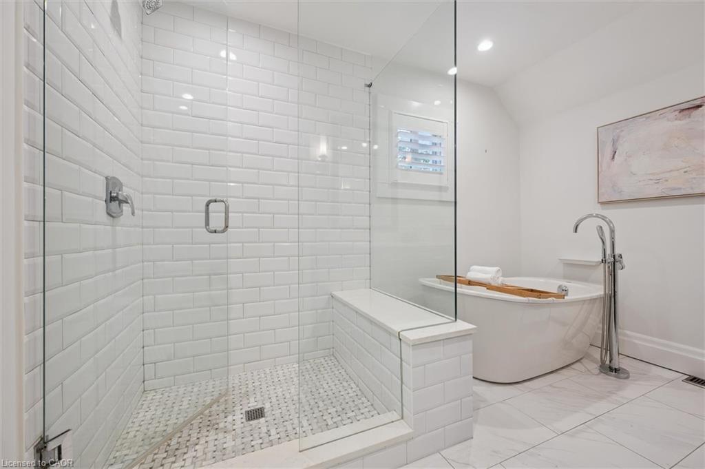 The updated bathroom feels like a spa retreat, showcasing a glass-walled walk-in shower and a stand-alone soaker tub, the perfect combination of luxury and relaxation.
