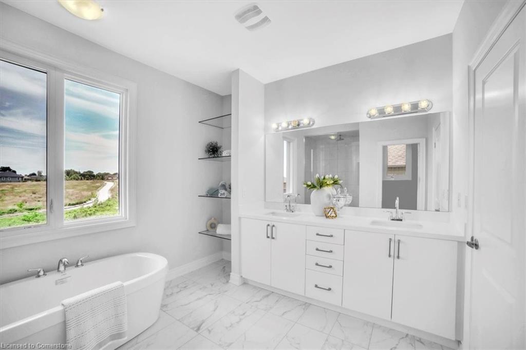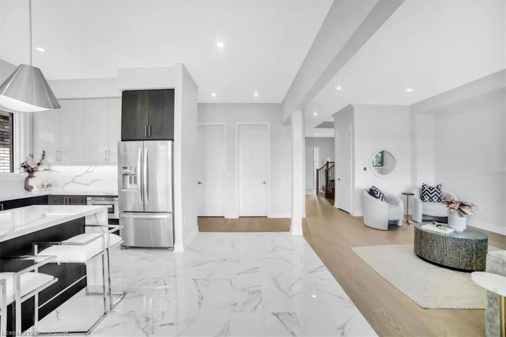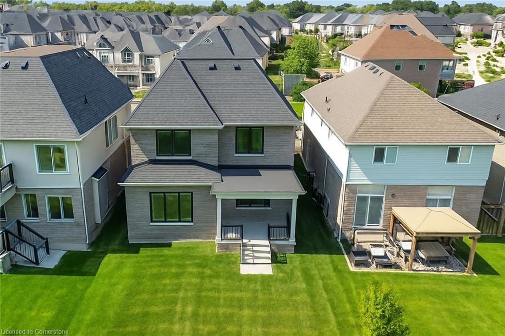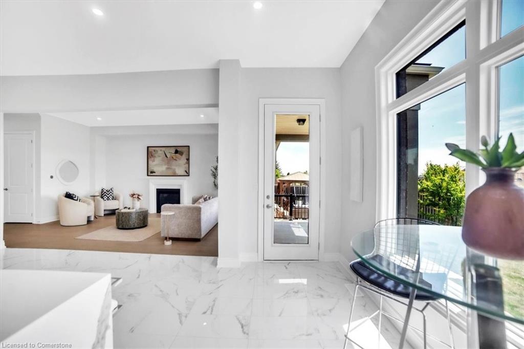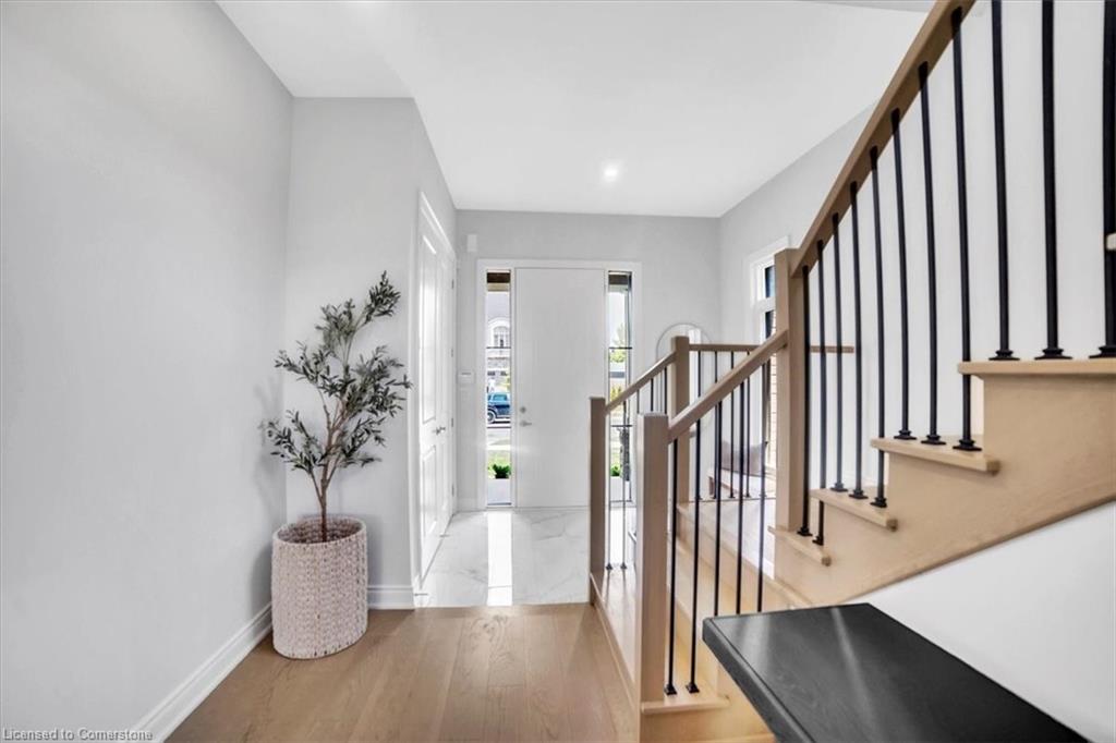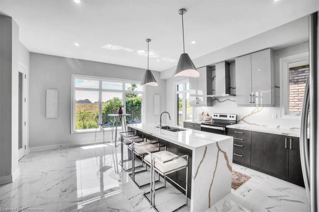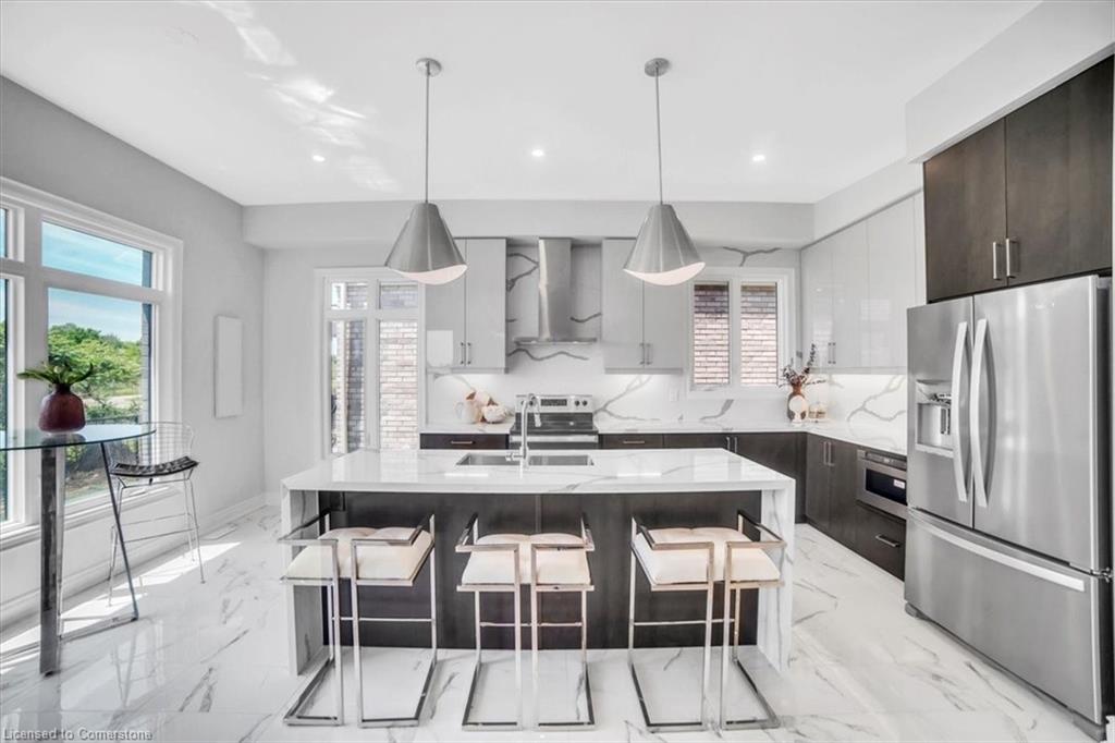 Introducing one of the most distinguished homes in DiCenzo Homes’ sought-after Stonegate Park community—welcome to 87 Aquasanta Crescent. Set on a premium lot backing directly onto a naturalized park and open space, this Capri Grande luxury model is a rare opportunity to own one of Hamilton’s most scenic west mountain homes, where tranquil surroundings and breathtaking sunsets become part of your daily experience. With 2,505 square feet of impeccably designed space, this fully detached home features a 10-foot main floor, smooth ceilings, and a seamless blend of premium porcelain tile and 6-inch oak hardwood flooring. The open-concept layout is anchored by a spacious great room with a linear fireplace and custom lighting, flowing effortlessly into a chef’s kitchen outfitted with two-tone urban cabinetry, taller uppers, pots & pans drawers, deep fridge cabinet, chimney-style hood, stainless steel appliances, and an extended island with integrated sink, recycling drawer, and built-in microwave drawer. A walk-in pantry and main floor laundry complete the convenience. Expansive windows bathe the interior in natural light and draw you toward the covered loggia, perfect for quiet coffee mornings or sunset wine evenings overlooking the natural landscape behind. Upstairs, the oak staircase leads to four spacious bedrooms. Two share a stylish Jack & Jill ensuite, one enjoys its own private ensuite, and the primary suite spans the rear of the home with serene park views, a spa-like ensuite with freestanding tub, glass shower, and private water closet. This home is move-in ready in as little as 30 days and located minutes from amenities, top schools, and major transit routes. Luxury. Nature. Community. This is 87 Aquasanta.